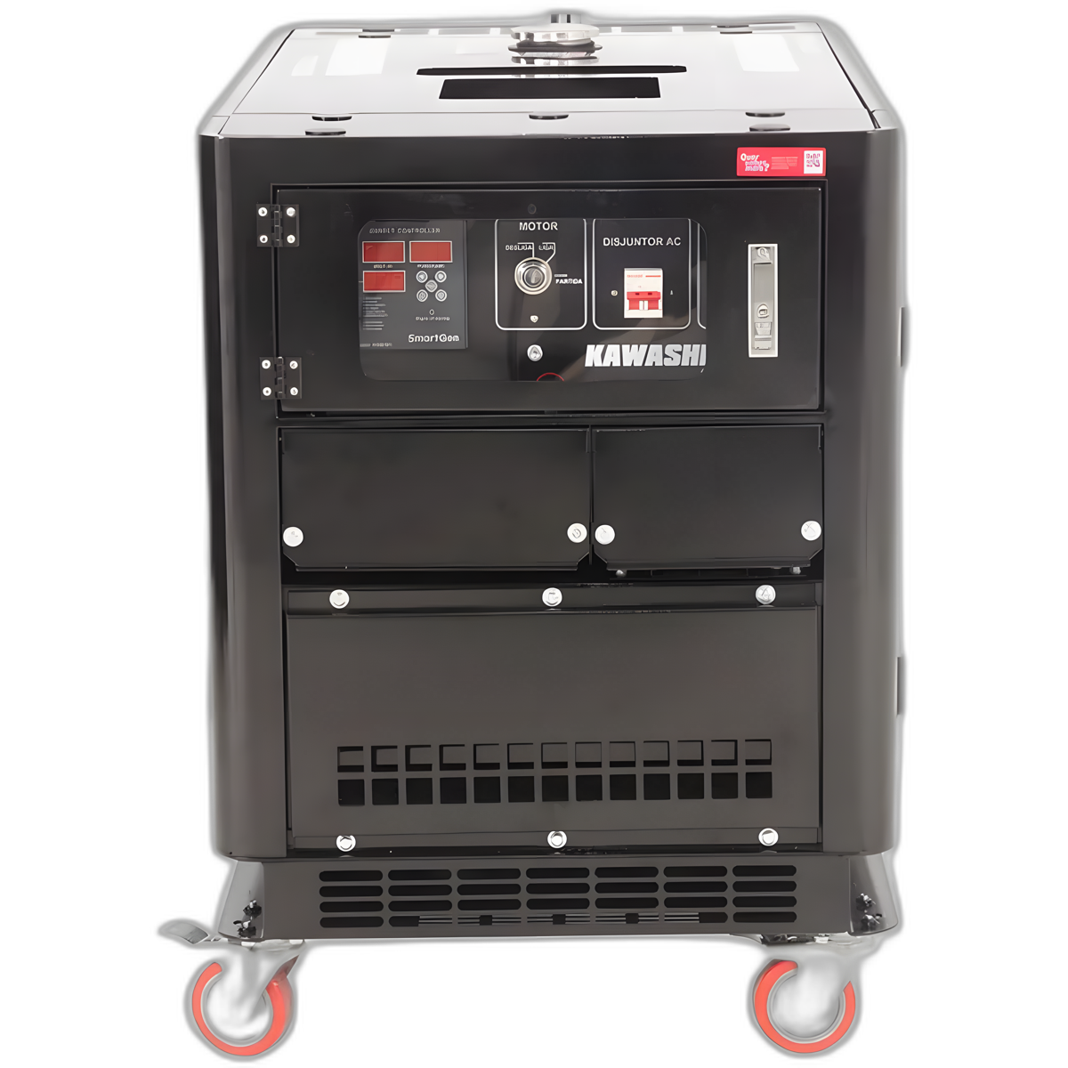 Gerador a Diesel Kawashima DGR-15000: Potência Monofásica Silenciosa para Suas DemandasDescubra a força e a confiabilidade do Gerador a Diesel Kawashima DGR-15000-SS, uma solução robusta e altamente eficiente para todas as suas necessidades de energia. Projetado para oferecer desempenho superior, este gerador monofásico de 14,5 kVA de potência máxima é ideal para uma vasta gama de aplicações, desde o suporte essencial para operações com drones até a alimentação de equipamentos em canteiros de obras, comércios e residências que demandam energia estável e ininterrupta. Sua capacidade de recarga de bateria integrada (12 V - 8,3 A) é um diferencial crucial para profissionais e entusiastas.Equipado com um avançado AVR Digital, o DGR-15000-SS garante uma saída de energia com baixo THD (apenas 5%), protegendo seus aparelhos eletrônicos sensíveis contra flutuações e picos de tensão. O painel de controle multifuncional oferece facilidade de monitoramento, enquanto sua preparação para uso com ATS (Sistema de Transferência Automática) assegura uma transição suave em caso de queda de energia. A construção cabinada é um destaque, reduzindo significativamente o nível de ruído para apenas 80 dB(A) a 7 metros, tornando-o um dos geradores a diesel de alta potência mais silenciosos do mercado. Com motor Kawashima DER 282 V-Twin de 28 HP, partida elétrica e um tanque de 32 litros, este equipamento combina durabilidade, eficiência e conveniência para quem busca uma fonte de energia confiável e de alto desempenho.Especificações Modelo: DGR-15000-SS Potência Máxima: 14500 W / 14,5 kVA Potência Nominal: 13500 W / 13,5 kVA Tensão: Monofásico 230 V / 115 V Frequência: 60 Hz Motor: Kawashima DER 282, dois cilindros (V-Twin), refrigeração a ar, diesel Potência Máxima do Motor: 28 HP Cilindradas: 1247 cc Sistema de Partida: Elétrico Regulador de Tensão: AVR Digital THD (Distorção Harmônica Total): 5% Capacidade do Tanque de Combustível: 32 L Consumo de Combustível: 295 g/kWh Capacidade do Cárter: 2,3 L Óleo de Lubrificação: SAE 20W-40 Carregador de Bateria: Sim (12 V - 8,3 A) Voltímetro: Sim Nível de Ruído [dB(A)@7m]: 80 dB Peso Líquido: 315 kg Peso Bruto: 330 kg Dimensões (LxPxA): 1265 x 675 x 795 mmItens Inclusos 1x Gerador a Diesel Kawashima DGR-15000-SS Monofásico CabinadoPerguntas Frequentes (FAQ) Pergunta: Qual a potência máxima de saída deste gerador?Resposta: A potência máxima é de 14,5 kVA (14500 W) e a potência nominal é de 13,5 kVA (13500 W). Pergunta: Este modelo é silencioso?Resposta: Sim, sendo cabinado, ele possui um baixo nível de ruído de 80 dB(A) a 7 metros, tornando-o adequado para diversos ambientes. Pergunta: O gerador é adequado para carregar baterias?Resposta: Sim, ele vem com um carregador de bateria integrado que oferece 12 V e 8,3 A, ideal para drones e outras aplicações. Pergunta: Qual o tipo de partida e regulador de tensão?Resposta: O sistema de partida é elétrico e ele possui um regulador de tensão AVR Digital, que garante estabilidade e baixo THD. Pergunta: Qual a capacidade do tanque de combustível?Resposta: O tanque de combustível tem capacidade para 32 litros. O consumo é de 295 g/kWh, proporcionando boa autonomia dependendo da carga.