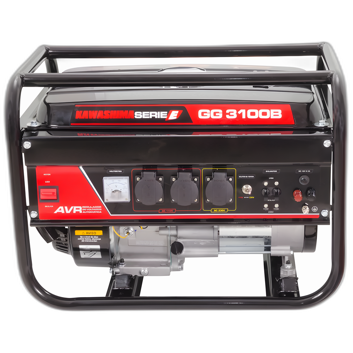 Gerador a Gasolina Kawashima GG 3100-B: Energia Confiável com Partida Manual e AVRGaranta sua energia em qualquer situação com o potente e robusto Gerador a Gasolina Kawashima GG 3100-B. Desenvolvido para oferecer performance superior, este equipamento é a solução ideal para interrupções de energia, atividades em campo, construções ou para alimentar ferramentas e equipamentos em locais sem rede elétrica. Com um motor Kawashima Serie E de 7,0 HP, o GG 3100-B entrega uma potência máxima de 3000 Watts (3,0 kVA) e potência nominal de 2800 Watts (2,8 kVA), suficiente para suprir as necessidades de sua casa, pequeno comércio ou lazer. Sua característica bivolt (115V/230V) e o regulador automático de voltagem (AVR) asseguram uma energia estável e segura para seus eletrônicos sensíveis, protegendo-os contra flutuações e picos de voltagem. A partida manual é simples e confiável, tornando-o fácil de operar sempre que precisar. Equipado com um tanque de combustível de 12 litros, este gerador monofásico oferece uma autonomia considerável, e ainda conta com carregador de bateria e voltímetro integrados para sua conveniência. Escolha a tranquilidade e a eficiência que só um gerador Kawashima pode proporcionar.Especificações Modelo: GG 3100-B Tipo: Monofásico, Bivolt 115V/230V, com AVR Capacidade do tanque de combustível: 12 L Carregador de bateria: Sim Cilindradas: 208 cc Consumo de combustível: 390 g/kWh Dimensões (AxLxP): 605 x 445 x 450 mm Frequência: 60 Hz Motor: Kawashima Serie E, Monocil., 4T, refrig. ar, OHV, gasolina Nível de ruído: 96 dB (A) Peso líquido: 37 kg Potência máxima do motor: 7,0 HP Potência máxima: 3000 W / 3,0 kVA Potência nominal: 2800 W / 2,8 kVA Sistema de partida: Manual Voltímetro: SimItens Inclusos Gerador a gasolina Kawashima GG 3100-BPerguntas Frequentes (FAQ) Pergunta: Qual a potência máxima e nominal deste gerador?Resposta: A potência máxima é de 3000 W (3,0 kVA) e a potência nominal é de 2800 W (2,8 kVA). Pergunta: Este gerador é bivolt?Resposta: Sim, ele é bivolt, operando em 115V e 230V, e conta com AVR para estabilizar a energia. Pergunta: O gerador Kawashima GG 3100-B possui carregador de bateria?Resposta: Sim, este modelo vem com carregador de bateria integrado. Pergunta: Qual a capacidade do tanque de combustível?Resposta: O tanque de combustível possui capacidade de 12 litros, oferecendo boa autonomia. Pergunta: Qual o tipo de partida deste gerador?Resposta: A partida é manual, projetada para ser simples e confiável.