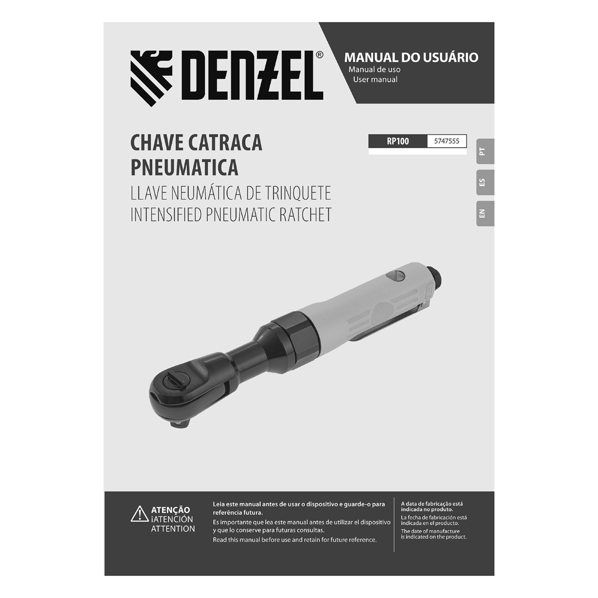 Catraca Pneumática Reforçada 1/2" 160 RPM 100Nm Denzel RP100