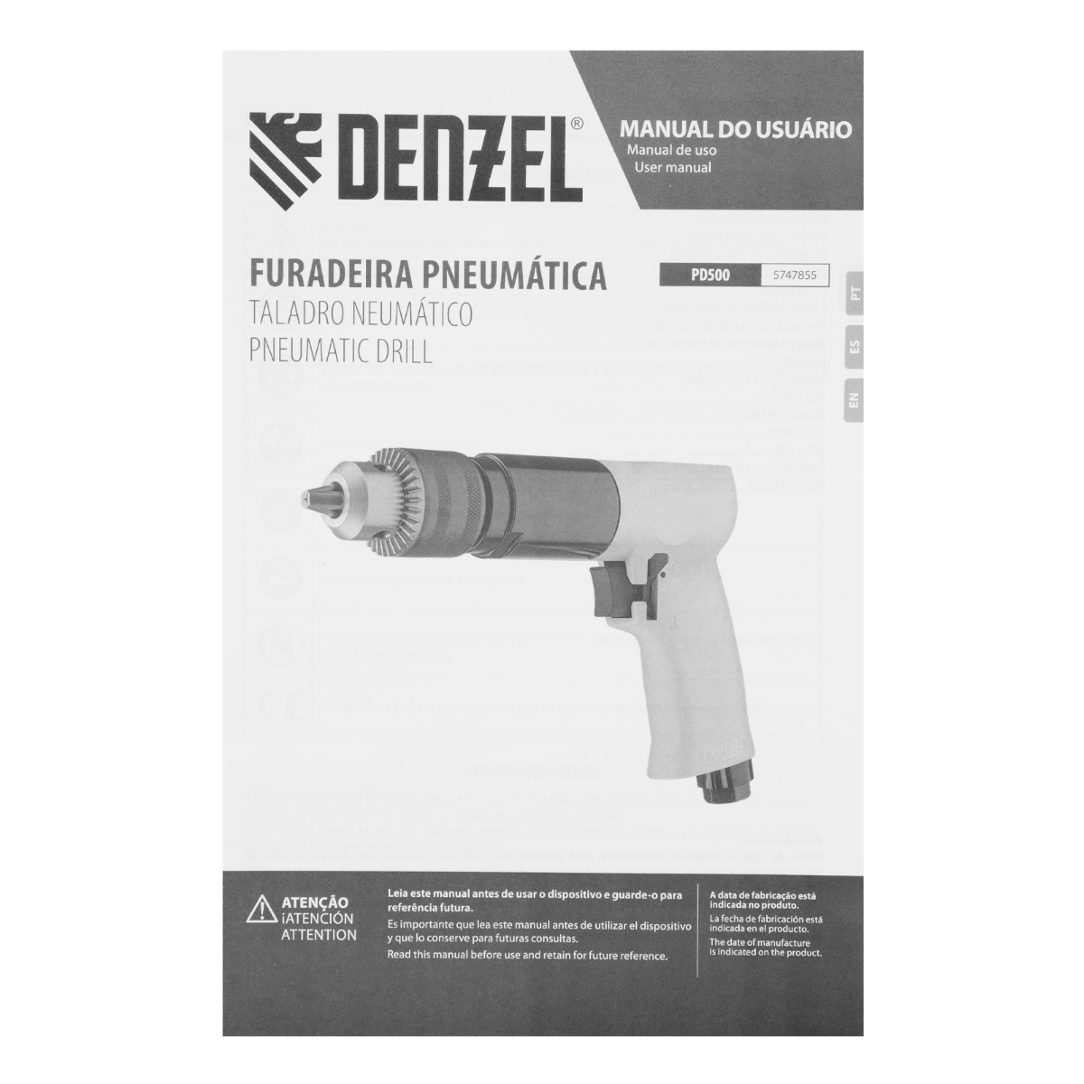 Furadeira Pneumática Denzel PD500: Potência e Versatilidade para Seus ProjetosA Furadeira Pneumática Denzel PD500 5747855 é a solução ideal para quem busca desempenho e confiabilidade em tarefas de perfuração e fixação. Projetada para trabalhar em diversos materiais como madeira, metal e plástico, além de auxiliar na remoção e instalação de parafusos, esta ferramenta é perfeita para profissionais da construção, montagem, manutenção automotiva, oficinas e para o uso doméstico. Com uma velocidade de 500 rpm e consumo de ar de 114 L/min, a PD500 garante eficiência e constância em suas aplicações. Para otimizar a vida útil da ferramenta, recomenda-se o uso de óleo especial ISO 46, que pode ser adicionado diretamente ou através de um bloco de preparação de ar Denzel. Sua construção em alumínio oferece resistência a impactos, cargas e corrosão, assegurando durabilidade e um longo tempo de serviço. A alça lateral giratória e ajustável proporciona maior conforto e controle durante o uso, enquanto o mandril de chave de catraca permite a troca rápida e segura de brocas de 1,5 a 13 mm. Invista na Furadeira Pneumática Denzel PD500 e eleve a qualidade dos seus projetos!Especificações Tipo de furadeira: pneumática Diâmetro da conexão de ar: 1/4\" Material do corpo: alumínio Número de modos de operação: 2 (frente e reversa) Velocidade de rotação: 500 rpm Consumo de ar: 114 L/min Pressão máxima: 6,3 bar Tamanho do mandril: 13 mmItens Inclusos Furadeira Pneumática Denzel PD500 Adaptador para conexão de mangueira Chave para o mandrilPerguntas Frequentes (FAQ) Pergunta: Qual o tipo de conexão de ar da furadeira?Resposta: A furadeira possui conexão de ar de 1/4\". Pergunta: Qual o material do corpo da furadeira?Resposta: O corpo da furadeira é fabricado em alumínio, garantindo resistência e durabilidade. Pergunta: A furadeira possui função reversa?Resposta: Sim, a furadeira possui função de rotação reversa, facilitando a remoção de parafusos e brocas. Pergunta: Qual o tamanho máximo da broca que pode ser utilizada?Resposta: O mandril aceita brocas de até 13 mm. Pergunta: É necessário utilizar óleo lubrificante?Resposta: Sim, recomenda-se o uso de óleo especial ISO 46 para manter a furadeira em ótimo estado de funcionamento.