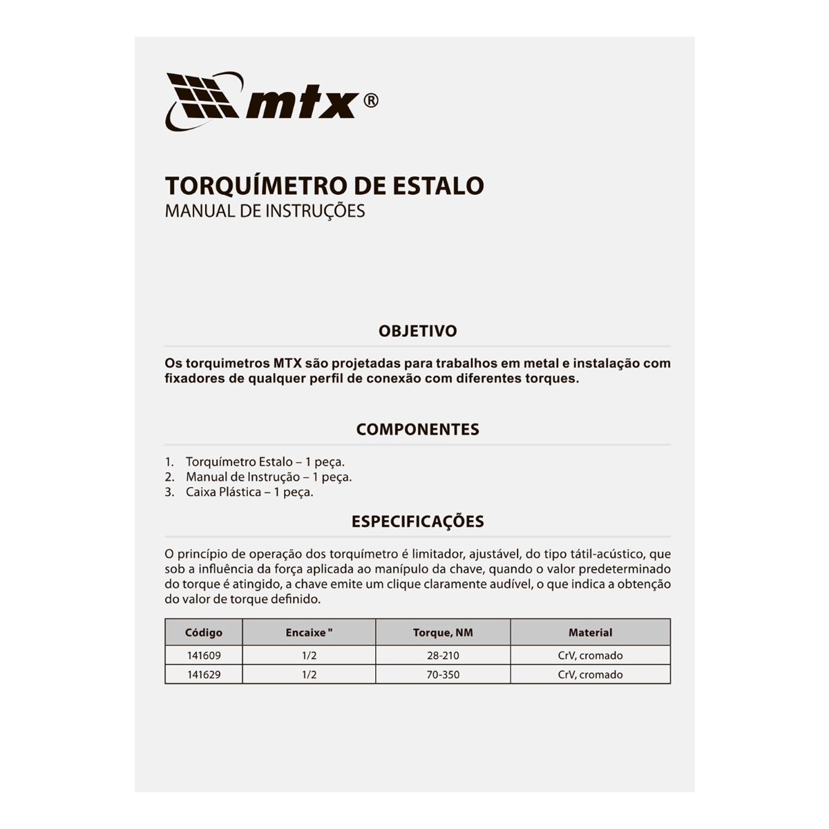 Torquímetro de Estalo 1/2" 70-350Nm Aço Cromo Vanádio MTX 141629