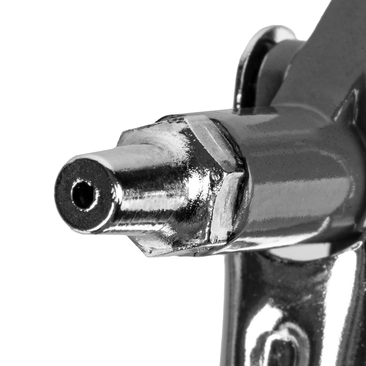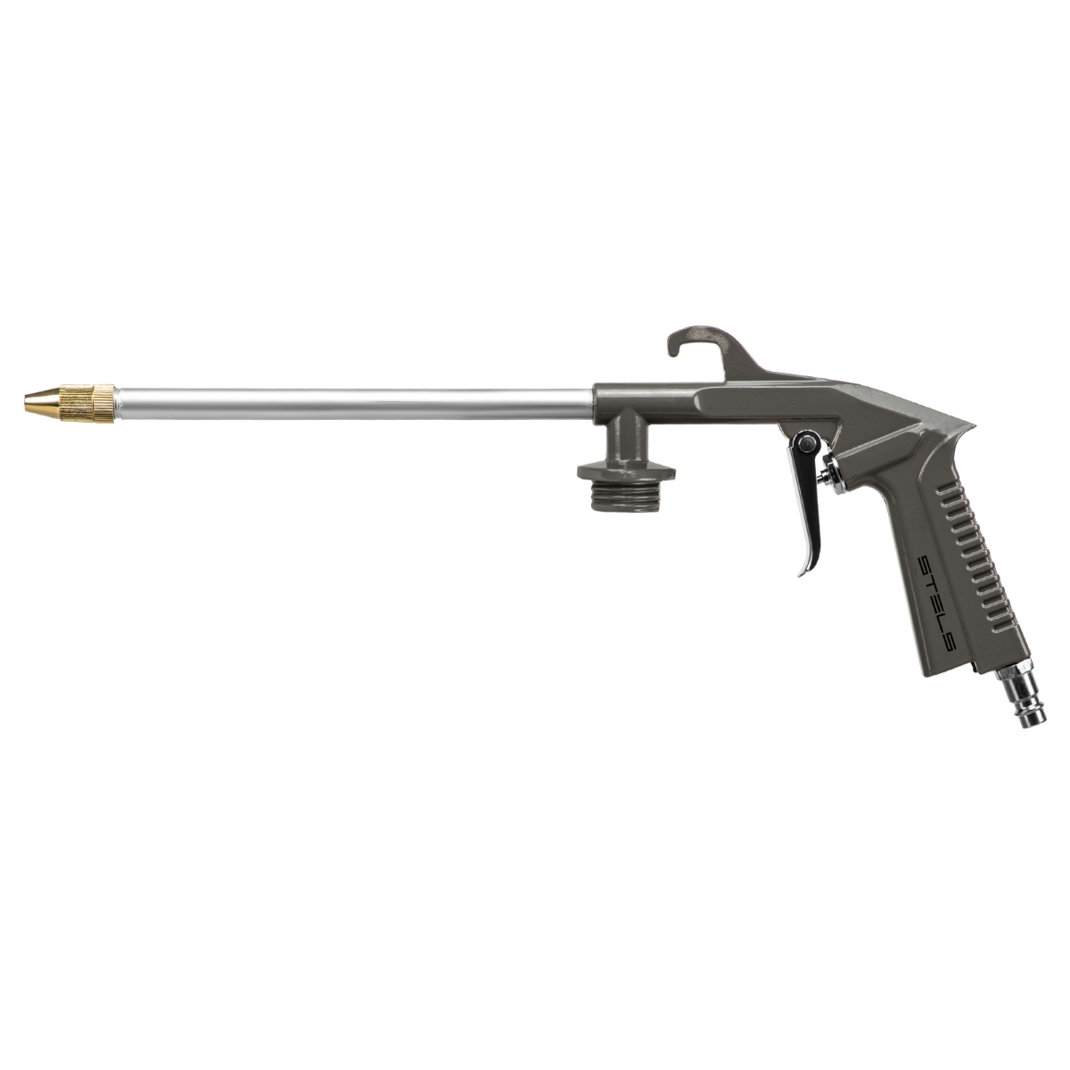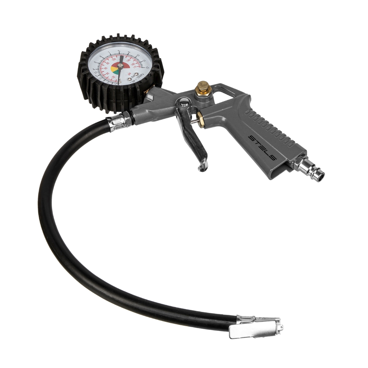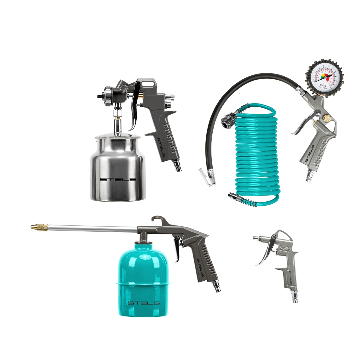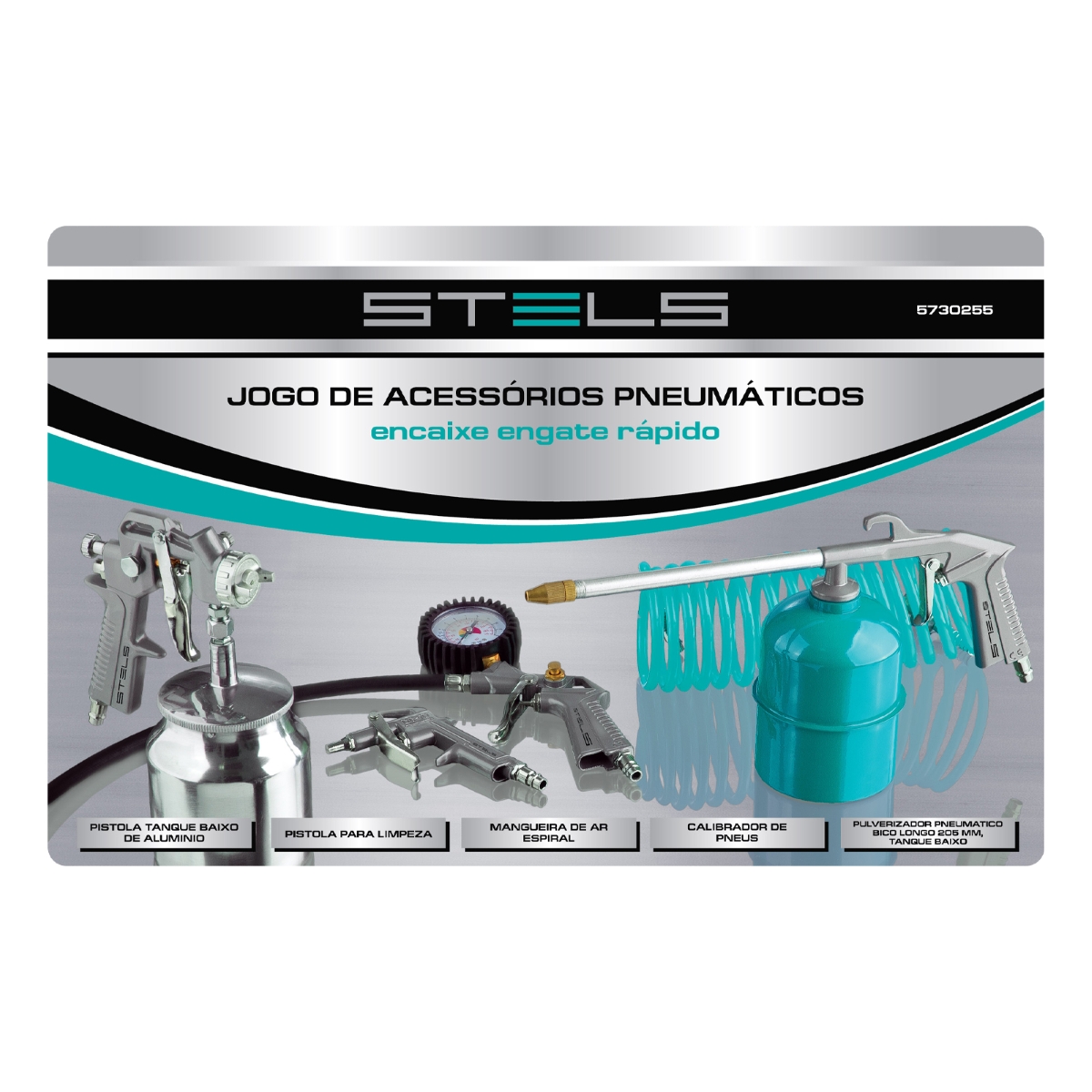 Jogo de Acessórios Pneumáticos Stels com Engate Rápido – Eficiência e Versatilidade O Jogo de Acessórios Pneumáticos Stels 5730255 é a solução completa para quem busca desempenho e praticidade em ferramentas pneumáticas. Este kit de 5 peças, com conexões de 1/4\", oferece uma gama de aplicações, desde a pintura automotiva até a limpeza detalhada e a manutenção de pneus. Ideal para profissionais e entusiastas, este conjunto garante eficiência, precisão e durabilidade em cada tarefa. Inclui uma pistola de enchimento de pneus com manômetro, pistolas de limpeza e lavagem, um pulverizador de tinta com tanque inferior de 0,75 litros e bico de 1,5 mm, e uma mangueira com conexão rápida, compatíveis com todos os tipos de compressores. A construção em metal e alumínio assegura resistência e longa vida útil, mesmo em ambientes de trabalho exigentes. O pulverizador HVLP (Alto Volume, Baixa Pressão) otimiza o consumo de tinta, proporcionando um acabamento profissional com menos desperdício. A pistola de limpeza com bico alongado facilita o acesso a áreas difíceis, enquanto a mangueira flexível e o conector de desconexão rápida garantem agilidade e conforto durante o uso. Especificações Diâmetro da conexão de ar: 1/4\" Material do corpo: Alumínio Número de modos de operação: 1 Tipo de conexão: Roscado NPT Consumo de ar: 226 L/min Pressão máxima: 8 bar Volume do tanque do pulverizador: 0.75 litros Itens Inclusos Jogo de Acessórios Pneumáticos Stels 5730255 Perguntas Frequentes (FAQ) Pergunta: Este jogo de acessórios é compatível com qual tipo de compressor?Resposta: Este conjunto é compatível com todos os tipos de compressores que utilizam conexões de 1/4\". Pergunta: Qual o tipo de pintura ideal para o pulverizador?Resposta: O pulverizador é adequado para tintas à base de solvente e água, proporcionando um acabamento de alta qualidade. Pergunta: A pistola de enchimento possui algum dispositivo de segurança?Resposta: Sim, a pistola de enchimento possui uma válvula de segurança integrada para evitar a pressão excessiva.