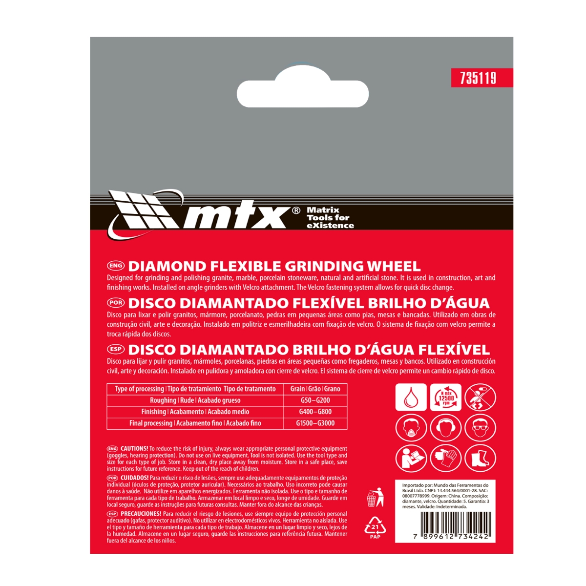 Disco de Lixa Diamantada Flexível 100mm 800 Graus 5Pç MTX para Acabamento Impecável Obtenha um acabamento de qualidade profissional com o Disco de Lixa Flexível Diamantada MTX 735119. Ideal para lixamento úmido de granito, pedra, cerâmica e mármore, este disco de 100mm com granulometria P 800 garante suavidade excepcional em superfícies, perfeito para os estágios finais de acabamento. Sua composição com termoplástico verde claro revestido com diamante permite o uso em diversos materiais, incluindo cores e pretos, sem danificar a superfície. A flexibilidade do disco se adapta a relevos e contornos complexos, proporcionando um resultado uniforme e meticuloso. Projetado para uso com rebarbadoras, requer um prato de apoio específico para discos de lixa flexíveis de diamante, garantindo instalação rápida e segura. A alta durabilidade, proporcionada pelas partículas de diamante de alta concentração e ligação termoplástica resistente, assegura um desempenho consistente. Os sulcos na superfície evitam o entupimento por resíduos, mantendo a eficiência do lixamento. A fixação por fecho de contato permite trocas rápidas, otimizando o tempo de trabalho. A embalagem com 5 unidades oferece praticidade e economia para projetos de longa duração. Especificações Granulometria: P 800 Material do abrasivo: diamante Diâmetro: 100 mm Espessura: 5 mm Altura do segmento: 3 mm País de fabricação: China Itens Inclusos 5 Discos de Lixa Diamantada Flexível 100mm 800 Graus MTX Perguntas Frequentes (FAQ) Pergunta: Para quais materiais este disco é adequado?Resposta: Este disco é ideal para lixamento úmido de granito, pedra, cerâmica e mármore. Pergunta: Qual o tipo de fixação do disco?Resposta: O disco possui fixação por fecho de contato, permitindo uma troca rápida e fácil. Pergunta: Este disco pode ser usado em rebarbadoras?Resposta: Sim, este disco é projetado para uso com rebarbadoras, mas requer um prato de apoio específico para discos de lixa flexíveis de diamante. Pergunta: Qual a garantia do produto?Resposta: Garantia legal: 90 dias