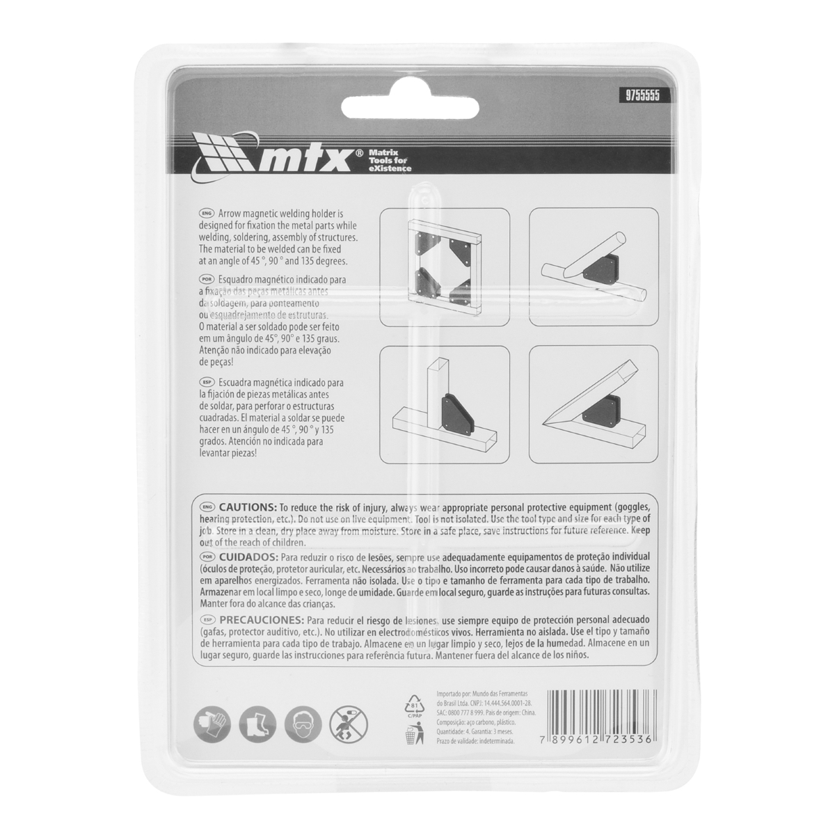 Jogo de Esquadro Magnético para Soldador 9 Libras – Precisão e Eficiência na Montagem O Jogo de 4 Esquadros Magnéticos MTX 9755555 é a solução ideal para quem busca precisão e praticidade na montagem de estruturas metálicas. Projetado para fixar peças de até 4 kg (9 libras), este conjunto permite realizar soldagens e brasagens de forma independente, otimizando o tempo e garantindo resultados impecáveis. Sua versatilidade se destaca na capacidade de criar ângulos precisos de 45°, 90° e 135° simultaneamente, facilitando a montagem de diversas estruturas. Fabricado em aço carbono resistente, este jogo de esquadros magnéticos oferece durabilidade e confiabilidade, mesmo em ambientes de trabalho exigentes. Ideal para profissionais e entusiastas do 'faça você mesmo', o Jogo de Esquadros Magnéticos MTX é uma ferramenta indispensável para quem busca qualidade e eficiência em seus projetos de soldagem e montagem. Especificações Material: Aço Carbono Ângulos de Aplicação: 45°, 90°, 135° Capacidade de Fixação: Até 4 kg (9 Libras) Quantidade no Conjunto: 4 peças Dimensões: 55 x 60 x 12 mm Itens Inclusos Jogo de Esquadro Magnético para Soldador MTX (4 peças) Perguntas Frequentes (FAQ) Pergunta: Qual o peso máximo que cada esquadro suporta?Resposta: Cada esquadro suporta até 1 kg, totalizando 4 kg para o conjunto. Pergunta: Os esquadros são resistentes a quedas?Resposta: Sim, os esquadros são construídos em aço carbono resistente e projetados para não deformar em caso de quedas, garantindo durabilidade. Pergunta: Como devo limpar os esquadros após o uso?Resposta: Basta remover a sujeira dos fixadores com uma escova após o trabalho de soldagem. Pergunta: Qual a garantia do produto?Resposta: Garantia legal: 90 dias