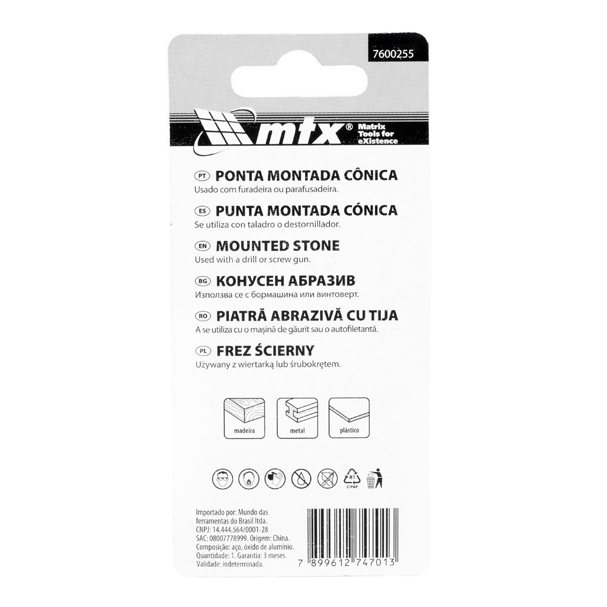 Ponta Montada Cônica MTX: Precisão e Acesso em Áreas Difíceis A Ponta Montada Cônica MTX 7600255, com dimensões de 10 x 19 mm e haste de 3 mm, é a solução ideal para quem precisa de eficiência na limpeza de furos, remoção de rebarbas e acabamento de superfícies. Projetada para oferecer acesso a áreas de difícil alcance, esta ponta cônica é perfeita para trabalhos detalhados em metal, plástico e materiais minerais. Seu abrasivo de óxido de alumínio garante um processamento rápido e eficaz, enquanto a granulometria F80 proporciona uma retificação grosseira de alta performance. Seja para uso profissional ou doméstico, a Ponta Montada Cônica MTX otimiza seus projetos, garantindo resultados de qualidade com facilidade e precisão. O conjunto com 200 peças oferece excelente custo-benefício e durabilidade para suas tarefas de acabamento. Especificações Diâmetro da haste: 3 mm Profundidade máxima de perfuração: 10 mm Dimensões: 10 x 19 mm Abrasivo: Óxido de Alumínio Granulometria: F80 Itens Inclusos 200 Pontas Montadas Cônicas MTX 7600255 Perguntas Frequentes (FAQ) Pergunta: Para quais materiais esta ponta é adequada?Resposta: A Ponta Montada Cônica MTX é ideal para superfícies metálicas, plástico e materiais minerais. Pergunta: Qual o significado da granulometria F80?Resposta: F80 indica um grão médio, eficaz para a retificação grosseira de peças, proporcionando resultados rápidos e eficientes. Pergunta: Esta ponta é compatível com quais ferramentas?Resposta: A ponta é compatível com furadeiras e parafusadeiras. Pergunta: Qual a garantia do produto?Resposta: Garantia legal: 90 dias
