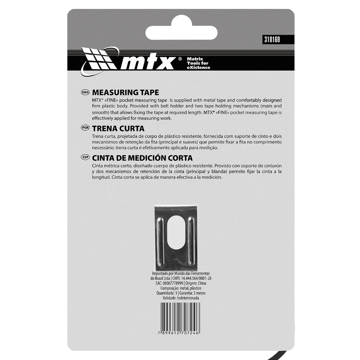 Trena Curta 3m: Precisão e Durabilidade para Suas Medidas A Trena Curta Fine MTX 310169 é a ferramenta essencial para quem busca medições exatas e confiáveis. Ideal para profissionais da construção civil, marceneiros, arquitetos e também para o uso doméstico em projetos 'faça você mesmo'. Com 3 metros de comprimento e 16mm de largura, esta trena oferece a combinação perfeita de portabilidade e precisão. Sua caixa em plástico ABS resistente garante durabilidade, mesmo em ambientes de trabalho exigentes, protegendo a fita de aço contra danos. O gancho fixo com três rebites assegura que a trena permaneça estável durante a medição, evitando deslizamentos e garantindo resultados consistentes. A alça integrada permite fácil transporte e armazenamento, mantendo a trena sempre à mão quando você mais precisar. Invista em uma ferramenta que eleva a qualidade e a eficiência dos seus projetos! Especificações Comprimento: 3 m Largura da fita: 16 mm Material da fita: Aço Material do corpo: Plástico ABS País de fabricação: China Itens Inclusos Trena Curta 3m 16mm Plástico ABS Fine MTX 310169 Perguntas Frequentes (FAQ) Pergunta: Qual o material da caixa da trena?Resposta: A caixa da trena é fabricada em plástico ABS, um material conhecido por sua alta resistência a impactos. Pergunta: A trena possui algum tipo de trava?Resposta: Sim, a trena possui um freio e botão de pausa para fixação da fita, facilitando a realização de medições precisas. Pergunta: Qual a precisão da trena?Resposta: A trena possui classe de precisão 2, que é a mais comum no mercado, com divisões de 1 mm. Pergunta: Qual a garantia do produto?Resposta: Garantia legal: 90 dias