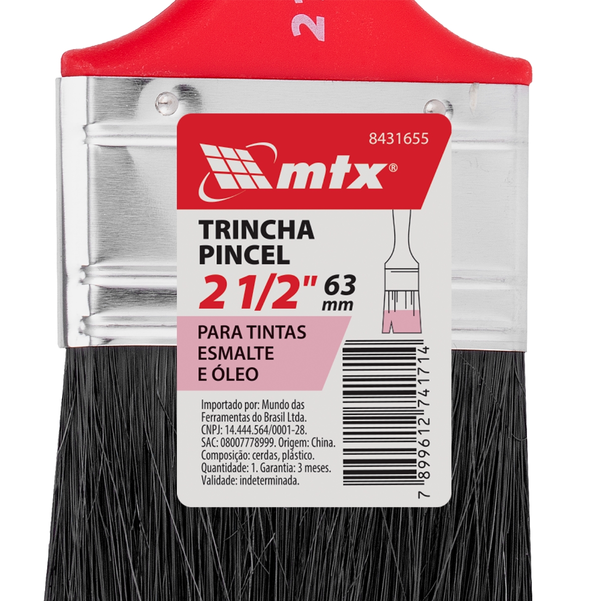 Trincha/Pincel 2 1/2' para Tintas Esmalte e Óleo: Acabamento Impecável Obtenha um acabamento profissional em seus projetos de pintura com a Trincha/Pincel 2 1/2' da MTX. Projetada para tintas esmalte e óleo, esta trincha combina cerdas pretas de alta qualidade com um cabo plástico ergonômico, proporcionando controle e conforto superiores durante o uso. Ideal para trabalhos em madeira, metal e outras superfícies, garante uma aplicação uniforme da tinta, minimizando o desperdício e otimizando o resultado final. Seja para projetos domésticos ou profissionais, este pincel é a ferramenta perfeita para quem busca precisão, durabilidade e eficiência. Sua construção robusta e facilidade de limpeza garantem que ele seja um aliado confiável em todas as suas necessidades de pintura. Invista em qualidade e transforme seus projetos com a Trincha/Pincel MTX. Especificações País de Fabricação: China Tamanho: 2 1/2' Tipo de Cerdas: Pretas Tipo de Cabo: Plástico Itens Inclusos 1 Trincha/Pincel 2 1/2' MTX Perguntas Frequentes (FAQ) Pergunta: Para quais tipos de tinta este pincel é adequado?Resposta: Este pincel é ideal para tintas esmalte e óleo. Pergunta: O cabo é confortável para longos períodos de uso?Resposta: Sim, o cabo plástico é ergonômico, projetado para proporcionar conforto e reduzir a fadiga durante longas sessões de pintura. Pergunta: Este pincel é fácil de limpar?Resposta: Sim, a trincha é fácil de limpar, garantindo sua durabilidade e reutilização em diversos projetos. Pergunta: Qual a garantia do produto?Resposta: Garantia legal: 90 dias