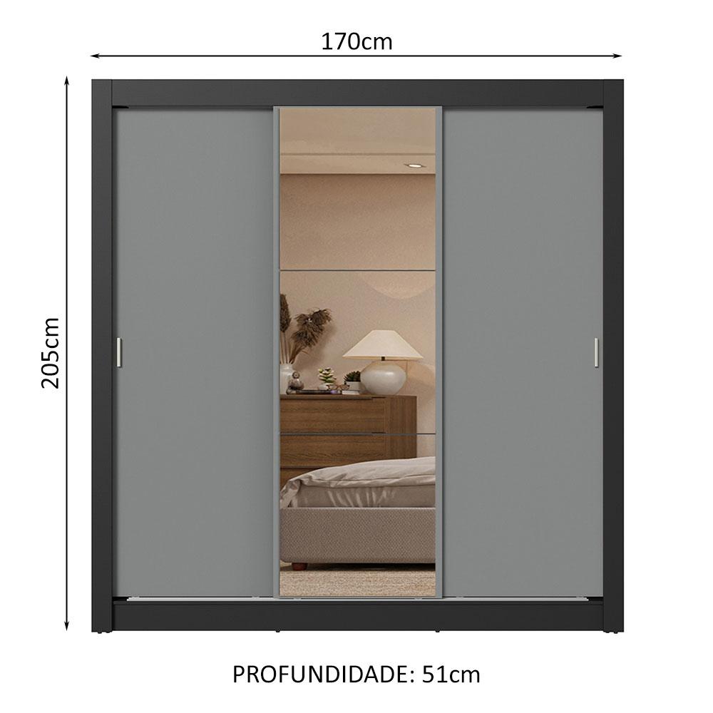 Guarda-Roupa Casal 3 Portas de Correr com Espelho 2 Gavetas Preto/Cinza Sublime Madesa