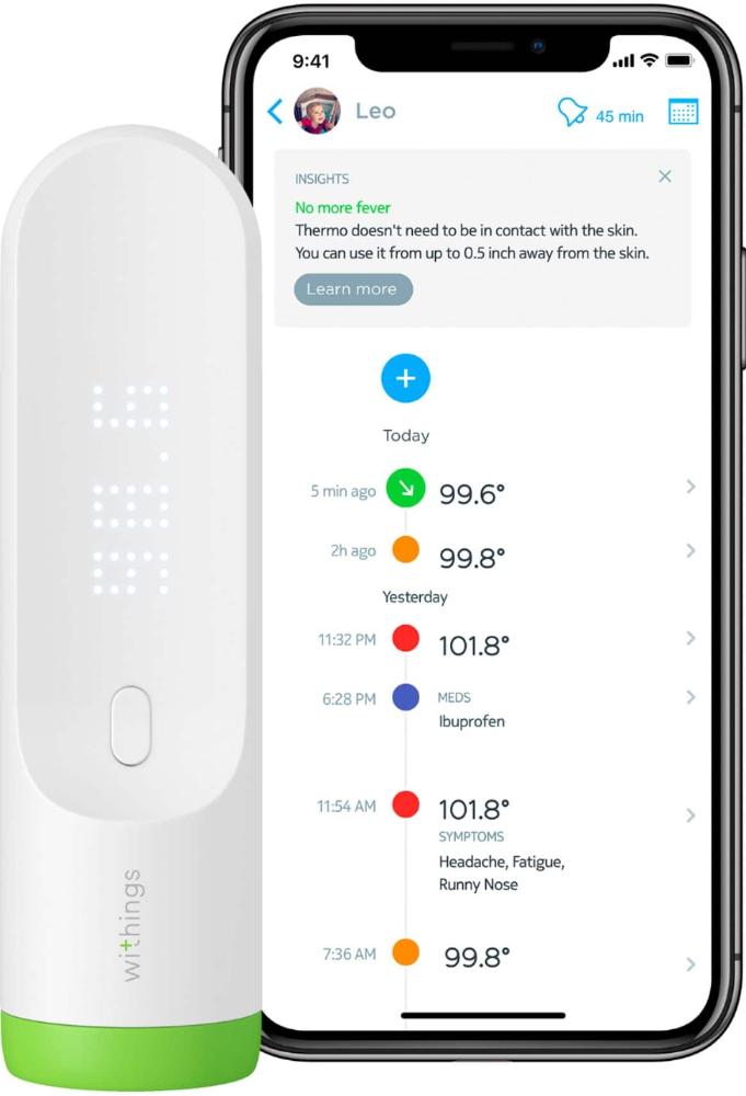 Thermo é um termômetro qualificado pela FDA e aprovado pela FSA/HSA/HRA que pode realizar leituras de temperatura precisas e sem contato em segundos. Basta pressionar o botão e passar o dispositivo pela testa para ativar a tecnologia Withings HotSpot Sensor. A tecnologia HotSpot Sensor usa 16 sensores infravermelhos para realizar mais de 4.000 medições na artéria temporal para leituras precisas e precisas. Segundos depois de fazer uma leitura, o display LED do Thermo fornecerá feedback codificado por cores e fácil de ler diretamente na tela. As leituras também serão sincronizadas automaticamente com o aplicativo Withings via Wi-Fi ou Bluetooth, para que você possa rastrear medições, receber lembretes, inserir sintomas/medicamentos relacionados e enviar leituras diretamente a um médico por meio de relatórios em PDF para download.
