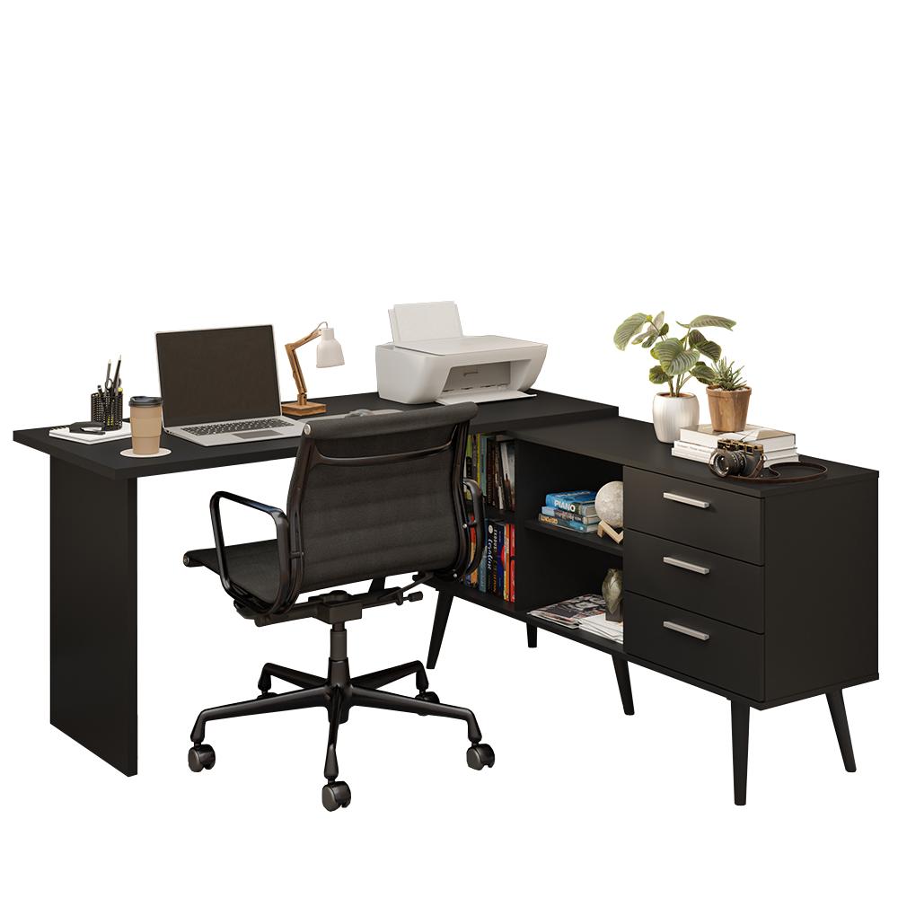 Escrivaninha Mesa de Escritório de Canto 3 Gavetas Preto Lisboa Madesa