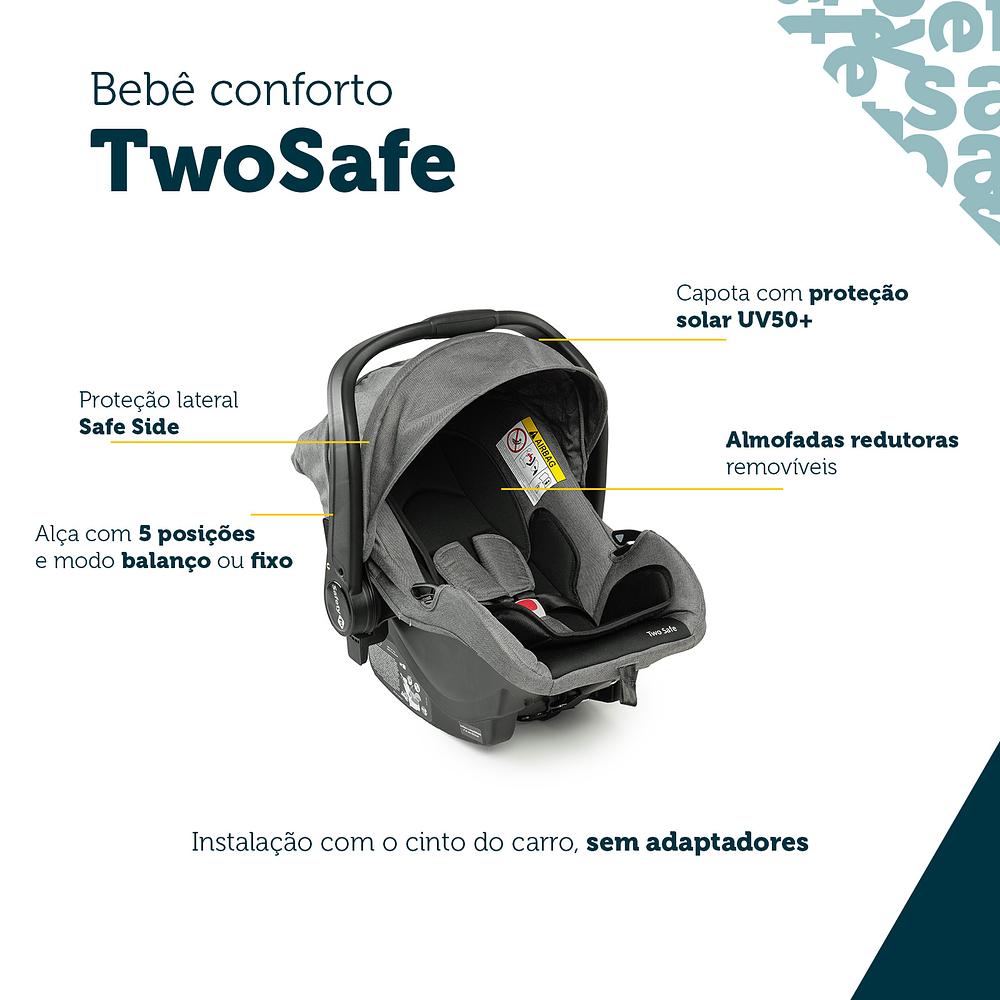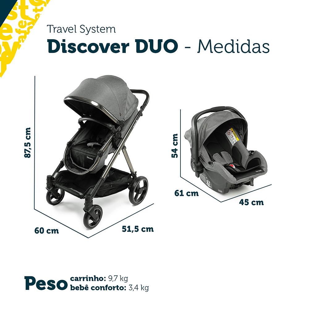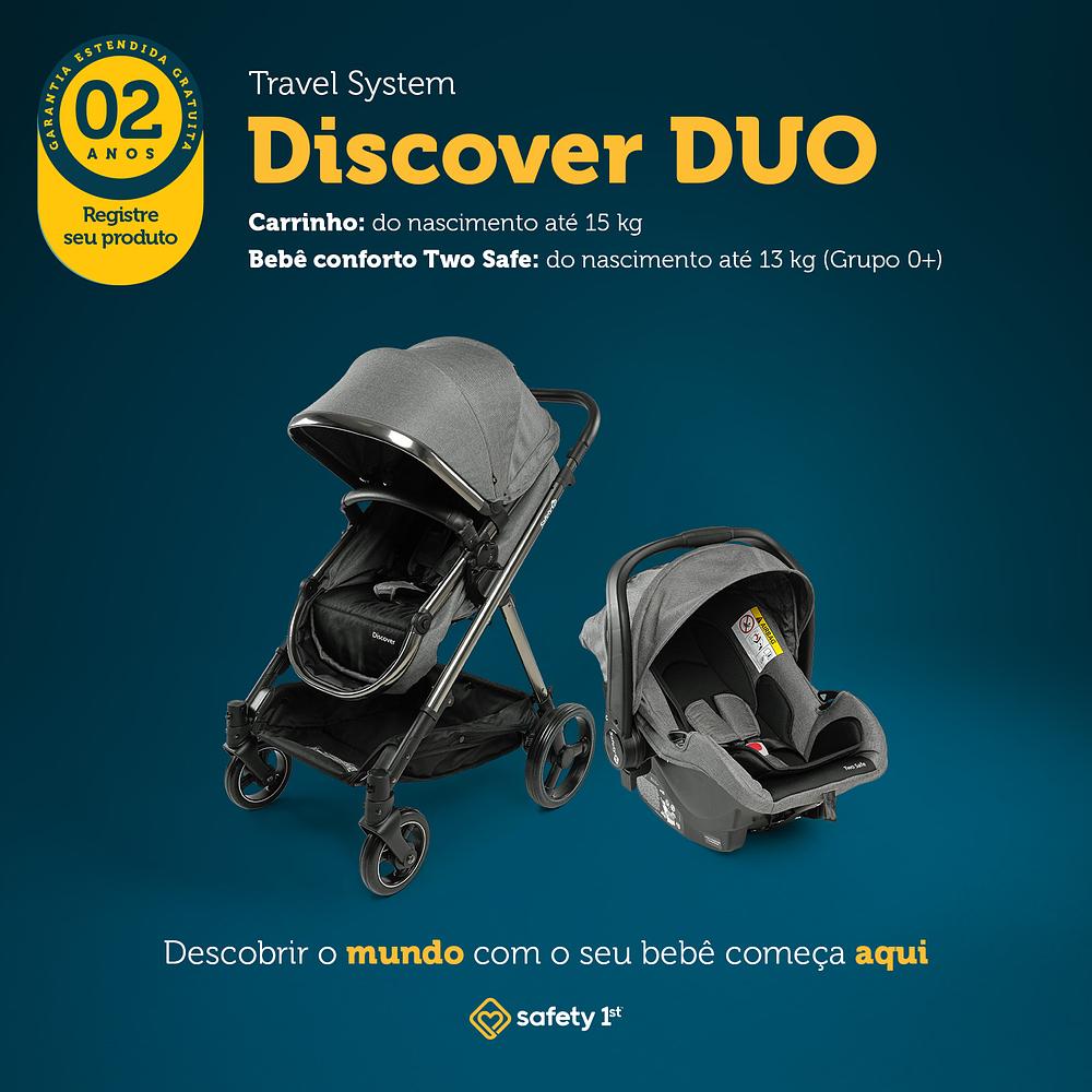 Carrinho com Bebê Conforto Travel System Discover Duo - Safety 1stO Travel System Discover Duo da Safety 1st é a escolha perfeita para quem busca praticidade e segurança desde o nascimento. Combinando carrinho e bebê conforto, ele está pronto para acompanhar todas as aventuras da sua família!Características: • Indicação: Desde o nascimento até aproximadamente 4 anos. • Assento Moisés: Transformável e reversível, ideal para proximidade nos primeiros meses ou autonomia mais tarde. • Fechamento Compacto: Tipo envelope, leve e fácil de manusear. • Capota com Proteção UV50+: Visor peek-a-boo incluído, oferecendo mais conforto e segurança ao ar livre. • Sistema Seguro: Assento do bebê conforto com proteção lateral Safe Side e almofadas redutoras removíveis. • Alça Adaptável: 5 posições, podendo ser utilizada fixa ou no modo balanço. • Instalação Simplificada: Não necessita de adaptadores; usa cinto de segurança do carro.Especificações Técnicas: • Tipo: Carrinho e bebê conforto travel system • Fechamento: Tipo envelope • Capota: UV50+ com visor • Assento: Converte em moisés e é reversível • Cinto de Segurança: 5 pontos com ajuste e protetores acolchoados • Rodas: Suspensão dianteira e traseira para condução suave • Peso do Produto: 11 kg (carrinho) / 3,5 kg (bebê conforto) • Dimensões do Carrinho: 87 x 57 x 106 cm • Dimensões do Bebê Conforto: 63 x 43 x 55 cm • Certificação INMETRO: Normas de Segurança ABNT NBR 14.389 para até 15 kg •Garantia do fornecedor: 12 meses. Escolha o Travel System Discover Duo da Safety 1st e garanta praticidade e segurança em todos os passeios com seu bebê. Aproveite e transforme cada momento em uma nova descoberta!
