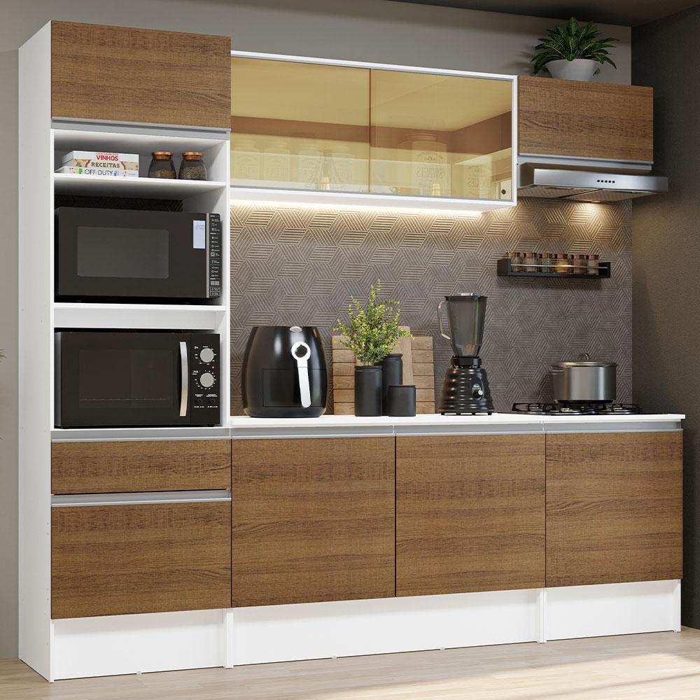 A Cozinha Completa Diamante da Madesa é moderna e foi pensada nos mínimos detalhes para agregar mais praticidade ao seu dia a dia.Contempla o tampo do balcão de pia, que pode ser removido para a colocação de uma pia com as medidas de até 120 cm x 52 cm. Já o balcão para cooktop possui 60 cm x 52 cm e segue com tampo, que pode ser recortado para a colocação do cooktop. Possui pés reguláveis e rodapés fixos para uma melhor sustentação.Destaque especial para as portas em vidro reflex do aéreo maior, que contém uma camada de micropartículas que mudam de acordo com a iluminação do ambiente. Assim, podem revelar sutilmente o interior do móvel ou refletir o espaço, conferindo muito mais charme na decoração do seu ambiente.O acabamento da estrutura interna e externa é branco. As portas e a frente da gaveta são no padrão amadeirado Rustic. Todos os acabamentos são em Pintura Poliéster de alta resistência que, além de facilitar a limpeza, confere beleza e praticidade ao móvel.Medidas:- 240 cm de largura- 52 cm de profundidade no balcão e na torre e 31 cm nos aéreos- 210 cm de alturaItens inclusos:- Uma (1) torre com nichos para forno e micro-ondas com uma (1) gaveta e duas (2) portas, sendo uma basculante- Um (1) balcão de pia de 120 cm com duas (2) portas- Um (1) tampo de madeira branco para balcão de pia de 120 cm x 52 cm- Um (1) aéreo de 120 cm com portas deslizantes em vidro reflex- Um (1) balcão de 60 cm com uma (1) porta e tampo- Um (1) aéreo de 60 cm com porta basculanteCódigo do produto: G20088095ZRFObs.:- Imagens meramente ilustrativas- É obrigatório fixar a torre quente na parede- A Madesa não disponibiliza serviço de montagem- O produto segue com manual de instalação e todas as ferragens necessárias para sua montagem1-O produto é novo ou usado?R.: Todos os produtos da Madesa são novos, enviados da nossa fábrica diretamente para as casas de nossos clientes.2-O produto vem montado? Se não, vocês realizam a montagem?R.: A Madesa não disponibiliza serviço de montagem. Todos os produtos seguem com manual de instalação e as ferragens necessárias. Alguns produtos possuem vídeo explicando o passo a passo da montagem.3-Vocês possuem loja física? Posso retirar meu produto em mãos?R.: Não possuímos loja física, apenas loja virtual. Confira as opções de envio ao colocar o seu CEP.4-Qual é o valor do envio? Posso pagar separadamente?R.: O valor do envio é calculado com base no peso e volume do produto, e no CEP de destino. Você pode calcular o valor e prazo de entrega no simulador.5-A Madesa entrega em todo Brasil? Como é feita a entrega?R.: Sim, entregamos no Brasil inteiro através de transportadoras parceiras.6-O produto acompanha Nota Fiscal?R.: Sim, todos os produtos são entregues com suas respectivas notas fiscais.7-Os produtos possuem garantia?R.: Sim. A Madesa oferece 3 meses de garantia para defeitos de fabricação.A Madesa se dedica à sustentabilidade com várias iniciativas: temos uma usina própria para gerar energia que abastece uma de nossas fábricas. Selecionamos nossos fornecedores, priorizando aqueles que possuem um compromisso com a sustentabilidade e proteção do meio ambiente. Todo o plástico utilizado no setor produtivo é proveniente de reciclagem e as suas sobras são encaminhadas ao fornecedor que os recicla. Também investimos no desenvolvimento contínuo de nossos colaboradores e em ações educacionais que beneficiem a comunidade.
