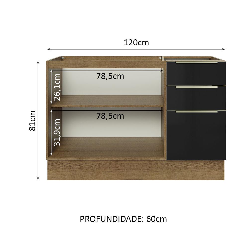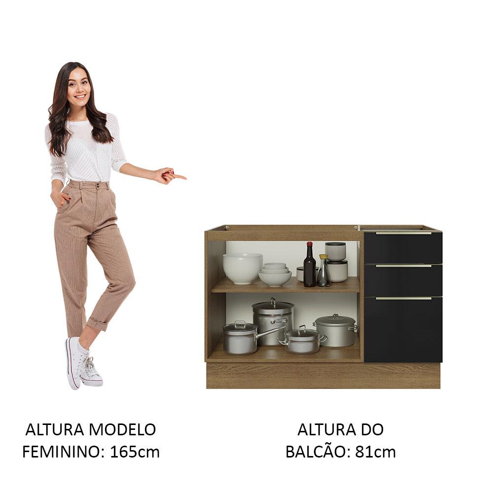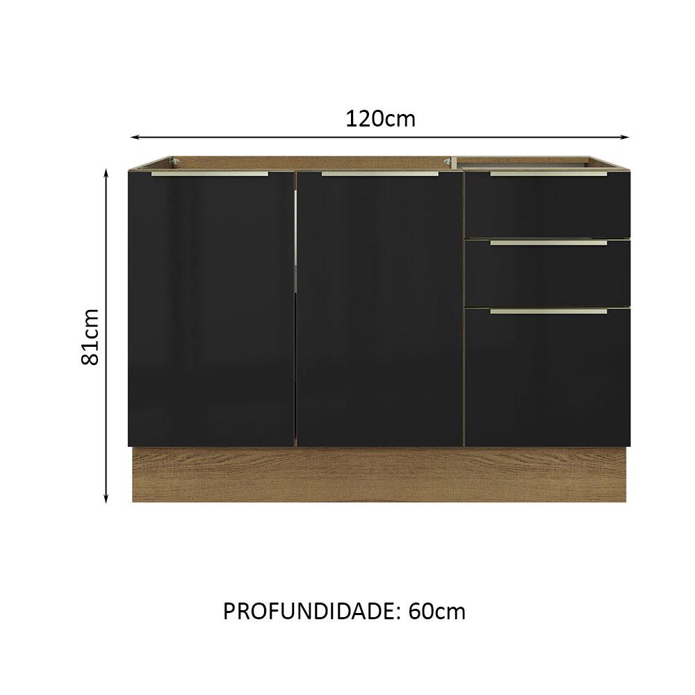Balcão Gabinete de Pia Madesa Lux 120 cm 2 Portas 3 Gavetas - Rustic/Preto