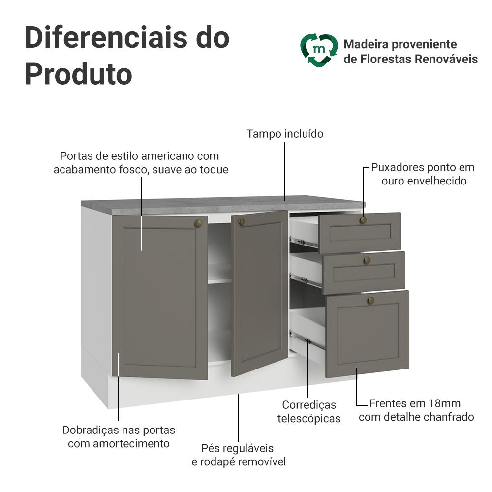 Balcão de Cozinha 120 cm 2 Portas 3 Gavetas Branco/Cinza Vik Madesa
