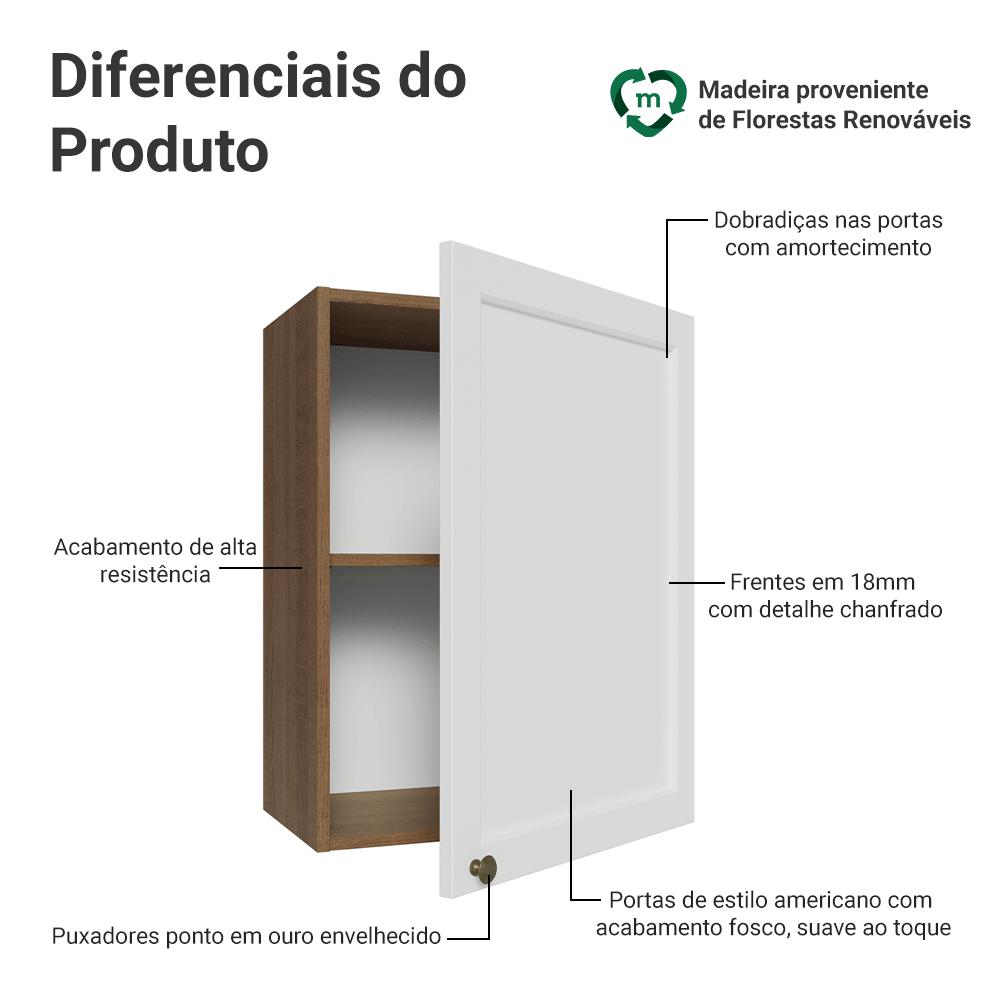 Aproveite todo o espaço da sua cozinha com o Armário Aéreo de 50 cm da Linha Vik da Madesa. O acabamento de alta resistência da estrutura é no tom amadeirado Rustic e das portas em Branco. Possui uma textura suave ao toque, e o destaque vai para os puxadores ponto em ouro envelhecido, feitos com metal resistente. Outro diferencial está no detalhe chanfrado das frentes, que forma molduras elegantes e dá profundidade ao design, refletindo o estilo americano com um toque moderno.Além de trazer elegância, a linha Vik é funcional em cada detalhe. As portas possuem dobradiças com amortecimento, garantindo um fechamento suave e silencioso, para você organizar tudo que precisa com muito mais facilidade.Ideal para quem busca elegância, qualidade e funcionalidade para o dia a dia.Medidas totais:- 66 cm de altura- 50 cm de largura- 31 cm de profundidadeO que você recebe:- Um Armário aéreo com uma portaCódigo do produto: G255006EVKÉ importante saber:- Material: MDP- Imagens meramente ilustrativas, a decoração não acompanha o produto- A Madesa não disponibiliza serviço de montagem- O produto segue com manual de instalação e todas as ferragens necessárias para sua montagemA Madesa possui compromisso com a sustentabilidade. Geramos energia limpa em nossa própria usina, priorizamos fornecedores responsáveis e utilizamos plástico reciclado em nossa produção. Além disso, reinserimos sobras no ciclo de reciclagem e investimos no desenvolvimento de nossos colaboradores e da comunidade.Garantia: Este produto conta com 1 ano de garantia total, sendo 3 meses de garantia legal e 9 meses de garantia contratual. A garantia cobre exclusivamente defeitos de fabricação e vícios ocultos. Não estão cobertos: problemas decorrentes de montagem incorreta, uso inadequado, exposição à umidade, calor ou luz solar direta, modificações no produto ou desgaste natural.