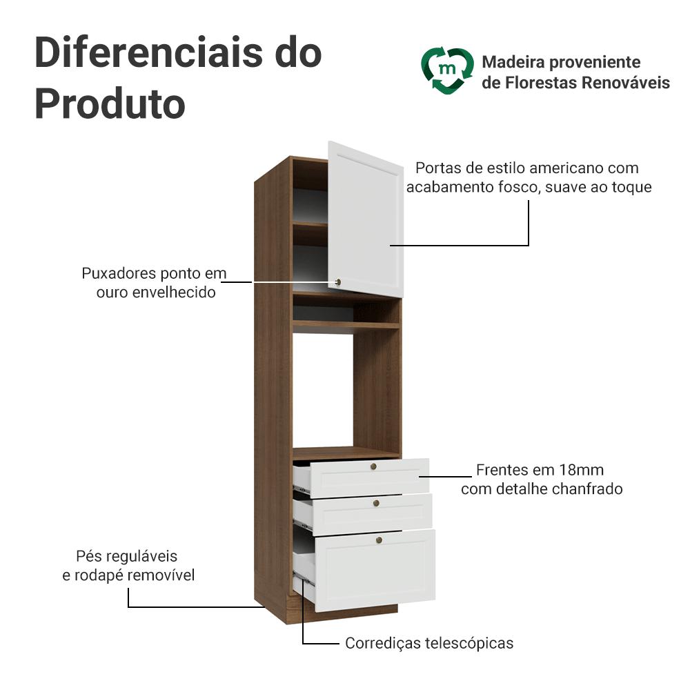 A Torre Quente da Linha Vik da Madesa é a solução ideal para quem busca organização e praticidade em um único móvel. Com uma porta, três gavetas espaçosas e um espaço especialmente projetado para acomodar forno ou micro-ondas, ela oferece tudo o que você precisa para otimizar o ambiente da sua cozinha.O acabamento de alta resistência da estrutura é em tom amadeirado Rustic e das frentes em Branco, refletindo o estilo americano com um toque moderno. Possui uma textura suave ao toque, trazendo leveza e sofisticação ao ambiente. O destaque vai para os puxadores ponto em ouro envelhecido, feitos com metal resistente, que adicionam personalidade e um charme único.Além de trazer elegância, a linha Vik é funcional em cada detalhe. As portas possuem dobradiças com amortecimento, garantindo um fechamento suave e silencioso, enquanto as gavetas com corrediças telescópicas permitem abertura total, para você organizar tudo que precisa com muito mais facilidade.Com a Linha Vik da Madesa, você une sofisticação, organização e praticidade, transformando qualquer ambiente.Medidas totais:- 225 cm de altura- 60 cm de largura- 52 cm de profundidadeO que você recebe:- Uma (1) torre quente com uma (1) porta e três (3) gavetasCódigo do produto: G266556EVKÉ importante saber:- Imagens meramente ilustrativas, a decoração não acompanha o produto- O produto segue com manual de instalação e todas as ferragens necessárias para sua montagem- A Madesa não disponibiliza serviço de montagem- Precisa ser fixado na paredeA Madesa se dedica à sustentabilidade com várias iniciativas: temos uma usina própria que gera energia para uma das fábricas. Priorizamos fornecedores responsáveis com o meio ambiente. Todo o plástico utilizado na produção é reciclado, e as sobras também são reaproveitadas. Investimos no desenvolvimento de nossos colaboradores e em ações que beneficiem a comunidade.