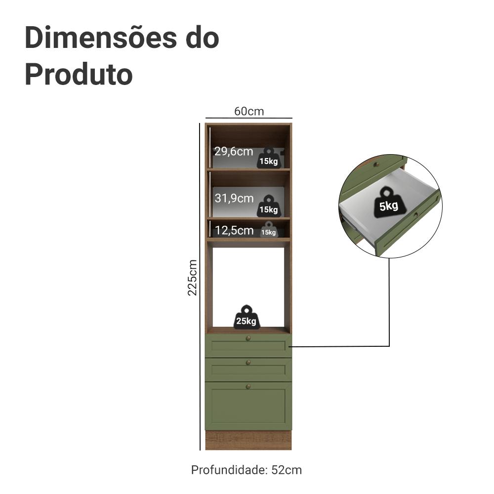 A Torre Quente da Linha Vik da Madesa é a solução ideal para quem busca organização e praticidade em um único móvel. Com uma porta, três gavetas espaçosas e um espaço especialmente projetado para acomodar forno ou micro-ondas, ela oferece tudo o que você precisa para otimizar o ambiente da sua cozinha.O acabamento de alta resistência da estrutura é em tom amadeirado Rustic e das frentes em Verde, refletindo o estilo americano com um toque moderno. Possui uma textura suave ao toque, trazendo leveza e sofisticação ao ambiente. O destaque vai para os puxadores ponto em ouro envelhecido, feitos com metal resistente, que adicionam personalidade e um charme único.Além de trazer elegância, a linha Vik é funcional em cada detalhe. As portas possuem dobradiças com amortecimento, garantindo um fechamento suave e silencioso, enquanto as gavetas com corrediças telescópicas permitem abertura total, para você organizar tudo que precisa com muito mais facilidade.Com a Linha Vik da Madesa, você une sofisticação, organização e praticidade, transformando qualquer ambiente.Medidas totais:- 225 cm de altura- 60 cm de largura- 52 cm de profundidadeO que você recebe:- Uma (1) torre quente com uma (1) porta e três (3) gavetasCódigo do produto: G26655M3VKÉ importante saber:- Imagens meramente ilustrativas, a decoração não acompanha o produto- O produto segue com manual de instalação e todas as ferragens necessárias para sua montagem- A Madesa não disponibiliza serviço de montagem- Precisa ser fixado na paredeA Madesa se dedica à sustentabilidade com várias iniciativas: temos uma usina própria que gera energia para uma das fábricas. Priorizamos fornecedores responsáveis com o meio ambiente. Todo o plástico utilizado na produção é reciclado, e as sobras também são reaproveitadas. Investimos no desenvolvimento de nossos colaboradores e em ações que beneficiem a comunidade.