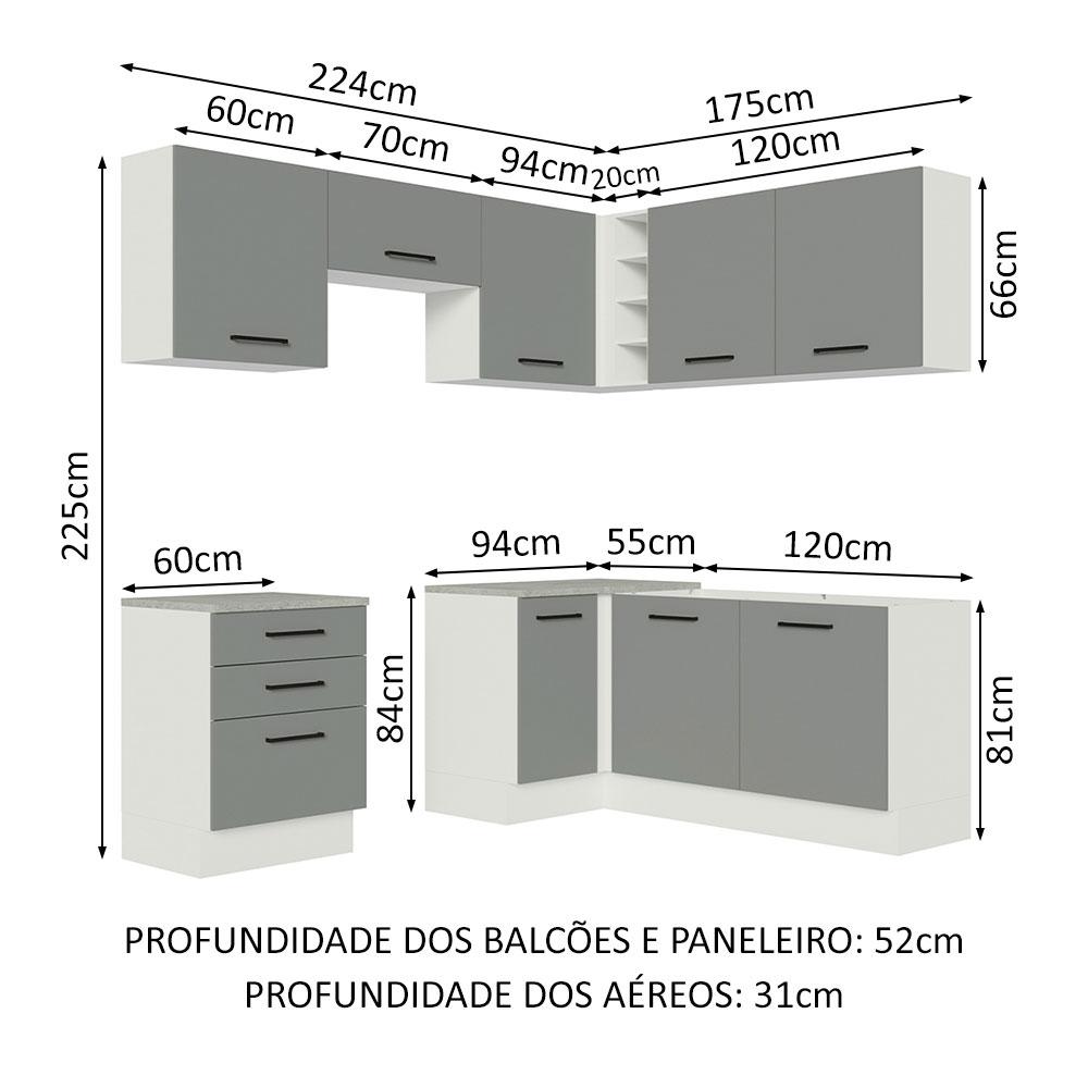 Chegou a cozinha perfeita para renovar seu ambiente com design moderno, conforto e muita qualidade. Confira a Cozinha Completa de Canto da linha Agata da Madesa.Por seu tamanho, é ideal para ambiente grandes e com muito espaço disponível. Lugar não vai faltar! São diversos módulos para organizar todos os utensílios, louças e mantimentos.Por se tratar de uma cozinha modulada, você pode organizar os armários e balcões conforme a necessidade no seu ambiente. Além disso, o canto pode ser montado tanto para o lado esquerdo quanto para o direito.Fabricada com itens de padrão superior, a cozinha possui puxadores slim em alumínio, gavetas com corrediças telescópicas e portas com amortecedores para o fechamento suave, além de pistão a gás para manter a porta basculante aberta.O balcão maior permite a colocação de pia de inox ou pedra, no tamanho de 120 cm x 52 cm.Para completar, a cozinha conta com pés reguláveis em PVC e rodapé removível em MDP de fácil encaixe, para retirar na hora de realizar a limpeza.O acabamento da estrutura é branco e o das portas e frentes é cinza. É feito em Pintura Poliéster com 7 camadas que protegem o móvel dos efeitos do álcool da água e do calor.Medidas totais:- 225 cm de altura- 399 cm de largura- 52 cm nos módulos inferiores e 31 cm nos aéreosItens inclusos:- Um (1) Aéreo de 60 cm com uma (1) porta- Um (1) Balcão de 60 cm com três (3) gavetas e tampo- Um (1) Aéreo de 70 cm com uma (1) porta basculante- Um (1) Aéreo de Canto com uma (1) porta- Um (1) Balcão de Canto com uma (1) porta e tampo- Uma (1) Adega com quatro (4) nichos- Um (1) Aéreo de 120 cm com duas (2) portas- Um (1) Balcão de 120 cm com duas (2) portas (Não acompanha tampo para este balcão.)Código do produto: GCAG399002F8Obs.:- Imagens meramente ilustrativas, os eletros, o tampo da pia, a torneira e a decoração não acompanham o produto- Os módulos de canto podem ser montados para o lado direito ou esquerdo- A Madesa não disponibiliza serviço de montagem- O produto segue com manual e todas as ferragens necessárias para a instalação1 – O produto é novo ou usado?R.: Todos os produtos da Madesa são novos, enviados da nossa fábrica diretamente para as casas de nossos clientes.2 – O produto vem montado? Se não, vocês realizam a montagem?R.: A Madesa não disponibiliza serviço de montagem. Todos os produtos seguem com manual de instalação e as ferragens necessárias. Alguns produtos possuem vídeo explicando o passo a passo da montagem.3 – Vocês possuem loja física? Posso retirar meu produto em mãos?R.: Não possuímos loja física, apenas loja virtual. Confira as opções de envio ao colocar o seu CEP.4 – Qual é o valor do envio? Posso pagar separadamente?R.: O valor do envio é calculado com base no peso e volume do produto, e no CEP de destino. Você pode calcular o valor e prazo de entrega no simulador.5 – A Madesa entrega em todo Brasil? Como é feita a entrega?R.: Sim, entregamos no Brasil inteiro através de transportadoras parceiras.A Madesa se dedica à sustentabilidade com várias iniciativas: temos uma usina própria para gerar energia que abastece uma de nossas fábricas. Selecionamos nossos fornecedores, priorizando aqueles que possuem um compromisso com a sustentabilidade e proteção do meio ambiente. Todo o plástico utilizado no setor produtivo é proveniente de reciclagem e as suas sobras são encaminhadas ao fornecedor que os recicla. Também investimos no desenvolvimento contínuo de nossos colaboradores e em ações educacionais que beneficiem a comunidade.