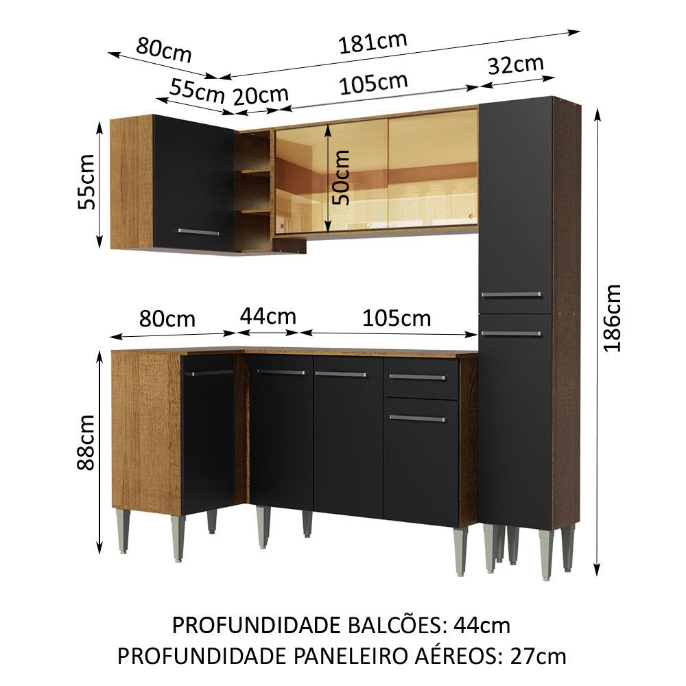 A Cozinha Emilly River de Canto Reto contempla dois balcões, três armários aéreos, uma adega acoplada e um paneleiro, todos com ótimo aproveitamento dos espaços. Assim, fica mais fácil organizar os utensílios e aparelhos da cozinha. Além disso, todos os módulos são separados, possibilitando a montagem conforme a necessidade do seu ambiente.Um dos grandes destaques desta versão é o armário aéreo de 105 cm com duas portas de correr de vidro reflex, que pode refletir o espaço ou mostrar o interior do móvel, variando conforme a luz do ambiente. Um detalhe de muita sofisticação e elegância.A cozinha é fabricada com materiais de qualidade, como puxadores com detalhe em alumínio e corrediças e dobradiças metálicas. Os pés são em PVC, pensados em facilitar a limpeza e reguláveis para nivelar pequenas imperfeições no piso. Para completar, ambos os balcões acompanham tampo em MDP.O acabamento da estrutura é no padrão amadeirado Rustic e as portas e frente são pretas. As partes internas das costas e da gaveta são brancas. O processo é feito em Pintura Poliéster ecológica que oferece resistência contra os efeitos da água e do calor.Os armários aéreos e o paneleiro precisam ser fixados na parede.Medidas totais: 186 cm de altura x 261 cm de largura x 44 cm profundidade nos balcões e 27 cm nos aéreos.Imagens meramente ilustrativas: a decoração não acompanha o produto.Itens inclusos:- Um (1) Armário aéreo de canto com uma (1) porta e uma (1) adega acoplada- Um (1) Balcão de canto com uma (1) portas e tampo- Um (1) Armário aéreo com duas (2) portas de correr de vidro reflex- Um (1) Balcão com três (3) portas, uma (1) gaveta e tampo- Um (1) Paneleiro com duas (2) portasCódigo do produto: GCEM2610037KObs.: A Madesa não disponibiliza serviço de montagem. O produto segue com manual de instalação e todas as ferragens necessárias para sua montagem.1 – O produto é novo ou usado?R.: Todos os produtos da Madesa são novos, enviados da nossa fábrica diretamente para as casas de nossos clientes.2 – O produto vem montado? Se não, vocês realizam a montagem?R.: A Madesa não disponibiliza serviço de montagem. Todos os produtos seguem com manual de instalação e as ferragens necessárias. Alguns produtos possuem vídeo explicando o passo a passo da montagem.3 – Vocês possuem loja física? Posso retirar meu produto em mãos?R.: Não possuímos loja física, apenas loja virtual. Confira as opções de envio ao colocar o seu CEP.4 – Qual é o valor do envio? Posso pagar separadamente?R.: O valor do envio é calculado com base no peso e volume do produto, e no CEP de destino. Você pode calcular o valor e prazo de entrega no simulador.5 – A Madesa entrega em todo Brasil? Como é feita a entrega?R.: Sim, entregamos no Brasil inteiro através de transportadoras parceiras.6 – O produto acompanha Nota Fiscal?R.: Sim, todos os produtos são entregues com suas respectivas notas fiscais.7 – Os produtos possuem garantia?R.: Sim. A Madesa oferece 3 meses de garantia para defeitos de fabricação.A Madesa se dedica à sustentabilidade com várias iniciativas: temos uma usina própria para gerar energia que abastece uma de nossas fábricas. Selecionamos nossos fornecedores, priorizando aqueles que possuem um compromisso com a sustentabilidade e proteção do meio ambiente. Todo o plástico utilizado no setor produtivo é proveniente de reciclagem e as suas sobras são encaminhadas ao fornecedor que os recicla. Também investimos no desenvolvimento contínuo de nossos colaboradores e em ações educacionais que beneficiem a comunidade.