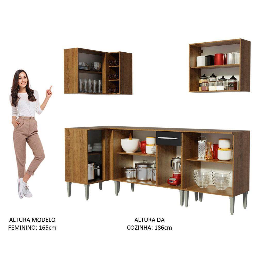 Pensada para ser uma solução completa, a Cozinha Emilly Open de Canto Reto contempla três balcões, dois armários aéreos e uma adega acoplada, todos com ótimo aproveitamento dos espaços. Assim, fica mais fácil organizar os utensílios, louças e eletros. Além disso, todos os módulos são separados, possibilitando a montagem conforme a necessidade do seu ambiente.A cozinha é fabricada com materiais de qualidade, como puxadores com detalhe em alumínio e corrediças e dobradiças metálicas. Os pés são em PVC, pensados para facilitar a limpeza e reguláveis para nivelar pequenas imperfeições no piso. Por fim, todos os balcões acompanham tampo em MDP.O acabamento da estrutura é no padrão amadeirado Rustic e as portas e frente são pretas. As partes internas das costas e da gaveta são brancas. O processo é feito em Pintura Poliéster ecológica com 7 camadas de proteção, que oferecem resistência contra os efeitos da água e do calor.Os armários aéreos e o paneleiro precisam ser fixados na parede.Medidas totais: 186 cm de altura x 293 cm de largura x 44 cm profundidade nos balcões e 27 cm nos aéreos.Imagens meramente ilustrativas: a decoração não acompanha o produto.Itens inclusos:- Um (1) Armário aéreo de canto com uma (1) porta e uma (1) adega acoplada- Um (1) Balcão de canto com uma (1) portas e tampo- Um (1) Balcão com três (3) portas, uma (1) gaveta e tampo- Um (1) Armário aéreo com duas (2) portas- Um (1) Balcão om duas (2) portas e tampoCódigo do produto: GCEM2930017KObs.: A Madesa não disponibiliza serviço de montagem. O produto segue com manual de instalação e todas as ferragens necessárias para sua montagem.1 – O produto é novo ou usado?R.: Todos os produtos da Madesa são novos, enviados da nossa fábrica diretamente para as casas de nossos clientes.2 – O produto vem montado? Se não, vocês realizam a montagem?R.: A Madesa não disponibiliza serviço de montagem. Todos os produtos seguem com manual de instalação e as ferragens necessárias. Alguns produtos possuem vídeo explicando o passo a passo da montagem.3 – Vocês possuem loja física? Posso retirar meu produto em mãos?R.: Não possuímos loja física, apenas loja virtual. Confira as opções de envio ao colocar o seu CEP.4 – Qual é o valor do envio? Posso pagar separadamente?R.: O valor do envio é calculado com base no peso e volume do produto, e no CEP de destino. Você pode calcular o valor e prazo de entrega no simulador.5 – A Madesa entrega em todo Brasil? Como é feita a entrega?R.: Sim, entregamos no Brasil inteiro através de transportadoras parceiras.6 – O produto acompanha Nota Fiscal?R.: Sim, todos os produtos são entregues com suas respectivas notas fiscais.7 – Os produtos possuem garantia?R.: Sim. A Madesa oferece 3 meses de garantia para defeitos de fabricação.A Madesa se dedica à sustentabilidade com várias iniciativas: temos uma usina própria para gerar energia que abastece uma de nossas fábricas. Selecionamos nossos fornecedores, priorizando aqueles que possuem um compromisso com a sustentabilidade e proteção do meio ambiente. Todo o plástico utilizado no setor produtivo é proveniente de reciclagem e as suas sobras são encaminhadas ao fornecedor que os recicla. Também investimos no desenvolvimento contínuo de nossos colaboradores e em ações educacionais que beneficiem a comunidade.
