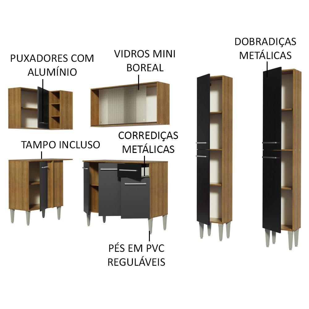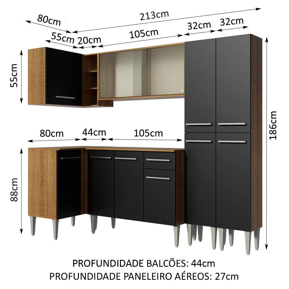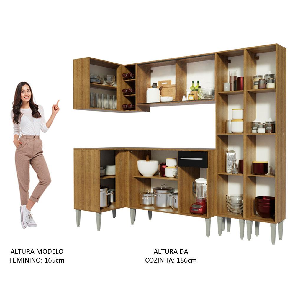 Uma solução completa e funcional para o dia a dia! Esta é a Cozinha Emilly Self de Canto Reto da Madesa. São dois balcões, dois armários aéreos, uma adega acoplada e um paneleiro, todos separados, assim a montagem pode ser feita conforme a necessidade do seu ambiente. Além disso, a disposição dos espaços é ótima para organizar os utensílios, louças e eletros.Um grande diferencial presente nesta versão é o aéreo de 105 cm, com duas portas de correr de vidro, que trazem muita elegância à cozinha.A cozinha é fabricada com itens de qualidade superior, como puxadores com detalhe em alumínio e corrediças e dobradiças metálicas resistentes. Os pés são em PVC, pensados para facilitar a limpeza e com regulagem que permite nivelar pequenas imperfeições no piso. Para completar, ambos os balcões acompanham tampo em MDP.O acabamento da estrutura é no padrão amadeirado Rustic e as portas e frente são pretas. As partes internas das costas e da gaveta são brancas. O processo é feito em Pintura Poliéster ecológica com 7 camadas de proteção, que oferecem resistência contra os efeitos da água e do calor.Os armários aéreos e o paneleiro precisam ser fixados na parede.Medidas totais: 186 cm de altura x 293 cm de largura x 44 cm profundidade nos balcões e 27 cm nos aéreos e no paneleiro.Imagens meramente ilustrativas: a decoração não acompanha o produto.Itens inclusos:- Um (1) Armário aéreo de canto com uma (1) porta e uma (1) adega acoplada- Um (1) Balcão de canto com uma (1) portas e tampo- Um (1) Armário aéreo com duas (2) portas de correr de vidro- Um (1) Balcão com três (3) portas, uma (1) gaveta e tampo- Dois (2) Paneleiros com duas (2) portasCódigo do produto: GCEM2930057KObs.: A Madesa não disponibiliza serviço de montagem. O produto segue com manual de instalação e todas as ferragens necessárias para sua montagem.1 – O produto é novo ou usado?R.: Todos os produtos da Madesa são novos, enviados da nossa fábrica diretamente para as casas de nossos clientes.2 – O produto vem montado? Se não, vocês realizam a montagem?R.: A Madesa não disponibiliza serviço de montagem. Todos os produtos seguem com manual de instalação e as ferragens necessárias. Alguns produtos possuem vídeo explicando o passo a passo da montagem.3 – Vocês possuem loja física? Posso retirar meu produto em mãos?R.: Não possuímos loja física, apenas loja virtual. Confira as opções de envio ao colocar o seu CEP.4 – Qual é o valor do envio? Posso pagar separadamente?R.: O valor do envio é calculado com base no peso e volume do produto, e no CEP de destino. Você pode calcular o valor e prazo de entrega no simulador.5 – A Madesa entrega em todo Brasil? Como é feita a entrega?R.: Sim, entregamos no Brasil inteiro através de transportadoras parceiras.6 – O produto acompanha Nota Fiscal?R.: Sim, todos os produtos são entregues com suas respectivas notas fiscais.7 – Os produtos possuem garantia?R.: Sim. A Madesa oferece 3 meses de garantia para defeitos de fabricação.A Madesa se dedica à sustentabilidade com várias iniciativas: temos uma usina própria para gerar energia que abastece uma de nossas fábricas. Selecionamos nossos fornecedores, priorizando aqueles que possuem um compromisso com a sustentabilidade e proteção do meio ambiente. Todo o plástico utilizado no setor produtivo é proveniente de reciclagem e as suas sobras são encaminhadas ao fornecedor que os recicla. Também investimos no desenvolvimento contínuo de nossos colaboradores e em ações educacionais que beneficiem a comunidade.