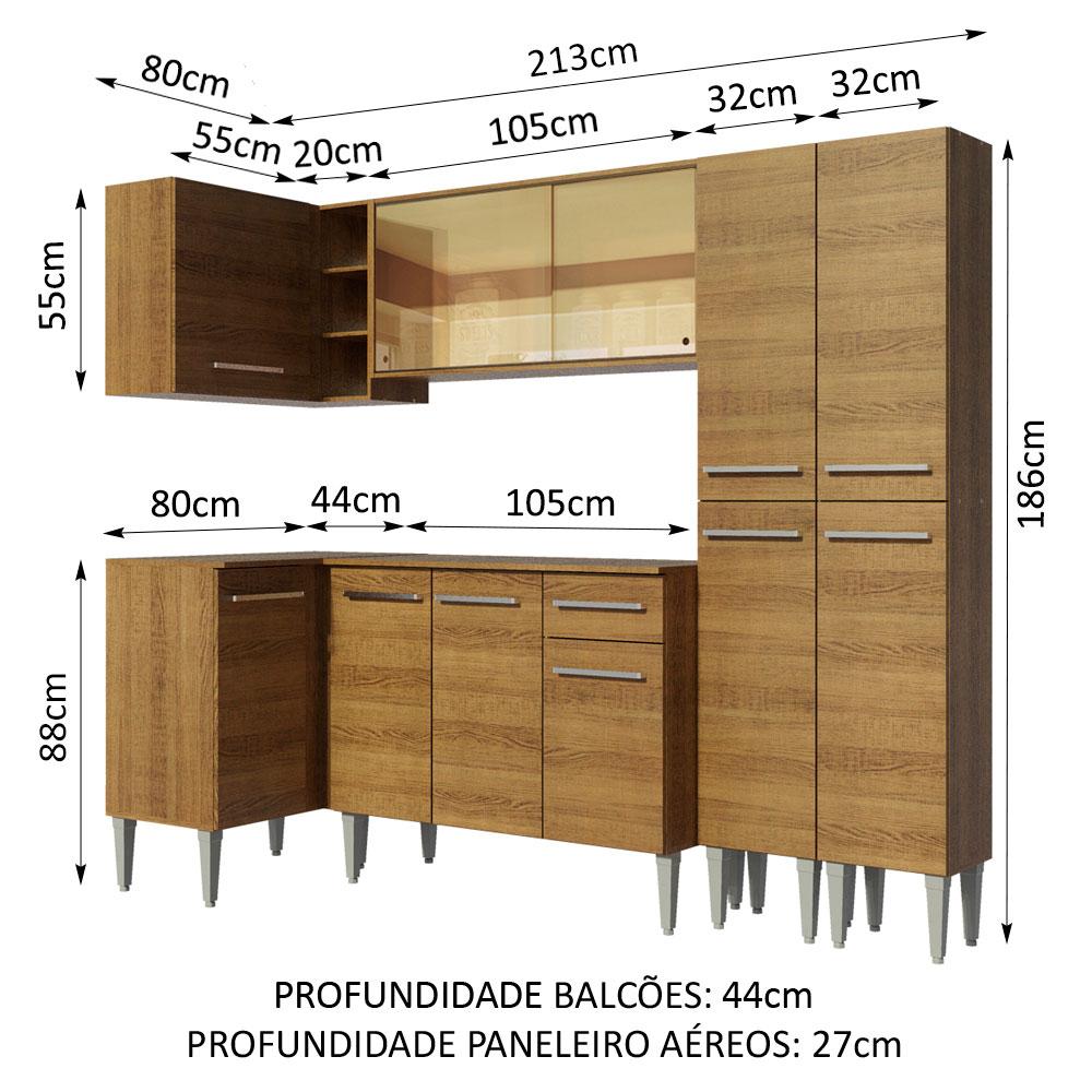 Uma solução completa e funcional para o dia a dia! Esta é a Cozinha Emilly Line de Canto Reto da Madesa. São dois balcões, dois armários aéreos, uma adega acoplada e um paneleiro, todos separados, assim a montagem pode ser feita conforme a necessidade do seu ambiente. Além disso, a disposição dos espaços é ótima para organizar os utensílios, louças e eletros.Para trazer ainda mais sofisticação e elegância, esta versão contempla o armário aéreo de 105 cm com duas portas de correr de vidro reflex, que pode refletir o espaço ou mostrar o interior do móvel, variando conforme a luz do ambiente.A cozinha é fabricada com itens de qualidade superior, como puxadores com detalhe em alumínio e corrediças e dobradiças metálicas resistentes. Os pés são em PVC, pensados para facilitar a limpeza e com regulagem que permite nivelar pequenas imperfeições no piso. Para completar, ambos os balcões acompanham tampo em MDP.O acabamento é no padrão amadeirado Rustic, em Pintura Poliéster ecológica com 7 camadas de proteção, que oferecem resistência contra os efeitos da água e do calor.Os armários aéreos e o paneleiro precisam ser fixados na parede.Medidas totais: 186 cm de altura x 293 cm de largura x 44 cm profundidade nos balcões e 27 cm nos aéreos e no paneleiro.Imagens meramente ilustrativas: a decoração não acompanha o produto.Itens inclusos:- Um (1) Armário aéreo de canto com uma (1) porta e uma (1) adega acoplada- Um (1) Balcão de canto com uma (1) portas e tampo- Um (1) Armário aéreo com duas (2) portas de correr de vidro- Um (1) Balcão com três (3) portas, uma (1) gaveta e tampo- Um (1) Paneleiro com duas (2) portasCódigo do produto: GCEM2930065ZObs.: A Madesa não disponibiliza serviço de montagem. O produto segue com manual de instalação e todas as ferragens necessárias para sua montagem.1 – O produto é novo ou usado?R.: Todos os produtos da Madesa são novos, enviados da nossa fábrica diretamente para as casas de nossos clientes.2 – O produto vem montado? Se não, vocês realizam a montagem?R.: A Madesa não disponibiliza serviço de montagem. Todos os produtos seguem com manual de instalação e as ferragens necessárias. Alguns produtos possuem vídeo explicando o passo a passo da montagem.3 – Vocês possuem loja física? Posso retirar meu produto em mãos?R.: Não possuímos loja física, apenas loja virtual. Confira as opções de envio ao colocar o seu CEP.4 – Qual é o valor do envio? Posso pagar separadamente?R.: O valor do envio é calculado com base no peso e volume do produto, e no CEP de destino. Você pode calcular o valor e prazo de entrega no simulador.5 – A Madesa entrega em todo Brasil? Como é feita a entrega?R.: Sim, entregamos no Brasil inteiro através de transportadoras parceiras.6 – O produto acompanha Nota Fiscal?R.: Sim, todos os produtos são entregues com suas respectivas notas fiscais.7 – Os produtos possuem garantia?R.: Sim. A Madesa oferece 3 meses de garantia para defeitos de fabricação.A Madesa se dedica à sustentabilidade com várias iniciativas: temos uma usina própria para gerar energia que abastece uma de nossas fábricas. Selecionamos nossos fornecedores, priorizando aqueles que possuem um compromisso com a sustentabilidade e proteção do meio ambiente. Todo o plástico utilizado no setor produtivo é proveniente de reciclagem e as suas sobras são encaminhadas ao fornecedor que os recicla. Também investimos no desenvolvimento contínuo de nossos colaboradores e em ações educacionais que beneficiem a comunidade.
