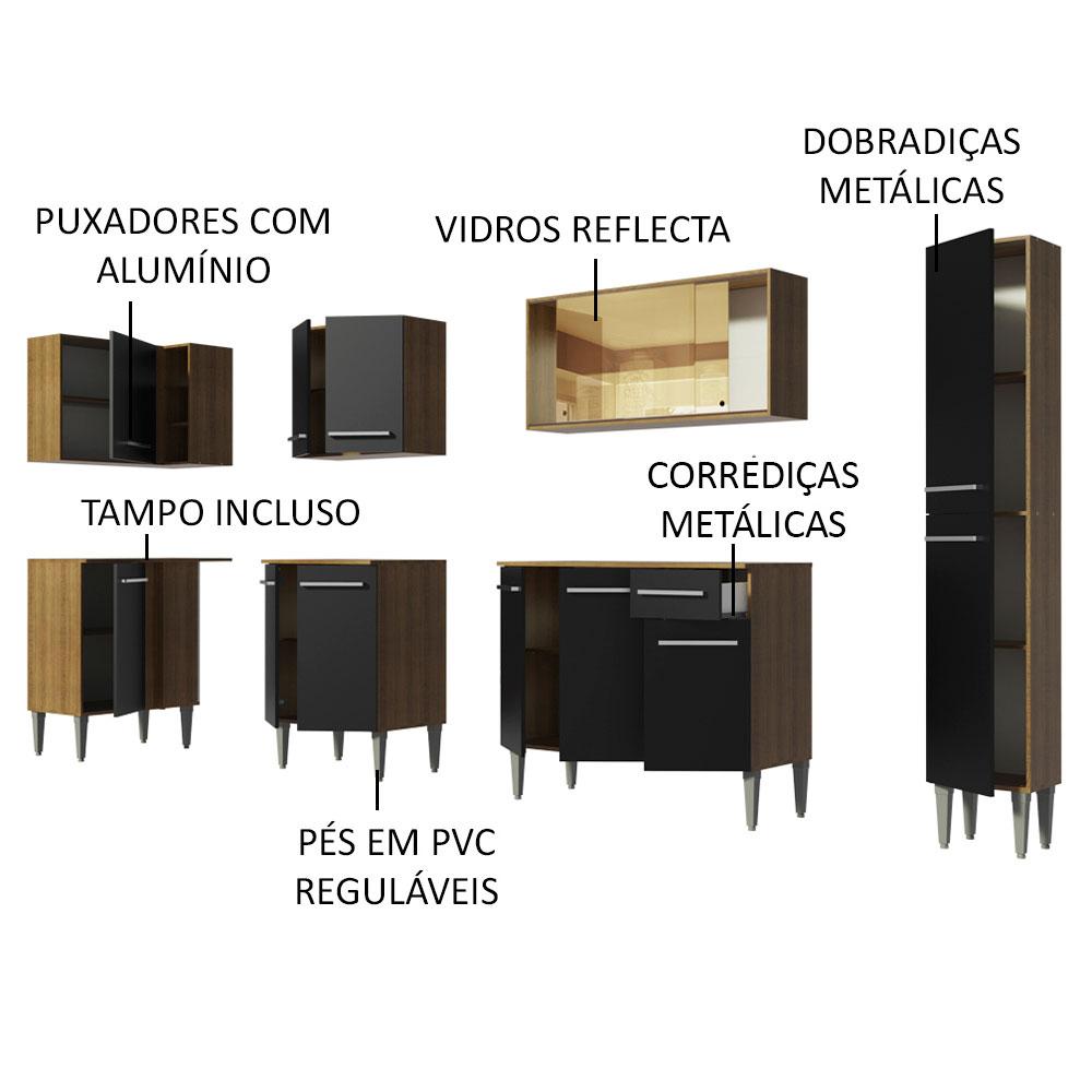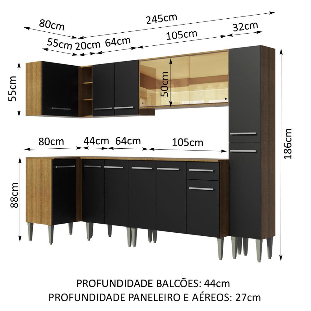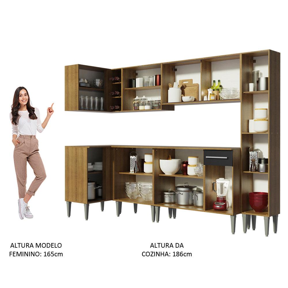 A Cozinha Emilly Wave de Canto Reto da Madesa é fabricada com itens de qualidade superior, como puxadores com detalhe em alumínio e corrediças e dobradiças metálicas resistentes. Contempla três balcões, três armários aéreos, uma adega acoplada e um paneleiro, todos com ótimo aproveitamento dos espaços. Assim, fica mais fácil organizar os utensílios, louças e eletros.Para trazer ainda mais sofisticação e elegância, esta versão contempla o armário aéreo de 105 cm com duas portas de correr de vidro reflex, que pode refletir o espaço ou mostrar o interior do móvel, variando conforme a luz do ambiente.Todos os módulos são separados, possibilitando a montagem conforme a necessidade do seu ambiente. Os pés são em PVC, pensados para facilitar a limpeza e com regulagem que permite nivelar pequenas imperfeições no piso. Para completar, todos os balcões acompanham tampo em MDP.O acabamento da estrutura é no padrão amadeirado Rustic e as portas e frente são pretas. As partes internas das costas e da gaveta são brancas. O processo é feito em Pintura Poliéster ecológica com 7 camadas de proteção, que oferecem resistência contra os efeitos da água e do calor.Os armários aéreos e o paneleiro precisam ser fixados na parede.Medidas totais: 186 cm de altura x 325 cm de largura x 44 cm profundidade nos balcões e 27 cm nos aéreos e no paneleiro.Imagens meramente ilustrativas: a decoração não acompanha o produto.Itens inclusos:- Um (1) Armário aéreo de canto com uma (1) porta e uma (1) adega acoplada- Um (1) Balcão de canto com uma (1) porta e tampo- Um (1) Armário aéreo com duas (2) portas- Um (1) Balcão com duas (2) portas e tampo- Um (1) Armário aéreo com duas (2) portas de correr de vidro reflex- Um (1) Balcão com três (3) portas, uma (1) gaveta e tampo- Um (1) Paneleiro com duas (2) portasCódigo do produto: GCEM3250047KObs.: A Madesa não disponibiliza serviço de montagem. O produto segue com manual de instalação e todas as ferragens necessárias para sua montagem.1 – O produto é novo ou usado?R.: Todos os produtos da Madesa são novos, enviados da nossa fábrica diretamente para as casas de nossos clientes.2 – O produto vem montado? Se não, vocês realizam a montagem?R.: A Madesa não disponibiliza serviço de montagem. Todos os produtos seguem com manual de instalação e as ferragens necessárias. Alguns produtos possuem vídeo explicando o passo a passo da montagem.3 – Vocês possuem loja física? Posso retirar meu produto em mãos?R.: Não possuímos loja física, apenas loja virtual. Confira as opções de envio ao colocar o seu CEP.4 – Qual é o valor do envio? Posso pagar separadamente?R.: O valor do envio é calculado com base no peso e volume do produto, e no CEP de destino. Você pode calcular o valor e prazo de entrega no simulador.5 – A Madesa entrega em todo Brasil? Como é feita a entrega?R.: Sim, entregamos no Brasil inteiro através de transportadoras parceiras.6 – O produto acompanha Nota Fiscal?R.: Sim, todos os produtos são entregues com suas respectivas notas fiscais.7 – Os produtos possuem garantia?R.: Sim. A Madesa oferece 3 meses de garantia para defeitos de fabricação.A Madesa se dedica à sustentabilidade com várias iniciativas: temos uma usina própria para gerar energia que abastece uma de nossas fábricas. Selecionamos nossos fornecedores, priorizando aqueles que possuem um compromisso com a sustentabilidade e proteção do meio ambiente. Todo o plástico utilizado no setor produtivo é proveniente de reciclagem e as suas sobras são encaminhadas ao fornecedor que os recicla. Também investimos no desenvolvimento contínuo de nossos colaboradores e em ações educacionais que beneficiem a comunidade.