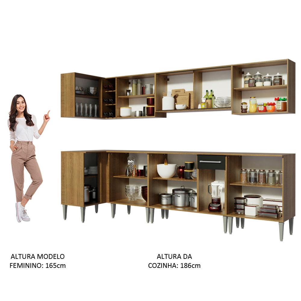 Cozinha Completa de Canto Madesa Emilly Mega com Armário Vidro Reflex e Balcão - Rustic/Preto