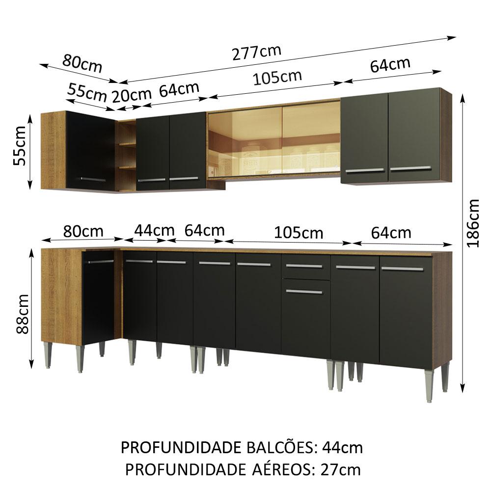 A Cozinha Completa Emilly Mega de Canto Reto da Madesa é a opção perfeita para quem dispõe de muito espaço: são quatro balcões, quatro armários aéreos e uma adega acoplada. O destaque vai para os materiais de qualidade utilizados na fabricação dos móveis, como puxadores com detalhe em alumínio e corrediças e dobradiças metálicas.Para trazer ainda mais sofisticação e elegância, esta versão contempla o aéreo de 105 cm com duas portas de correr de vidro reflex, que pode refletir o espaço ou mostrar o interior do móvel, variando conforme a luz do ambiente.Além disso, todos os módulos são separados, possibilitando a montagem conforme a necessidade do seu ambiente. Os pés são em PVC, pensados para facilitar a limpeza e com regulagem que permite nivelar pequenas imperfeições no piso. Para completar, todos os balcões acompanham tampo em MDP.O acabamento da estrutura é no padrão amadeirado Rustic e as portas e frente são pretas. As partes internas das costas e da gaveta são brancas. O processo é feito em Pintura Poliéster ecológica com 7 camadas de proteção, que oferecem resistência contra os efeitos da água e do calor.Os armários aéreos precisam ser fixados na parede.Medidas totais: 186 cm de altura x 357 cm de largura x 44 cm profundidade nos balcões e 27 cm nos aéreos.Imagens meramente ilustrativas: a decoração não acompanha o produto.Itens inclusos:- Um (1) Armário aéreo de canto com uma (1) porta e uma (1) adega acoplada- Um (1) Balcão de canto com uma (1) portas e tampo- Dois (2) Balcões com duas (2) portas e tampo- Dois (2) Armários aéreos com duas (2) portas- Um (1) Armário aéreo com duas (2) portas de correr de vidro- Um (1) Balcão com três (3) portas, uma (1) gaveta e tampoCódigo do produto: GCEM3570037KObs.: A Madesa não disponibiliza serviço de montagem. O produto segue com manual de instalação e todas as ferragens necessárias para sua montagem.1 – O produto é novo ou usado?R.: Todos os produtos da Madesa são novos, enviados da nossa fábrica diretamente para as casas de nossos clientes.2 – O produto vem montado? Se não, vocês realizam a montagem?R.: A Madesa não disponibiliza serviço de montagem. Todos os produtos seguem com manual de instalação e as ferragens necessárias. Alguns produtos possuem vídeo explicando o passo a passo da montagem.3 – Vocês possuem loja física? Posso retirar meu produto em mãos?R.: Não possuímos loja física, apenas loja virtual. Confira as opções de envio ao colocar o seu CEP.4 – Qual é o valor do envio? Posso pagar separadamente?R.: O valor do envio é calculado com base no peso e volume do produto, e no CEP de destino. Você pode calcular o valor e prazo de entrega no simulador.5 – A Madesa entrega em todo Brasil? Como é feita a entrega?R.: Sim, entregamos no Brasil inteiro através de transportadoras parceiras.6 – O produto acompanha Nota Fiscal?R.: Sim, todos os produtos são entregues com suas respectivas notas fiscais.7 – Os produtos possuem garantia?R.: Sim. A Madesa oferece 3 meses de garantia para defeitos de fabricação.A Madesa se dedica à sustentabilidade com várias iniciativas: temos uma usina própria para gerar energia que abastece uma de nossas fábricas. Selecionamos nossos fornecedores, priorizando aqueles que possuem um compromisso com a sustentabilidade e proteção do meio ambiente. Todo o plástico utilizado no setor produtivo é proveniente de reciclagem e as suas sobras são encaminhadas ao fornecedor que os recicla. Também investimos no desenvolvimento contínuo de nossos colaboradores e em ações educacionais que beneficiem a comunidade.