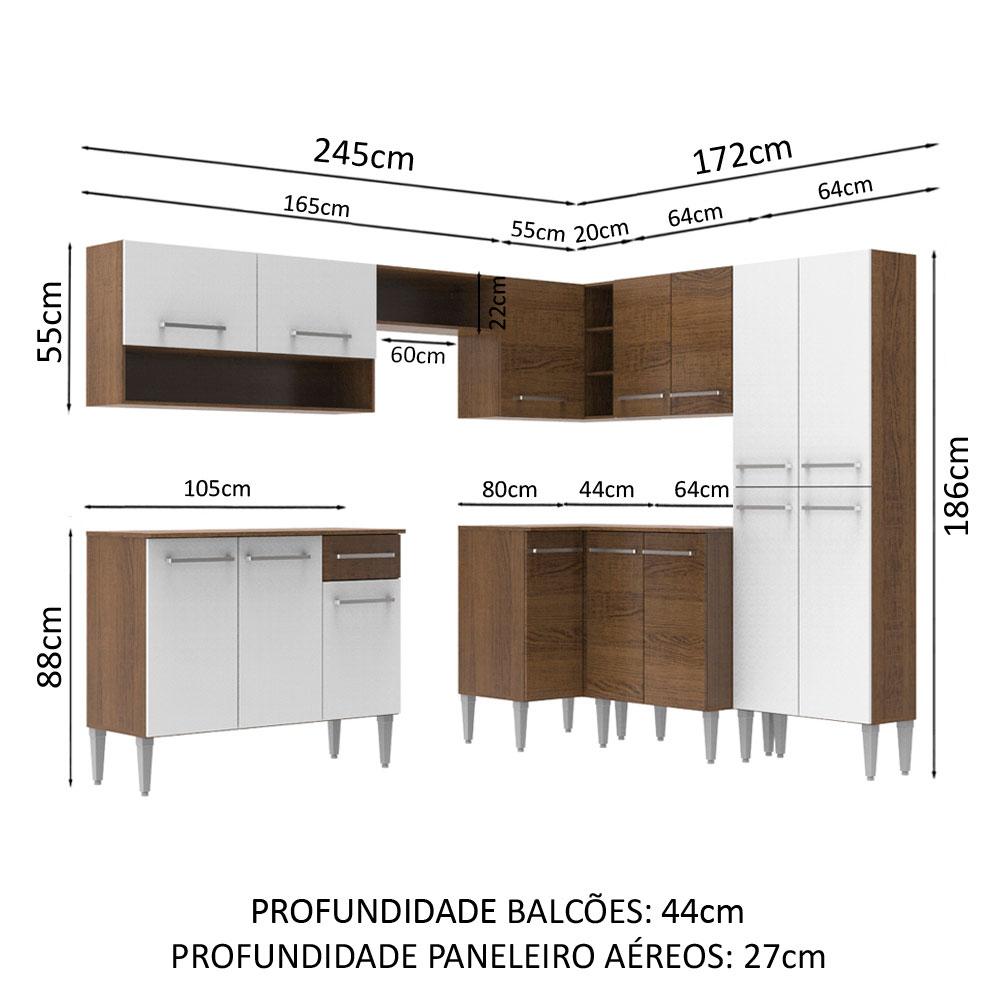 A Cozinha Emilly de Canto Reto se destaca por ser completa e ideal para o seu dia-a-dia. Conta com 15 portas, 1 gaveta e 5 nichos com puxadores com alumínio e corrediças e dobradiças metálicas resistentes. Acompanha tampo de madeira de todos os balcões. Os pés são em PVC para facilitar a limpeza e reguláveis para nivelar pequenas imperfeições no piso.O acabamento interno e externo é nas cores branco e amadeirado Rustic em Pintura Poliéster com 7 camadas de proteção que oferecem resistência contra os efeitos da água e do calor. Ela é dividida em sete módulos independentes: balcão de pia, armário aéreo com duas portas e dois nichos, balcão de canto reto, armário aéreo de canto reto com duas portas e adega, balcão com duas portas, armário aéreo com duas portas e um paneleiro duplo com quatro portas.Os armários aéreos precisam ser fixados na parede. Os módulos de canto devem ser instalados conforme mostram as imagens, não sendo possível fazer a inversão do lado da montagem.Medidas totais: 186 cm de altura, 245 cm de largura do lado esquerdo e 172 cm de largura do lado direito, contabilizando o espaço necessário para o canto. São 44 cm profundidade nos balcões inferiores e 27 cm no paneleiro e nos aéreos.Imagens meramente ilustrativas: a decoração e o fogão não acompanham o produto.Itens inclusos:- Um (1) balcão de pia com 3 portas, 1 gaveta e tampo- Um (1) armário aéreo com 2 portas e 2 nichos grandes- Um (1) balcão de canto reto com 1 porta e tampo- Um (1) armário aéreo de canto reto com 1 porta e adega acoplada- Um (1) balcão com 2 portas e tampo- Um (1) armário aéreo com 2 portas- Um (1) paneleiro duplo com 4 portasCódigo do produto: GCEM4170019BObs.: A Madesa não disponibiliza serviço de montagem. O produto segue com manual de instalação e todas as ferragens necessárias para sua montagem.1-O produto é novo ou usado?R.: Todos os produtos da Madesa são novos, enviados da nossa fábrica diretamente para as casas de nossos clientes.2-O produto vem montado? Se não, vocês realizam a montagem?R.: A Madesa não disponibiliza serviço de montagem. Todos os produtos seguem com manual de instalação e as ferragens necessárias. Alguns produtos possuem vídeo explicando o passo a passo da montagem.3-Vocês possuem loja física? Posso retirar meu produto em mãos?R.: Não possuímos loja física, apenas loja virtual. Confira as opções de envio ao colocar o seu CEP.4-Qual é o valor do envio? Posso pagar separadamente?R.: O valor do envio é calculado com base no peso e volume do produto, e no CEP de destino. Você pode calcular o valor e prazo de entrega no simulador.5-A Madesa entrega em todo Brasil? Como é feita a entrega?R.: Sim, entregamos no Brasil inteiro através de transportadoras parceiras.6-O produto acompanha Nota Fiscal?R.: Sim, todos os produtos são entregues com suas respectivas notas fiscais.7-Os produtos possuem garantia?R.: Sim. A Madesa oferece 3 meses de garantia para defeitos de fabricação.A Madesa se dedica à sustentabilidade com várias iniciativas: temos uma usina própria para gerar energia que abastece uma de nossas fábricas. Selecionamos nossos fornecedores, priorizando aqueles que possuem um compromisso com a sustentabilidade e proteção do meio ambiente. Todo o plástico utilizado no setor produtivo é proveniente de reciclagem e as suas sobras são encaminhadas ao fornecedor que os recicla. Também investimos no desenvolvimento contínuo de nossos colaboradores e em ações educacionais que beneficiem a comunidade.