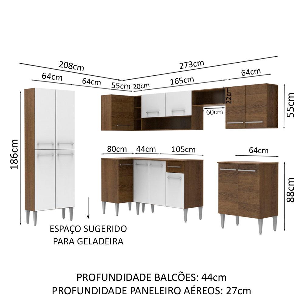 A Cozinha Completa Emilly de Canto Reto é a solução ideal para o seu dia-a-dia. Possui puxadores com alumínio e corrediças e dobradiças metálicas resistentes. Conta com 15 portas, 1 gaveta e 5 nichos proporcionando amplos espaços. Acompanha tampo de madeira de todos os balcões. Os pés são em PVC para facilitar a limpeza e reguláveis para nivelar pequenas imperfeições no piso.O acabamento interno e externo é nas cores amadeirado Rustic e branco, em Pintura Poliéster com 7 camadas de proteção que oferece resistência contra os efeitos da água e do calor. Ela é dividida em sete módulos independentes: paneleiro duplo de quatro portas, balcão de canto reto, armário aéreo de canto reto com duas portas e adega, balcão de pia, armário aéreo com duas portas e dois nichos, balcão com 2 portas e armário aéreo com 2 portas.Os armários aéreos precisam ser fixados na parede. Os módulos de canto devem ser instalados conforme mostram as imagens, não sendo possível fazer a inversão do lado da montagem.Medidas totais: 186 cm de altura, 208 cm de largura do lado esquerdo - contando o espaço sugerido para a geladeira de 64 cm - e 273 cm de largura do lado direito, contabilizando o espaço necessário para o canto. São 44 cm profundidade nos balcões inferiores e 27 cm no paneleiro e nos aéreos.Imagens meramente ilustrativas: a decoração e os eletros não acompanham o produto.Itens inclusos:- Um (1) paneleiro duplo com 4 portas- Um (1) balcão de canto reto com 1 porta e tampo- Um (1) armário aéreo de canto reto com 1 porta e adega acoplada- Um (1) balcão de pia com 3 portas, 1 gaveta e tampo- Um (1) armário aéreo com 2 portas e 2 nichos grandes- Um (1) balcão com 2 portas e tampo- Um (1) armário aéreo com 2 portasCódigo do produto: GCEM4810019BObs.: A Madesa não disponibiliza serviço de montagem. O produto segue com manual de instalação e todas as ferragens necessárias para sua montagem.1-O produto é novo ou usado?R.: Todos os produtos da Madesa são novos, enviados da nossa fábrica diretamente para as casas de nossos clientes.2-O produto vem montado? Se não, vocês realizam a montagem?R.: A Madesa não disponibiliza serviço de montagem. Todos os produtos seguem com manual de instalação e as ferragens necessárias. Alguns produtos possuem vídeo explicando o passo a passo da montagem.3-Vocês possuem loja física? Posso retirar meu produto em mãos?R.: Não possuímos loja física, apenas loja virtual. Confira as opções de envio ao colocar o seu CEP.4-Qual é o valor do envio? Posso pagar separadamente?R.: O valor do envio é calculado com base no peso e volume do produto, e no CEP de destino. Você pode calcular o valor e prazo de entrega no simulador.5-A Madesa entrega em todo Brasil? Como é feita a entrega?R.: Sim, entregamos no Brasil inteiro através de transportadoras parceiras.6-O produto acompanha Nota Fiscal?R.: Sim, todos os produtos são entregues com suas respectivas notas fiscais.7-Os produtos possuem garantia?R.: Sim. A Madesa oferece 3 meses de garantia para defeitos de fabricação.A Madesa se dedica à sustentabilidade com várias iniciativas: temos uma usina própria para gerar energia que abastece uma de nossas fábricas. Selecionamos nossos fornecedores, priorizando aqueles que possuem um compromisso com a sustentabilidade e proteção do meio ambiente. Todo o plástico utilizado no setor produtivo é proveniente de reciclagem e as suas sobras são encaminhadas ao fornecedor que os recicla. Também investimos no desenvolvimento contínuo de nossos colaboradores e em ações educacionais que beneficiem a comunidade.