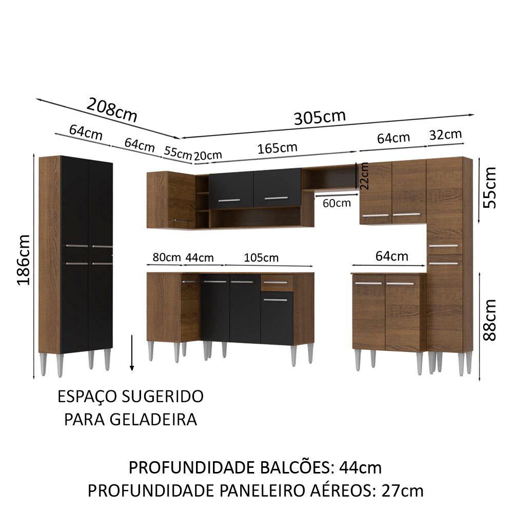 A Cozinha Completa Emilly de Canto Reto é completa e perfeita para o seu dia-a-dia. Possui puxadores com alumínio e corrediças e dobradiças metálicas resistentes. Conta com 17 portas, 1 gaveta e 5 nichos com o máximo de aproveitamento dos espaços. Acompanha tampo de madeira de todos os balcões. Os pés são em PVC para facilitar a limpeza e reguláveis para nivelar pequenas imperfeições no piso.O acabamento interno e externo é nas cores amadeirado Rustic e preto, em Pintura Poliéster com 7 camadas de proteção que oferece resistência contra os efeitos da água e do calor. Ela é dividida em oito módulos independentes: paneleiro duplo, balcão de canto reto, armário aéreo de canto reto com duas portas e adega, balcão de pia, armário aéreo com duas portas e dois nichos, balcão com 2 portas, armário aéreo com 2 portas e o paneleiro simples.Os armários aéreos precisam ser fixados na parede. Os módulos de canto devem ser instalados conforme mostram as imagens, não sendo possível fazer a inversão do lado da montagem.Medidas totais: 186 cm de altura, 208 cm de largura do lado esquerdo – contando o espaço sugerido para a geladeira de 64 cm - e 305 cm de largura do lado direito, contabilizando o espaço necessário para o canto. São 44 cm profundidade nos balcões inferiores e 27 cm no paneleiro e nos aéreos.Imagens meramente ilustrativas: a decoração e os eletros não acompanham o produto.Itens inclusos:- Um (1) paneleiro duplo com 4 portas- Um (1) balcão de canto reto com 1 porta e tampo- Um (1) armário aéreo de canto reto com 1 porta e adega acoplada- Um (1) balcão de pia com 3 portas, 1 gaveta e tampo- Um (1) armário aéreo com 2 portas e 2 nichos grandes- Um (1) balcão com 2 portas e tampo- Um (1) armário aéreo com 2 portas- Um (1) paneleiro simples com 2 portasCódigo do produto: GCEM5130017KObs.: A Madesa não disponibiliza serviço de montagem. O produto segue com manual de instalação e todas as ferragens necessárias para sua montagem.1-O produto é novo ou usado?R.: Todos os produtos da Madesa são novos, enviados da nossa fábrica diretamente para as casas de nossos clientes.2-O produto vem montado? Se não, vocês realizam a montagem?R.: A Madesa não disponibiliza serviço de montagem. Todos os produtos seguem com manual de instalação e as ferragens necessárias. Alguns produtos possuem vídeo explicando o passo a passo da montagem.3-Vocês possuem loja física? Posso retirar meu produto em mãos?R.: Não possuímos loja física, apenas loja virtual. Confira as opções de envio ao colocar o seu CEP.4-Qual é o valor do envio? Posso pagar separadamente?R.: O valor do envio é calculado com base no peso e volume do produto, e no CEP de destino. Você pode calcular o valor e prazo de entrega no simulador.5-A Madesa entrega em todo Brasil? Como é feita a entrega?R.: Sim, entregamos no Brasil inteiro através de transportadoras parceiras.6-O produto acompanha Nota Fiscal?R.: Sim, todos os produtos são entregues com suas respectivas notas fiscais.7-Os produtos possuem garantia?R.: Sim. A Madesa oferece 3 meses de garantia para defeitos de fabricação.A Madesa se dedica à sustentabilidade com várias iniciativas: temos uma usina própria para gerar energia que abastece uma de nossas fábricas. Selecionamos nossos fornecedores, priorizando aqueles que possuem um compromisso com a sustentabilidade e proteção do meio ambiente. Todo o plástico utilizado no setor produtivo é proveniente de reciclagem e as suas sobras são encaminhadas ao fornecedor que os recicla. Também investimos no desenvolvimento contínuo de nossos colaboradores e em ações educacionais que beneficiem a comunidade.