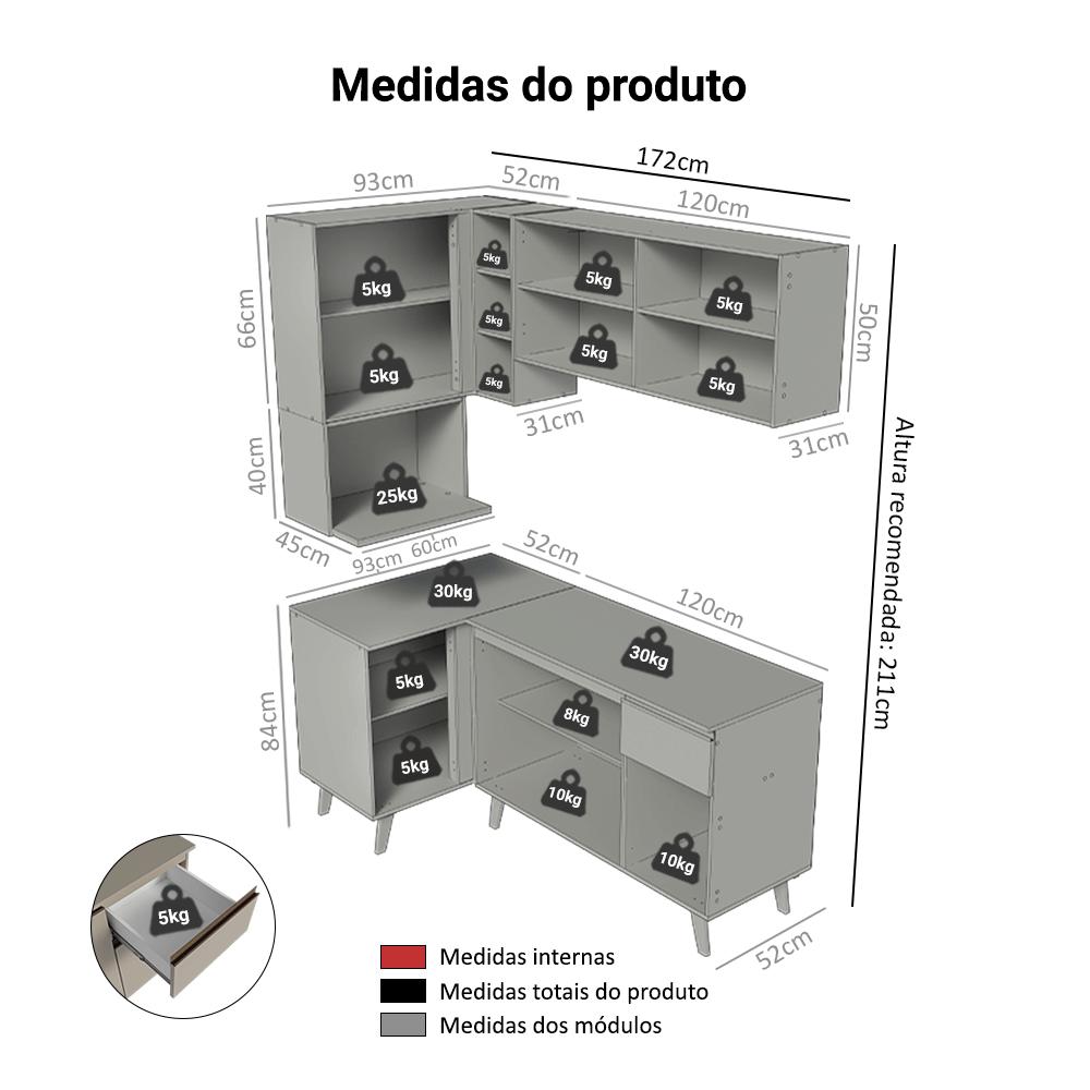 A Cozinha de Canto é perfeita para quem busca funcionalidade. Um dos destaques é o aéreo com adega acoplada, ideal para aproveitar ainda mais o espaço. Além disso, conta com um nicho para módulo de forno, garantindo praticidade.A linha Nice chega em uma nova versão no tom crema, uma tonalidade suave que transmite aconchego e leveza. Outro diferencial está nos puxadores em bronze metalizado e pés em bronze sólido, que acrescentam um toque contemporâneo.O balcão conta com dobradiças metálicas nas portas e puxadores em perfil de alumínio, discretos e resistentes. As gavetas possuem corrediças que permitem abertura total, oferecendo mais praticidade no uso diário. O tampo é removível, possibilitando a instalação de cuba ou pedra e o acabamento de alta resistência garante durabilidade no uso diário.Medidas totais:- 211 cm de altura- 265 cm de largura- 52 cm de profundidade nos balcões, 31 cm nos aéreos e 45 cm no nicho para micro-ondasO que você recebe:- Um Armário Aéreo de 120 cm com duas portas- Um Nicho aéreo de 60 cm com espaço para forno- Um Armário Aéreo de canto com adega acomplada- Um Balcão de 120 cm com três portas e uma gaveta- Um Balcão de canto com uma portaCódigo do produto: GCNC2650057PÉ importante saber:- Material: MDP- A Madesa não oferece serviço de montagem.- O produto segue com manual e todas as ferragens necessárias.- Imagens meramente ilustrativas, a decoração não acompanha o produto.- O canto pode ser montado tanto para o lado esquerdo quanto para o lado direito.A Madesa se dedica à sustentabilidade com várias iniciativas: temos uma usina própria que gera energia para uma das fábricas. Priorizamos fornecedores responsáveis com o meio ambiente. Todo o plástico utilizado na produção é reciclado, e as sobras também são reaproveitadas. Investimos no desenvolvimento de nossos colaboradores e em ações que beneficiem a comunidade.