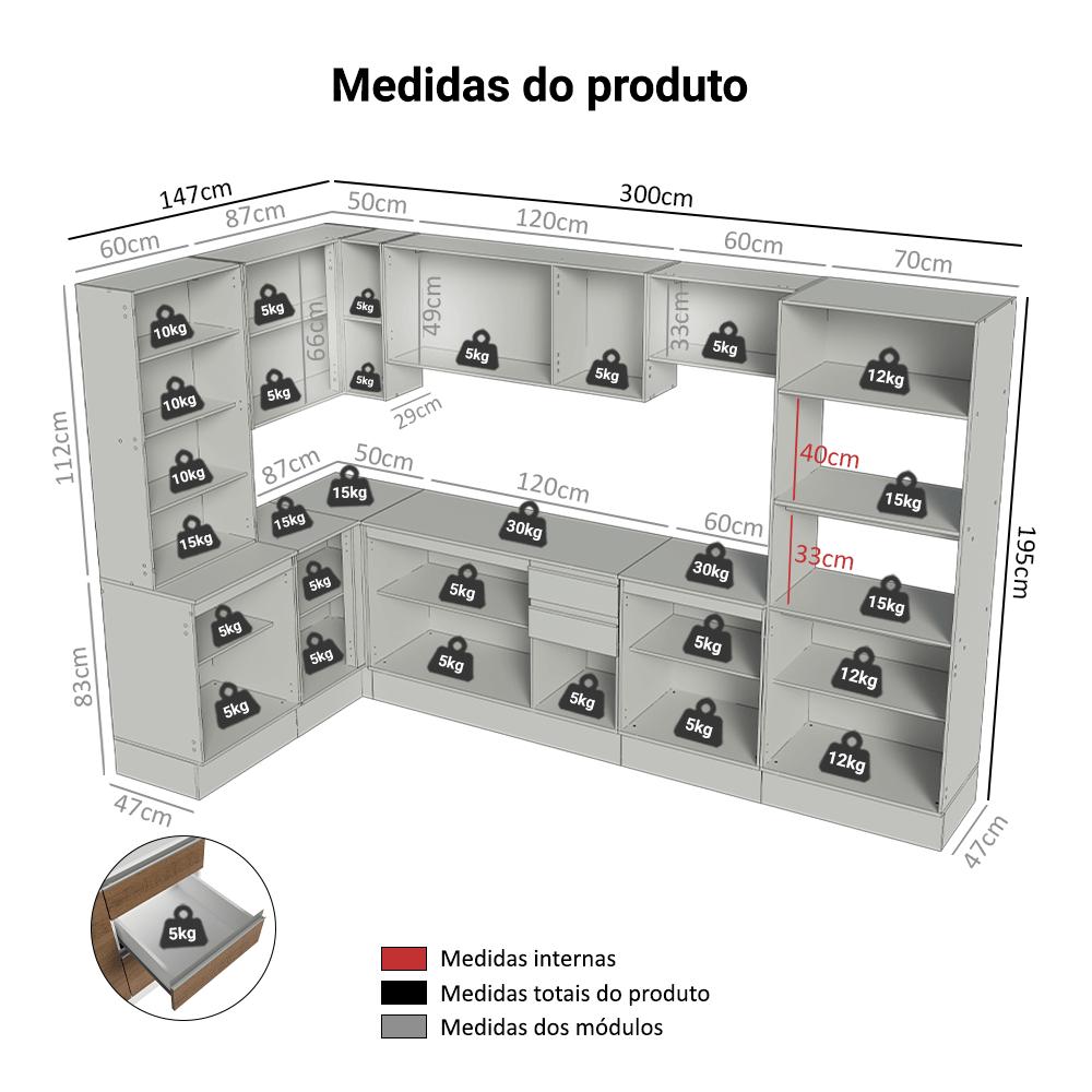 Armário de Cozinha Completa de Canto 100% MDF 447 cm Branco/Rustic/Crema Smart Madesa 02