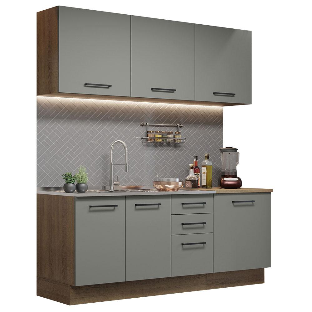 Esta Cozinha Compacta da linha Agata da Madesa é funcional, moderna e se destaca pelo bom disponível.Os materiais utilizados na fabricação são de qualidade superior, como os puxadores com alça em alumínio, as gavetas com corrediças telescópicas de abertura total e as portas com amortecimento para fechamento suave.Por se tratar de uma cozinha modulada, é possível organizar as peças conforme a necessidade do seu ambiente.O balcão de pia tem espaço de 120 x 52 cm e permite instalação de pia de inox ou pedra. O balcão de 60 cm possui tampo, que pode ser recortado para a instalação de cooktop.Para completar, os pés reguláveis em PVC com rodapé removível em MDP de encaixe fácil, para facilitar na hora da limpeza.O acabamento da estrutura é em amadeirado Rustic. As portas e frentes são cinza e as partes internas das costas e das gavetas são brancas. É feito em Pintura Poliéster ecológica, que consiste na aplicação de 7 camadas de proteção resistentes a álcool, água e calor.Esta cozinha pode ser complementada pelos módulos avulsos da linha Agata da Madesa.Medidas totais:- 225 cm de altura- 180 cm de largura- 52 cm de profundidade nos módulos inferiores e 31 cm nos aéreosItens inclusos:- Um (1) Aéreo de 120 cm com duas (2) portas- Um (1) Balcão de Pia com duas (2) portas e três (3) gavetas (Não acompanha tampo.)- Um (1) Aéreo de 60 cm com uma (1) porta- Um (1) Balcão de 60 cm com uma (1) porta e tampoCódigo do produto: GRAG180001F9Obs.:- As imagens são meramente ilustrativas, os eletros e a decoração não acompanham o produto- A Madesa não disponibiliza serviço de montagem- O produto segue com manual e todas as ferragens necessárias para a instalação1 – O produto é novo ou usado?R.: Todos os produtos da Madesa são novos, enviados da nossa fábrica diretamente para as casas de nossos clientes.2 – O produto vem montado? Se não, vocês realizam a montagem?R.: A Madesa não disponibiliza serviço de montagem. Todos os produtos seguem com manual de instalação e as ferragens necessárias. Alguns produtos possuem vídeo explicando o passo a passo da montagem.3 – Vocês possuem loja física? Posso retirar meu produto em mãos?R.: Não possuímos loja física, apenas loja virtual. Confira as opções de envio ao colocar o seu CEP.4 – Qual é o valor do envio? Posso pagar separadamente?R.: O valor do envio é calculado com base no peso e volume do produto, e no CEP de destino. Você pode calcular o valor e prazo de entrega no simulador.5 – A Madesa entrega em todo Brasil? Como é feita a entrega?R.: Sim, entregamos no Brasil inteiro através de transportadoras parceiras.6 – O produto acompanha Nota Fiscal?R.: Sim, todos os produtos são entregues com suas respectivas notas fiscais.7 – Os produtos possuem garantia?R.: Sim. A Madesa oferece 3 meses de garantia para defeitos de fabricação.A Madesa se dedica à sustentabilidade com várias iniciativas: temos uma usina própria para gerar energia que abastece uma de nossas fábricas. Selecionamos nossos fornecedores, priorizando aqueles que possuem um compromisso com a sustentabilidade e proteção do meio ambiente. Todo o plástico utilizado no setor produtivo é proveniente de reciclagem e as suas sobras são encaminhadas ao fornecedor que os recicla. Também investimos no desenvolvimento contínuo de nossos colaboradores e em ações educacionais que beneficiem a comunidade.