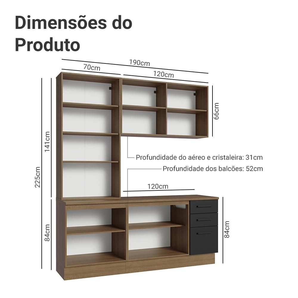 Este Armário de Cozinha Compacta da linha Agata da Madesa é moderno e funcional.O móvel conta com puxadores com alça em alumínio, gavetas com corrediças telescópicas de abertura total, portas com amortecimento para fechamento suave e pés reguláveis em PVC.O grande diferencial deste modelo é a cristaleira. Super sofisticada, possui duas portas de vidro e muito espaço disponível para organizar louças, copos e demais objetos.A cozinha ainda conta com diversas gavetas, prateleiras e nichos. Assim, fica mais fácil fazer a organização de todos os utensílios. Além disso, o balcão acompanha tampo, que pode ser removido para instalação de pia de inox ou pedra, nas medidas de 120 x 52 cm.Esta cozinha é planejada, composta por módulos avulsos que podem ser organizados conforme o espaço do seu ambiente. Também pode ser posteriormente complementada pelos módulos da linha Agata da Madesa.E para completar, o acabamento da estrutura é em amadeirado Rustic e o das portas e frentes é preto.Medidas totais:- 225 cm de altura- 190 cm de largura- 52 cm de profundidade nos balcões e 31 cm no aéreo e na cristaleiraItens inclusos:- Uma (1) Cristaleira de 70 cm com duas (2) portas- Um (1) Balcão de 70 cm com duas (2) portas e tampo- Um (1) Aéreo de 120 cm com duas (2) portas- Um (1) Balcão de 120 cm com duas (2) portas, três (3) gavetas e tampoCódigo do produto: GRAG1900017KObs.:- A cristaleira não acompanha pés nem kit para suspender na parede. Deve ser instalada sobre o balcão e fixada na parede.- As imagens são meramente ilustrativas, os eletros e a decoração não acompanham o produto