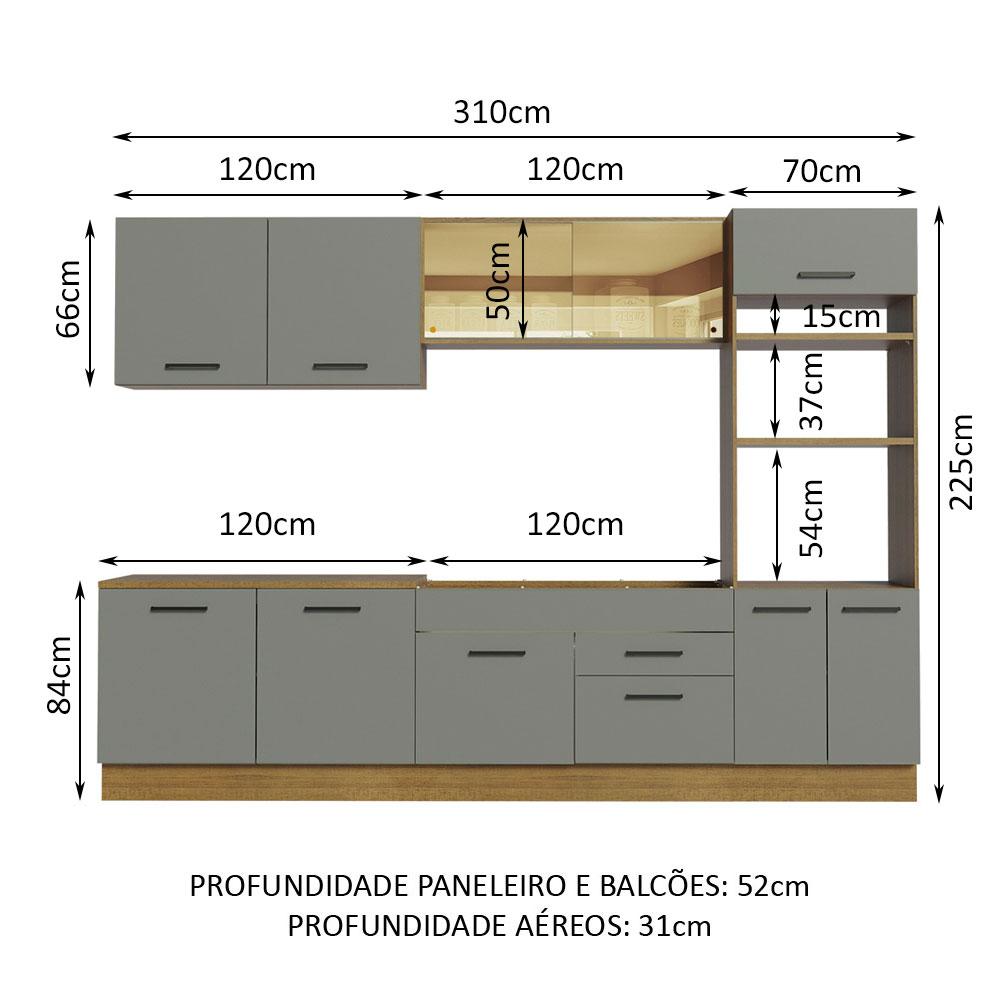 As cozinhas da linha Agata da Madesa se destacam pela modernidade e pela qualidade na construção. Neste modelo, possui espaço de sobra para organizar todos os utensílios da cozinha.Todas as portas possuem puxador com alça de alumínio e dobradiças que amortecem o fechamento. As gavetas contemplam corrediças telescópicas e o detalhe dos vidros do aéreo no estilo reflex traz ainda mais elegância à cozinha.Na parte inferior, os módulos possuem pés reguláveis em PVC e rodapés removíveis em MDP, que facilitam a limpeza. Um dos balcões acompanha tampo, que pode ser recortado para colocação de cooktop. O outro balcão não acompanha tampo e comporta pias de inox ou pedra, no espaço de 120 x 52 cm.Para completar, a torre quente possui prateleira regulável e espaço para forno e micro-ondas. Também permite a instalação de forno embutido.O acabamento da estrutura é em amadeirado Rustic e as partes internas das costas e das gavetas são brancas. As portas e frentes são cinzas. É feito em Pintura Poliéster, com 7 camadas de proteção resistentes a álcool, água e calor.Medidas totais da cozinha: 225 cm de altura, 310 cm de largura e profundidade de 52 cm nos balcões e na torre e 31 cm nos aéreos.Esta cozinha pode ser complementada pelos módulos avulsos da linha Agata da Madesa.(Imagens meramente ilustrativas: os eletros, o tampo da pia, a torneira e a decoração não acompanham o produto).Itens inclusos:- Um (1) Aéreo de 120 cm com duas (2) portas de correr- Um (1) Balcão de pia de 120 cm de largura com duas (2) portas e tampo- Um (1) Aéreo de 120 cm com duas (2) portas de correr de vidro reflex- Um (1) Balcão de pia de 120 cm de largura com uma (1) porta e duas (2) gavetas, sendo uma maior (não acompanha tampo)- Uma (1) Torre de 70 cm de largura com três (3) portasCódigo do produto: GRAG310001F9Obs.: A Madesa não disponibiliza serviço de montagem. O produto segue com manual de instalação e todas as ferragens necessárias para sua montagem.1 – O produto é novo ou usado?R.: Todos os produtos da Madesa são novos, enviados da nossa fábrica diretamente para as casas de nossos clientes.2 – O produto vem montado? Se não, vocês realizam a montagem?R.: A Madesa não disponibiliza serviço de montagem. Todos os produtos seguem com manual de instalação e as ferragens necessárias. Alguns produtos possuem vídeo explicando o passo a passo da montagem.3 – Vocês possuem loja física? Posso retirar meu produto em mãos?R.: Não possuímos loja física, apenas loja virtual. Confira as opções de envio ao colocar o seu CEP.4 – Qual é o valor do envio? Posso pagar separadamente?R.: O valor do envio é calculado com base no peso e volume do produto, e no CEP de destino. Você pode calcular o valor e prazo de entrega no simulador.5 – A Madesa entrega em todo Brasil? Como é feita a entrega?R.: Sim, entregamos no Brasil inteiro através de transportadoras parceiras.6 – O produto acompanha Nota Fiscal?R.: Sim, todos os produtos são entregues com suas respectivas notas fiscais.7 – Os produtos possuem garantia?R.: Sim. A Madesa oferece 3 meses de garantia para defeitos de fabricação.A Madesa se dedica à sustentabilidade com várias iniciativas: temos uma usina própria para gerar energia que abastece uma de nossas fábricas. Selecionamos nossos fornecedores, priorizando aqueles que possuem um compromisso com a sustentabilidade e proteção do meio ambiente. Todo o plástico utilizado no setor produtivo é proveniente de reciclagem e as suas sobras são encaminhadas ao fornecedor que os recicla. Também investimos no desenvolvimento contínuo de nossos colaboradores e em ações educacionais que beneficiem a comunidade.