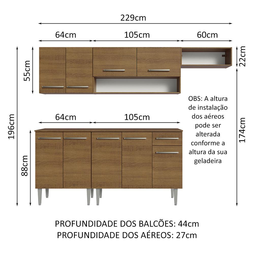 O Armário de Cozinha Emilly da Madesa une praticidade, funcionalidade e design atual, além de ser especialmente projetada para ambientes mais compactos, que exigem otimização dos espaços.Qualidade duradoura e ótimo custo-benefício: A cozinha possui fabricação com materiais de alta qualidade. Suas corrediças e dobradiças metálicas, puxadores com alumínio e pés reguláveis em PVC garantem maior durabilidade e resistência.Organização e estilo: Com uma boa divisão tanto interna quanto externa, essa cozinha facilita a organização dos objetos, tornando o espaço mais funcional e eficiente, com muito estilo e modernidade.Acabamento elegante e resistente: O acabamento é no padrão amadeirado Rustic, conferindo um visual super sofisticado. Feito com Pintura Poliéster ecológica, conta com sete camadas de proteção contra água e calor, além de preservar a beleza do móvel ao longo do tempo.Medidas totais: - 229 cm de largura- 186 cm de altura- 44 cm de profundidade no balcão e 27 cm de profundidade no aéreo e no paneleiroItens inclusos: - Um (1) Aéreo com duas (2) portas- Um (1) Aéreo com duas (2) portas e um (1) nicho- Um (1) Aéreo com nicho aberto- Um (1) Balcão com duas (2) portas e tampo- Um (1) Balcão com três (3) portas e uma (1) gaveta e tampoCódigo do produto: GREM2290145ZObs.: - Imagens meramente ilustrativas- A Madesa não disponibiliza serviço de montagem- O produto segue com manual e todas as ferragens necessárias para a instalação1 – O produto vem montado? Se não, vocês realizam a montagem?R.: A Madesa não disponibiliza serviço de montagem. Todos os produtos seguem com manual de instalação e as ferragens necessárias. Alguns produtos possuem vídeo explicando o passo a passo da montagem.2 – Vocês possuem loja física? Posso retirar meu produto em mãos?R.: Não possuímos loja física, apenas loja virtual. Confira as opções de envio ao colocar o seu CEP.A Madesa se dedica à sustentabilidade com várias iniciativas: temos uma usina própria para gerar energia que abastece uma de nossas fábricas. Selecionamos nossos fornecedores, priorizando aqueles que possuem um compromisso com a sustentabilidade e proteção do meio ambiente. Todo o plástico utilizado no setor produtivo é proveniente de reciclagem e as suas sobras são encaminhadas ao fornecedor que os recicla. Também investimos no desenvolvimento contínuo de nossos colaboradores e em ações educacionais que beneficiem a comunidade.