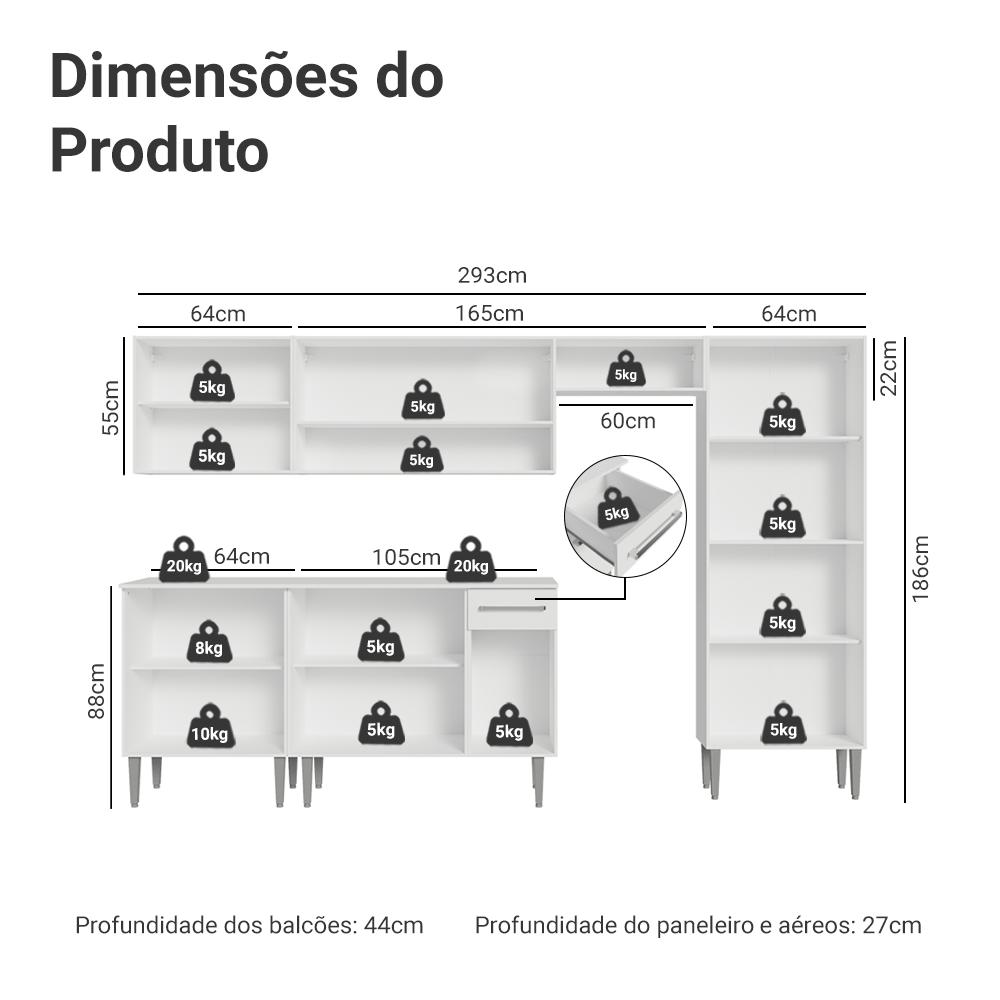 Um móvel moderno e prático, ideal para tornar seu ambiente funcional. Conheça o Armário de Cozinha Completa Emilly da Madesa.Qualidade acessível: Com excelente custo-benefício, fabricada com materiais duráveis, garantindo maior vida útil. Possui corrediças e dobradiças metálicas e pés ajustáveis em PVC.Mais espaço e organização: O móvel é composto por vários módulos separados, oferecendo amplo espaço e uma distribuição interna e externa ideal para organizar seus utensílios, alimentos e louças.Acabamento de alta resistência: Oferece uma proteção extra contra água e calor, mantendo a cor vibrante por mais tempo.Medidas totais:- 293 cm de largura- 186 cm de altura- 44 cm de profundidade nos balcões e 27 cm de profundidade nos aéreos e no paneleiroItens inclusos:- Um (1) Armário Aéreo de 64 cm com duas (2) portas- Um (1) Balcão de 64 cm com duas (2) portas e tampo- Um (1) Armário Aéreo de 164 cm com duas (2) portas e dois (2) nichos- Um (1) Balcão de 105 cm com três (3) portas, uma (1) gaveta e tampo- Um (1) Paneleiro de 65 cm com quatro (4) portasCódigo do produto: GREM29300109 Obs.:- Imagens meramente ilustrativas- Material: MDP- É obrigatório fixar o paneleiro na parede- A Madesa não disponibiliza serviço de montagem- O produto segue com manual e todas as ferragens necessárias para a instalaçãoA Madesa se dedica à sustentabilidade com várias iniciativas: temos uma usina própria para gerar energia que abastece uma de nossas fábricas. Selecionamos nossos fornecedores, priorizando aqueles que possuem um compromisso com a sustentabilidade e proteção do meio ambiente. Todo o plástico utilizado no setor produtivo é proveniente de reciclagem e as suas sobras são encaminhadas ao fornecedor que os recicla. Também investimos no desenvolvimento contínuo de nossos colaboradores e em ações educacionais que beneficiem a comunidade.