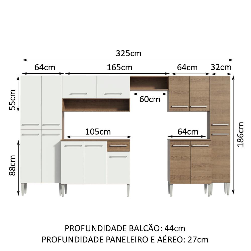 A Cozinha Emilly se destaca por ser completa e perfeita para o seu dia-a-dia. Conta com 15 portas, 1 gaveta e 2 nichos grandes com puxadores com alumínio e corrediças e dobradiças metálicas resistentes. Acompanha tampo de madeira de todos os balcões. Os pés são em PVC para facilitar a limpeza e reguláveis para nivelar pequenas imperfeições no piso.O acabamento é em Pintura Poliéster com 7 camadas de proteção que oferecem resistência contra os efeitos da água e do calor. Ela é dividida em seis módulos independentes: paneleiro duplo com quatro portas, balcão de pia, armário aéreo com duas portas e dois nichos, balcão de duas portas, armário aéreo de duas portas e paneleiro com duas portas.Os paneleiros e armários aéreos precisam ser fixados na parede.Medidas totais: 186 cm de altura x 325 cm de largura x 44 cm profundidade nos balcões inferiores e 27 cm nos paneleiros e nos aéreos.Imagem meramente ilustrativa: a decoração e o fogão não acompanham o produto.Itens inclusos:- Um (1) paneleiro duplo com 4 portas- Um (1) balcão de pia com 3 portas, 1 gaveta e tampo- Um (1) armário aéreo com 2 portas e 2 nichos grandes- Um (1) balcão com 2 portas- Um (1) armário aéreo com 2 portas- Um (1) paneleiro com 2 portasObs.: A Madesa não disponibiliza serviço de montagem. O produto segue com manual de instalação e todas as ferragens necessárias para sua montagem.1-O produto é novo ou usado?R.: Todos os produtos da Madesa são novos, enviados da nossa fábrica diretamente para as casas de nossos clientes.2-O produto vem montado? Se não, vocês realizam a montagem?R.: A Madesa não disponibiliza serviço de montagem. Todos os produtos seguem com manual de instalação e as ferragens necessárias. Alguns produtos possuem vídeo explicando o passo a passo da montagem.3-Vocês possuem loja física? Posso retirar meu produto em mãos?R.: Não possuímos loja física, apenas loja virtual. Confira as opções de envio ao colocar o seu CEP.4-Qual é o valor do envio? Posso pagar separadamente?R.: O valor do envio é calculado com base no peso e volume do produto, e no CEP de destino. Você pode calcular o valor e prazo de entrega no simulador.5-A Madesa entrega em todo Brasil? Como é feita a entrega?R.: Sim, entregamos no Brasil inteiro através de transportadoras parceiras.6-O produto acompanha Nota Fiscal?R.: Sim, todos os produtos são entregues com suas respectivas notas fiscais.7-Os produtos possuem garantia?R.: Sim. A Madesa oferece 3 meses de garantia para defeitos de fabricação.A Madesa se dedica à sustentabilidade com várias iniciativas: temos uma usina própria para gerar energia que abastece uma de nossas fábricas. Selecionamos nossos fornecedores, priorizando aqueles que possuem um compromisso com a sustentabilidade e proteção do meio ambiente. Todo o plástico utilizado no setor produtivo é proveniente de reciclagem e as suas sobras são encaminhadas ao fornecedor que os recicla. Também investimos no desenvolvimento contínuo de nossos colaboradores e em ações educacionais que beneficiem a comunidade.