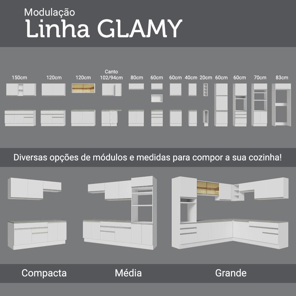 Uma opção moderna, pensada para ambientes compactos e que necessitam de total aproveitamento do espaço. Confira esta cozinha da linha Glamy da Madesa.A modulação é composta por um balcão para pia e um armário aéreo. Super espaçosos e com ótimo tamanho, são perfeitos para organizar todos os utensílios e louças da sua cozinha.Fabricada com itens de qualidade, possui puxadores com perfil total em alumínio, dobradiças que amortecem o fechamento das portas e corrediças telescópicas que permitem a abertura total das gavetas.Outro diferencial desta cozinha são os pés reguláveis em PVC e os rodapés removíveis em MDP, que facilitam a limpeza. O balcão comporta pias de inox ou pedra, no espaço de 150 x 52 cm.O acabamento branco é feito em Pintura Poliéster com 7 camadas de proteção resistentes a álcool, água e calor.Esta cozinha pode ser complementada pelos módulos avulsos da linha Glamy da Madesa.Medidas totais:- 225 cm de altura- 150 cm de largura- 52 cm de profundidade no balcão e 31 cm no aéreoItens inclusos:- Um (1) Balcão de Pia de 150 cm de largura com duas (2) portas e duas (2) gavetas, sendo uma maior (Não acompanha tampo.)- Um (1) Armário Aéreo de 150 cm com duas (2) portas e dois (2) nichos centraisCódigo do produto: GRGL15000209Obs.:- Imagens meramente ilustrativas: os eletros, o tampo da pia, a torneira e a decoração não acompanham o produto- A Madesa não disponibiliza serviço de montagem- O produto segue com manual e todas as ferragens necessárias para sua montagem1 – O produto é novo ou usado?R.: Todos os produtos da Madesa são novos, enviados da nossa fábrica diretamente para as casas de nossos clientes.2 – O produto vem montado? Se não, vocês realizam a montagem?R.: A Madesa não disponibiliza serviço de montagem. Todos os produtos seguem com manual de instalação e as ferragens necessárias. Alguns produtos possuem vídeo explicando o passo a passo da montagem.3 – Vocês possuem loja física? Posso retirar meu produto em mãos?R.: Não possuímos loja física, apenas loja virtual. Confira as opções de envio ao colocar o seu CEP.4 – Qual é o valor do envio? Posso pagar separadamente?R.: O valor do envio é calculado com base no peso e volume do produto, e no CEP de destino. Você pode calcular o valor e prazo de entrega no simulador.5 – A Madesa entrega em todo Brasil? Como é feita a entrega?R.: Sim, entregamos no Brasil inteiro através de transportadoras parceiras.6 – O produto acompanha Nota Fiscal?R.: Sim, todos os produtos são entregues com suas respectivas notas fiscais.7 – Os produtos possuem garantia?R.: Sim. A Madesa oferece 3 meses de garantia para defeitos de fabricação.A Madesa se dedica à sustentabilidade com várias iniciativas: temos uma usina própria para gerar energia que abastece uma de nossas fábricas. Selecionamos nossos fornecedores, priorizando aqueles que possuem um compromisso com a sustentabilidade e proteção do meio ambiente. Todo o plástico utilizado no setor produtivo é proveniente de reciclagem e as suas sobras são encaminhadas ao fornecedor que os recicla. Também investimos no desenvolvimento contínuo de nossos colaboradores e em ações educacionais que beneficiem a comunidade.