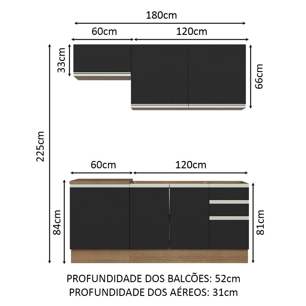 Esta Cozinha Compacta da linha Glamy da Madesa vai deixar sua casa mais moderna e sofisticada, fazendo parte de momentos especiais do dia a dia da sua família.Fabricada com materiais de muita qualidade, a cozinha possui gavetas com corrediças telescópicas e todas as portas contam com amortecedores para o fechamento suave. Além disso, os puxadores são com perfil total em alumínio, mais resistentes ao uso diário.A cozinha é formada por módulos separados e bem distribuídos, criando um ótimo espaço para guardar alimentos e utensílios, se tornando uma cozinha planejada para sua casa.O balcão de pia comporta pias de inox ou pedra no tamanho de 120 cm x 52 cm e não acompanha tampo. O balcão de 60 cm acompanha tampo de MDP.Para completar, todos os módulos inferiores possuem pés reguláveis em PVC e rodapé removível em MDP com encaixe fácil para retirar na hora da limpeza.O acabamento da estrutura é no padrão amadeirado Rustic e as portas e frentes são pretas. Feito em Pintura Poliéster ecológica, com aplicação de 7 camadas de proteção resistentes a álcool, água e calor.Esta cozinha pode ser complementada pelos módulos avulsos da linha Glamy da Madesa.Medidas totais:- 225 cm de altura- 180 cm de largura- 52 cm de profundidade nos balcões e 31 cm nos aéreosItens inclusos:- Um (1) Armário Aéreo de 60 cm com uma (1) porta basculante- Um (1) Armário Aéreo de 120 cm com duas (2) portas- Um (1) Balcão de 60 cm com (1) uma porta e tampo- Um (1) Balcão de 120 cm com três (3) gavetas e duas (2) portas (Não acompanha tampo.)Código do produto: GRGL1800077KObs.:- As imagens são meramente ilustrativas, a pia, os eletros e a decoração não acompanham o produto- A Madesa não disponibiliza serviço de montagem- O produto segue com manual e todas as ferragens necessárias para a instalação1 – O produto é novo ou usado?R.: Todos os produtos da Madesa são novos, enviados da nossa fábrica diretamente para as casas de nossos clientes.2 – O produto vem montado? Se não, vocês realizam a montagem?R.: A Madesa não disponibiliza serviço de montagem. Todos os produtos seguem com manual de instalação e as ferragens necessárias. Alguns produtos possuem vídeo explicando o passo a passo da montagem.3 – Vocês possuem loja física? Posso retirar meu produto em mãos?R.: Não possuímos loja física, apenas loja virtual. Confira as opções de envio ao colocar o seu CEP.4 – Qual é o valor do envio? Posso pagar separadamente?R.: O valor do envio é calculado com base no peso e volume do produto, e no CEP de destino. Você pode calcular o valor e prazo de entrega no simulador.5 – A Madesa entrega em todo Brasil? Como é feita a entrega?R.: Sim, entregamos no Brasil inteiro através de transportadoras parceiras.6 – O produto acompanha Nota Fiscal?R.: Sim, todos os produtos são entregues com suas respectivas notas fiscais.7 – Os produtos possuem garantia?R.: Sim. A Madesa oferece 3 meses de garantia para defeitos de fabricação.A Madesa se dedica à sustentabilidade com várias iniciativas: temos uma usina própria para gerar energia que abastece uma de nossas fábricas. Selecionamos nossos fornecedores, priorizando aqueles que possuem um compromisso com a sustentabilidade e proteção do meio ambiente. Todo o plástico utilizado no setor produtivo é proveniente de reciclagem e as suas sobras são encaminhadas ao fornecedor que os recicla. Também investimos no desenvolvimento contínuo de nossos colaboradores e em ações educacionais que beneficiem a comunidade.