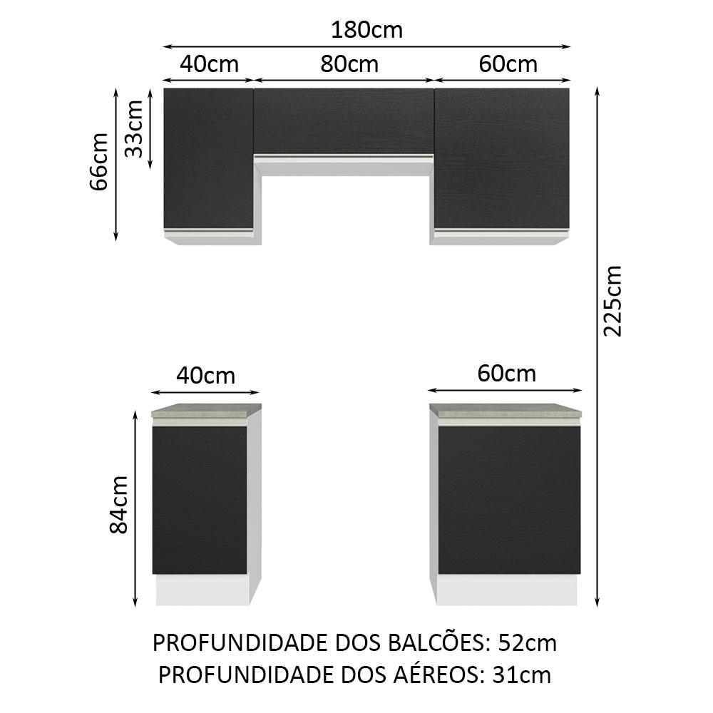 Para uma cozinha mais confortável e funcional, uma excelente opção é o Armário de Cozinha Compacta Glamy da Madesa.Este móvel possui puxadores em alumínio, amortecedores para fechamento suave das portas e corrediças telescópicas que permitem a abertura total das gavetas. Além disso, tem pés reguláveis em PVC e rodapé removível em MDP.A cozinha é composta por módulos avulsos e bem divididos, proporcionando um bom espaço para armazenar utensílios e alimentos. Adicionalmente, é possível instalar uma pia de inox ou pedra no balcão, com as medidas de 120 x 52 cm.Para completar, o acabamento da estrutura é branco e o das portas e frentes é preto. Feita com 7 camadas de Pintura Poliéster, o que garante uma proteção eficiente contra os efeitos da água e do calor.Medidas totais:- 225 cm de altura- 180 cm de largura- 52 cm no balcão e 31 cm nos aéreosItens inclusos:- Um (1) Aéreo de 40 cm com uma (1) porta- Um (1) Balcão de 40 cm com uma (1) porta e tampo- Um (1) Aéreo de 80 cm com uma (1) porta basculante- Um (1) Aéreo de 60 cm com uma (1) porta- Um (1) Balcão de 60 cm com uma (1) porta e tampoCódigo do produto: GRGL18001273Obs.:- Imagens meramente ilustrativas, os eletros, o tampo da pia, a torneira e a decoração não acompanham o produto- A Madesa não disponibiliza serviço de montagem, o produto segue com manual e todas as ferragens necessárias para a instalaçãoA Madesa se dedica à sustentabilidade com várias iniciativas: temos uma usina própria para gerar energia que abastece uma de nossas fábricas. Selecionamos nossos fornecedores, priorizando aqueles que possuem um compromisso com a sustentabilidade e proteção do meio ambiente. Todo o plástico utilizado no setor produtivo é proveniente de reciclagem e as suas sobras são encaminhadas ao fornecedor que os recicla. Também investimos no desenvolvimento contínuo de nossos colaboradores e em ações educacionais que beneficiem a comunidade.