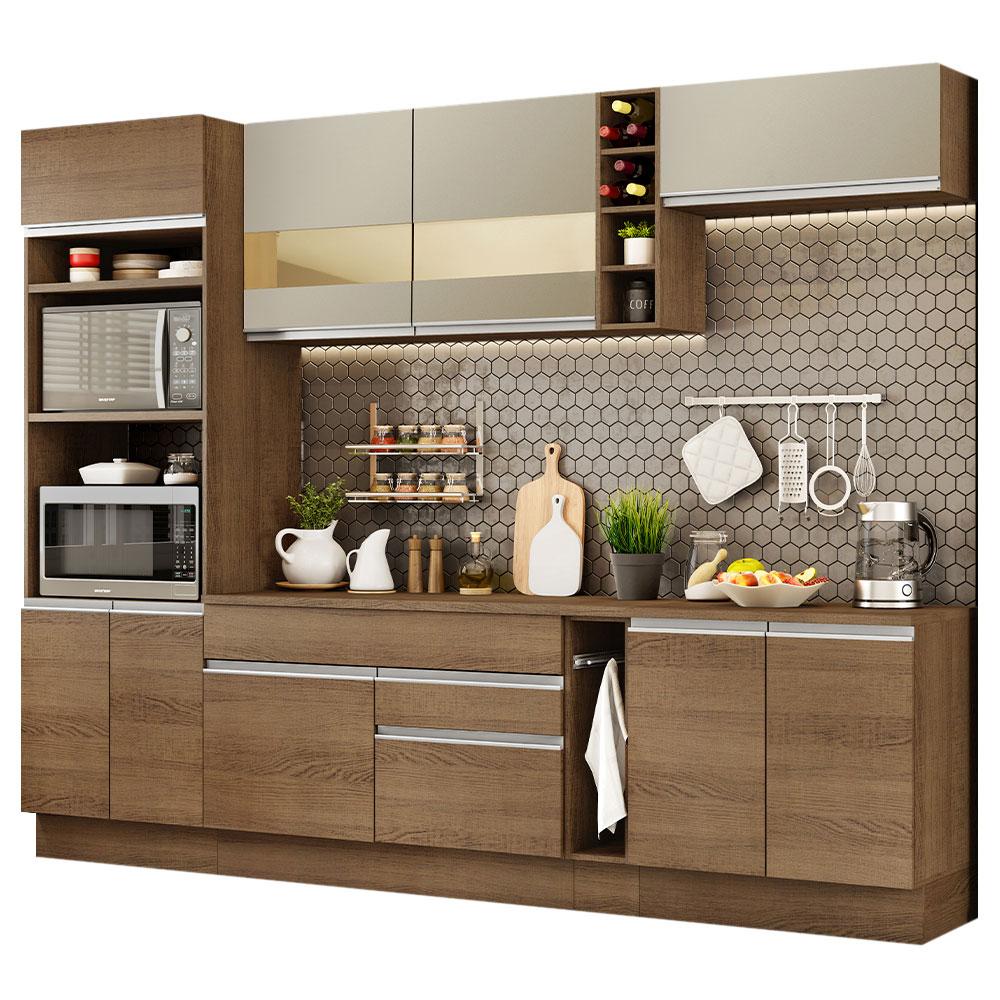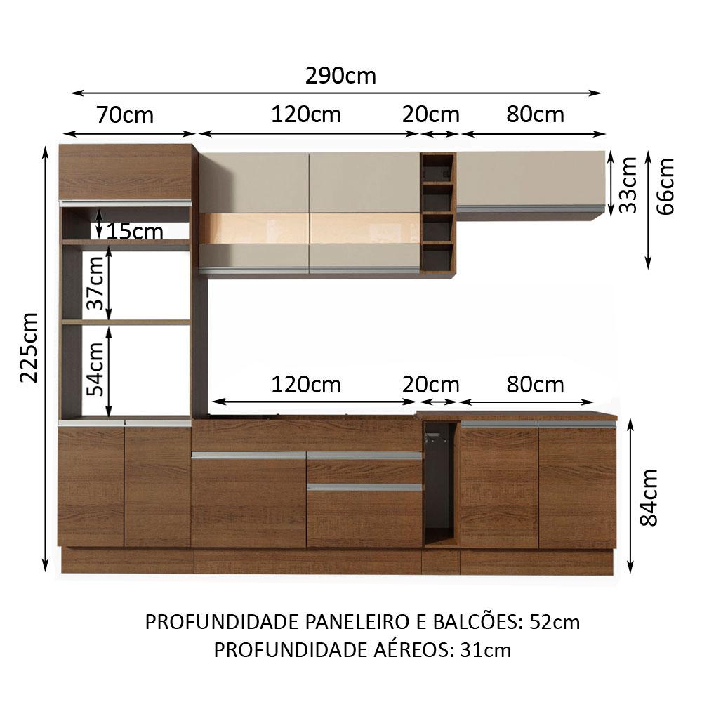 A Cozinha Vicenza Glamy é a campeã de vendas da Madesa. Uma cozinha completa com design moderno e um ótimo acabamento. Se destaca por parecer uma cozinha planejada com ótimo aproveitamento dos espaços internos.As gavetas possuem corrediças telescópicas e todas as portas possuem amortecedor para o fechamento suave. Esses itens de qualidade superior conferem durabilidade e maior vida útil do móvel.Outro grande diferencial desta cozinha é a profundidade maior, como uma cozinha planejada: 52 cm no balcão inferior e 31 cm nos aéreos. As medidas totais são: 290 cm de largura e 225 cm de altura.O balcão de pia comporta pias de 120 cm x 52 cm e acompanha tampo em MDP no padrão amadeirado Rustic. Já o balcão menor segue com tampo de 80 cm x 52 cm que pode ser recortado para a colocação do cooktop. A torre possui espaço para forno e micro-ondas e permite a instalação de forno embutido.Possui também pés reguláveis e rodapé removível. Para completar, os aéreos em pintura Crema com detalhe em vidro reflex conferem muita elegância ao ambiente.Esta cozinha pode ser complementada pelos módulos avulsos da linha Glamy da Madesa.(Imagens meramente ilustrativas: a decoração não acompanha o produto.)Itens inclusos:- Uma (1) torre-quente com dois (2) nichos para forno e micro-ondas e três (3) portas sendo uma (1) basculante- Um (1) balcão de pia com duas (2) gavetas e uma (1) porta e tampo em MDP- Um (1) porta panos- Um (1) balcão com duas (2) portas e tampo em MDP- Um (1) aéreo com duas (2) portas com detalhe em vidro reflex- Um (1) aéreo com uma (1) porta basculante- Uma (1) adegaCódigo do produto: GRGL2900119YObs.: A Madesa não disponibiliza serviço de montagem. O produto segue com manual de instalação e todas as ferragens necessárias para sua montagem.1-O produto é novo ou usado?R.: Todos os produtos da Madesa são novos, enviados da nossa fábrica diretamente para as casas de nossos clientes.2-O produto vem montado? Se não, vocês realizam a montagem?R.: A Madesa não disponibiliza serviço de montagem. Todos os produtos seguem com manual de instalação e as ferragens necessárias. Alguns produtos possuem vídeo explicando o passo a passo da montagem.3-Vocês possuem loja física? Posso retirar meu produto em mãos?R.: Não possuímos loja física, apenas loja virtual. Confira as opções de envio ao colocar o seu CEP.4-Qual é o valor do envio? Posso pagar separadamente?R.: O valor do envio é calculado com base no peso e volume do produto, e no CEP de destino. Você pode calcular o valor e prazo de entrega no simulador.5-A Madesa entrega em todo Brasil? Como é feita a entrega?R.: Sim, entregamos no Brasil inteiro através de transportadoras parceiras.6-O produto acompanha Nota Fiscal?R.: Sim, todos os produtos são entregues com suas respectivas notas fiscais.7-Os produtos possuem garantia?R.: Sim. A Madesa oferece 3 meses de garantia para defeitos de fabricação.A Madesa se dedica à sustentabilidade com várias iniciativas: temos uma usina própria para gerar energia que abastece uma de nossas fábricas. Selecionamos nossos fornecedores, priorizando aqueles que possuem um compromisso com a sustentabilidade e proteção do meio ambiente. Todo o plástico utilizado no setor produtivo é proveniente de reciclagem e as suas sobras são encaminhadas ao fornecedor que os recicla. Também investimos no desenvolvimento contínuo de nossos colaboradores e em ações educacionais que beneficiem a comunidade.