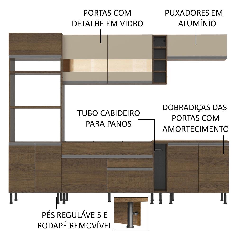 A Cozinha Vicenza Glamy é a campeã de vendas da Madesa. Uma cozinha completa com design moderno e um ótimo acabamento. Se destaca por parecer uma cozinha planejada com ótimo aproveitamento dos espaços internos.As gavetas possuem corrediças telescópicas e todas as portas possuem amortecedor para o fechamento suave. Esses itens de qualidade superior conferem durabilidade e maior vida útil do móvel.Outro grande diferencial desta cozinha é a profundidade maior, como uma cozinha planejada: 52 cm no balcão inferior e 31 cm nos aéreos. As medidas totais são: 290 cm de largura e 225 cm de altura.O balcão de pia comporta pias de 120 cm x 52 cm e acompanha tampo em pintura Mood. Já o balcão menor segue com tampo de 80 cm x 52 cm que pode ser recortado para a colocação do cooktop. A torre possui espaço para forno e micro-ondas e permite a instalação de forno embutido.Possui também pés reguláveis e rodapé removível. Para completar, os aéreos em pintura Crema com detalhe em vidro reflex conferem muita elegância ao ambiente.Esta cozinha pode ser complementada pelos módulos avulsos da linha Glamy da Madesa.(Imagem ilustrativa: a decoração não acompanha o produto.)Itens inclusos:- Uma (1) torre-quente com dois (2) nichos para forno e micro-ondas e três (3) portas sendo uma (1) basculante- Um (1) balcão de pia com duas (2) gavetas e uma (1) porta e tampo em MDP- Um (1) porta panos- Um (1) balcão com duas (2) portas e tampo em MDP- Um (1) aéreo com duas (2) portas com detalhe em vidro reflex- Um (1) aéreo com uma (1) porta basculante- Uma (1) adegaCódigo do produto: GRGL2900119YMLSRObs.: A Madesa não disponibiliza serviço de montagem. O produto segue com manual de instalação e todas as ferragens necessárias para sua montagem.1-O produto é novo ou usado?R.: Todos os produtos da Madesa são novos, enviados da nossa fábrica diretamente para as casas de nossos clientes.2-O produto vem montado? Se não, vocês realizam a montagem?R.: A Madesa não disponibiliza serviço de montagem. Todos os produtos seguem com manual de instalação e as ferragens necessárias. Alguns produtos possuem vídeo explicando o passo a passo da montagem.3-Vocês possuem loja física? Posso retirar meu produto em mãos?R.: Não possuímos loja física, apenas loja virtual. Confira as opções de envio ao colocar o seu CEP.4-Qual é o valor do envio? Posso pagar separadamente?R.: O valor do envio é calculado com base no peso e volume do produto, e no CEP de destino. Você pode calcular o valor e prazo de entrega no simulador.5-A Madesa entrega em todo Brasil? Como é feita a entrega?R.: Sim, entregamos no Brasil inteiro através de transportadoras parceiras.6-O produto acompanha Nota Fiscal?R.: Sim, todos os produtos são entregues com suas respectivas notas fiscais.7-Os produtos possuem garantia?R.: Sim. A Madesa oferece 3 meses de garantia para defeitos de fabricação.A Madesa se dedica à sustentabilidade com várias iniciativas: temos uma usina própria para gerar energia que abastece uma de nossas fábricas. Selecionamos nossos fornecedores, priorizando aqueles que possuem um compromisso com a sustentabilidade e proteção do meio ambiente. Todo o plástico utilizado no setor produtivo é proveniente de reciclagem e as suas sobras são encaminhadas ao fornecedor que os recicla. Também investimos no desenvolvimento contínuo de nossos colaboradores e em ações educacionais que beneficiem a comunidade.