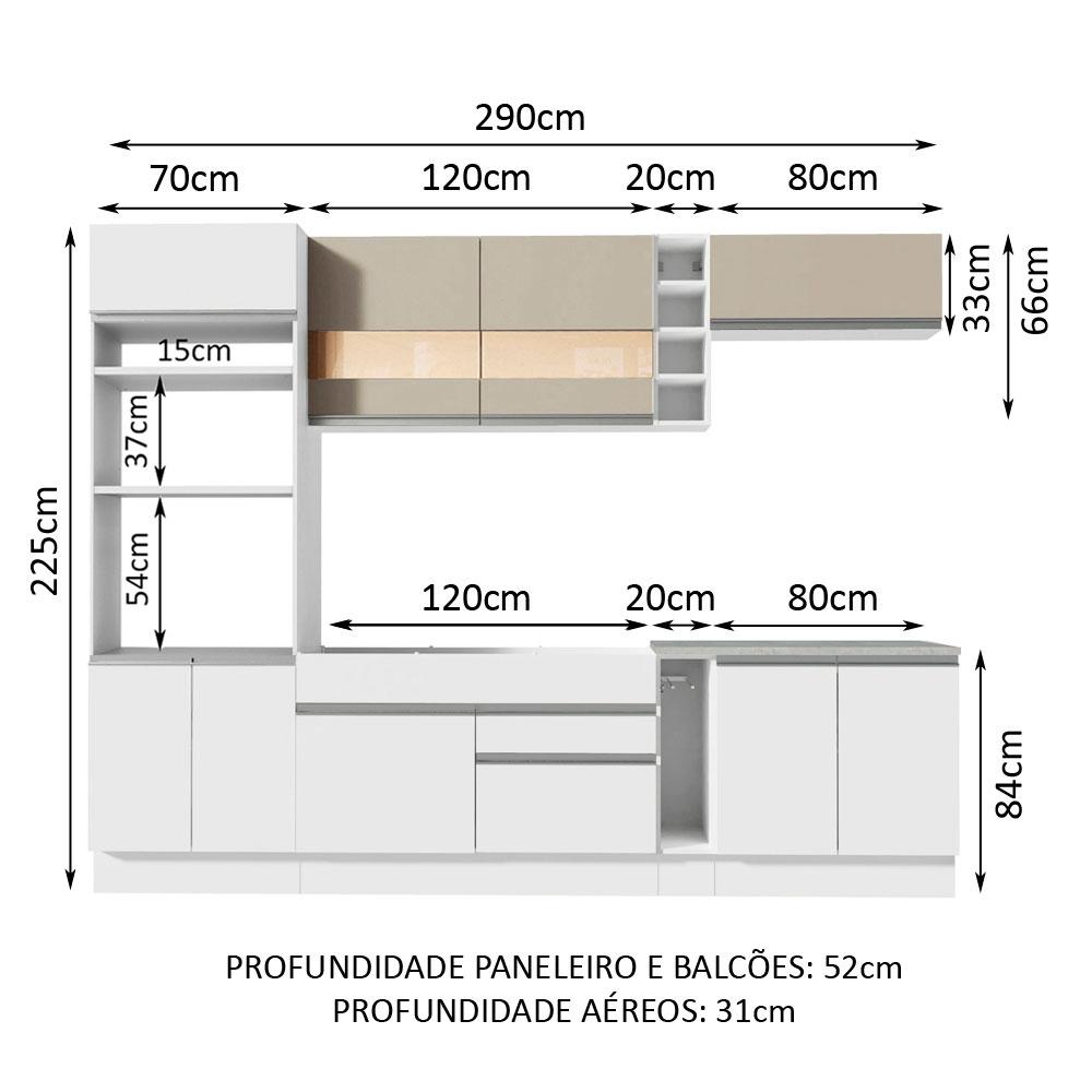 A Cozinha Vicenza Glamy é a campeã de vendas da Madesa. Uma cozinha completa com design moderno e um ótimo acabamento. Se destaca por parecer uma cozinha planejada com ótimo aproveitamento dos espaços internos.As gavetas possuem corrediça telescópica e todas as portas possuem amortecedor para o fechamento suave. Esses itens de qualidade superior conferem durabilidade e maior vida útil do móvel.Outro grande diferencial desta cozinha é a profundidade maior, como uma cozinha planejada: 52 cm no balcão inferior e 31 cm nos aéreos. As medidas totais são: 290 cm de largura e 225 cm de altura.O balcão de pia comporta pias de 120 cm x 52 cm e acompanha tampo em pintura Mood. Já o balcão menor segue com tampo de 80 cm x 52 cm que pode ser recortado para a colocação do cooktop. A torre possui espaço para forno e micro-ondas e permite a instalação de forno embutido.Possui também pés reguláveis e rodapé removível. Para completar, os aéreos em pintura Crema com detalhe em vidro reflex conferem muita elegância ao ambiente.O acabamento de toda a cozinha é branco, com exceção das portas dos aéreos, que possuem pintura Crema. O processo é feito em Poliéster Protetor ecológico de alta resistência, que protege o móvel dos efeitos da água, do álcool e do calor.Esta cozinha pode ser complementada pelos módulos avulsos da linha Glamy da Madesa.(Imagens meramente ilustrativas: a decoração não acompanha o produto.)Itens inclusos:- Um (1) porta fornos com dois (2) nichos para forno e micro-ondas e três (3) portas sendo uma (1) basculante- Um (1) balcão de pia com duas (2) gavetas e uma (1) porta e tampo em MDP- Um (1) porta panos- Um (1) balcão com duas (2) portas e tampo em MDP- Um (1) aéreo com duas (2) portas com detalhe em vidro- Um (1) aéreo com uma (1) porta basculante- Uma (1) mini adegaCódigo do produto: GRGL290011A5Obs.: A Madesa não disponibiliza serviço de montagem. O produto segue com manual de instalação e todas as ferragens necessárias para sua montagem.1-O produto é novo ou usado?R.: Todos os produtos da Madesa são novos, enviados da nossa fábrica diretamente para as casas de nossos clientes.2-O produto vem montado? Se não, vocês realizam a montagem?R.: A Madesa não disponibiliza serviço de montagem. Todos os produtos seguem com manual de instalação e as ferragens necessárias. Alguns produtos possuem vídeo explicando o passo a passo da montagem.3-Vocês possuem loja física? Posso retirar meu produto em mãos?R.: Não possuímos loja física, apenas loja virtual. Confira as opções de envio ao colocar o seu CEP.4-Qual é o valor do envio? Posso pagar separadamente?R.: O valor do envio é calculado com base no peso e volume do produto, e no CEP de destino. Você pode calcular o valor e prazo de entrega no simulador.5-A Madesa entrega em todo Brasil? Como é feita a entrega?R.: Sim, entregamos no Brasil inteiro através de transportadoras parceiras.6-O produto acompanha Nota Fiscal?R.: Sim, todos os produtos são entregues com suas respectivas notas fiscais.7-Os produtos possuem garantia?R.: Sim. A Madesa oferece 3 meses de garantia para defeitos de fabricação.A Madesa se dedica à sustentabilidade com várias iniciativas: temos uma usina própria para gerar energia que abastece uma de nossas fábricas. Selecionamos nossos fornecedores, priorizando aqueles que possuem um compromisso com a sustentabilidade e proteção do meio ambiente. Todo o plástico utilizado no setor produtivo é proveniente de reciclagem e as suas sobras são encaminhadas ao fornecedor que os recicla. Também investimos no desenvolvimento contínuo de nossos colaboradores e em ações educacionais que beneficiem a comunidade.