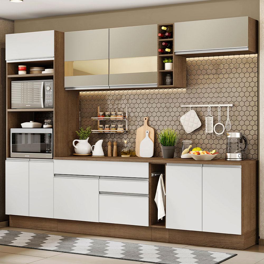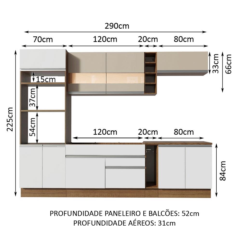 A Cozinha Vicenza Glamy é a campeã de vendas da Madesa. Uma cozinha completa com design moderno e um ótimo acabamento. Se destaca por parecer uma cozinha planejada com ótimo aproveitamento dos espaços internos.As gavetas possuem corrediça telescópica e todas as portas possuem amortecedor para o fechamento suave. Esses itens de qualidade superior conferem durabilidade e maior vida útil do móvel.Outro grande diferencial desta cozinha é a profundidade maior, como uma cozinha planejada: 52 cm no balcão inferior e 31 cm nos aéreos. As medidas totais são: 290 cm de largura e 225 cm de altura.O balcão de pia comporta pias de 120 cm x 52 cm e acompanha tampo em pintura amadeirado Rustic. Já o balcão menor segue com tampo de 80 cm x 52 cm que pode ser recortado para a colocação do cooktop. A torre possui espaço para forno e micro-ondas e permite a instalação de forno embutido.Possui também pés reguláveis e rodapé removível. Para completar, os aéreos em pintura Crema com detalhe em vidro reflex conferem muita elegância ao ambiente.O acabamento da estrutura da cozinha é no padrão amadeirado Rustic. As portas da torre e do balcão e as frentes das gavetas são brancas. As portas dos aéreos são em pintura Crema. O processo é feito em Poliéster Protetor ecológico de alta resistência, que protege o móvel dos efeitos da água, do álcool e do calor.Esta cozinha pode ser complementada pelos módulos avulsos da linha Glamy da Madesa.(Imagens meramente ilustrativas: a decoração não acompanha o produto.)Itens inclusos:- Um (1) porta fornos com dois (2) nichos para forno e micro-ondas e três (3) portas sendo uma (1) basculante- Um (1) balcão de pia com duas (2) gavetas e uma (1) porta e tampo em MDP- Um (1) porta panos- Um (1) balcão com duas (2) portas e tampo em MDP- Um (1) aéreo com duas (2) portas com detalhe em vidro reflex- Um (1) aéreo com uma (1) porta basculante- Uma (1) mini adegaCódigo do produto: GRGL290011A7Obs.: A Madesa não disponibiliza serviço de montagem. O produto segue com manual de instalação e todas as ferragens necessárias para sua montagem.1-O produto é novo ou usado?R.: Todos os produtos da Madesa são novos, enviados da nossa fábrica diretamente para as casas de nossos clientes.2-O produto vem montado? Se não, vocês realizam a montagem?R.: A Madesa não disponibiliza serviço de montagem. Todos os produtos seguem com manual de instalação e as ferragens necessárias. Alguns produtos possuem vídeo explicando o passo a passo da montagem.3-Vocês possuem loja física? Posso retirar meu produto em mãos?R.: Não possuímos loja física, apenas loja virtual. Confira as opções de envio ao colocar o seu CEP.4-Qual é o valor do envio? Posso pagar separadamente?R.: O valor do envio é calculado com base no peso e volume do produto, e no CEP de destino. Você pode calcular o valor e prazo de entrega no simulador.5-A Madesa entrega em todo Brasil? Como é feita a entrega?R.: Sim, entregamos no Brasil inteiro através de transportadoras parceiras.6-Os produtos possuem garantia?R.: Sim. A Madesa oferece 3 meses de garantia para defeitos de fabricação.A Madesa se dedica à sustentabilidade com várias iniciativas: temos uma usina própria para gerar energia que abastece uma de nossas fábricas. Selecionamos nossos fornecedores, priorizando aqueles que possuem um compromisso com a sustentabilidade e proteção do meio ambiente. Todo o plástico utilizado no setor produtivo é proveniente de reciclagem e as suas sobras são encaminhadas ao fornecedor que os recicla. Também investimos no desenvolvimento contínuo de nossos colaboradores e em ações educacionais que beneficiem a comunidade.