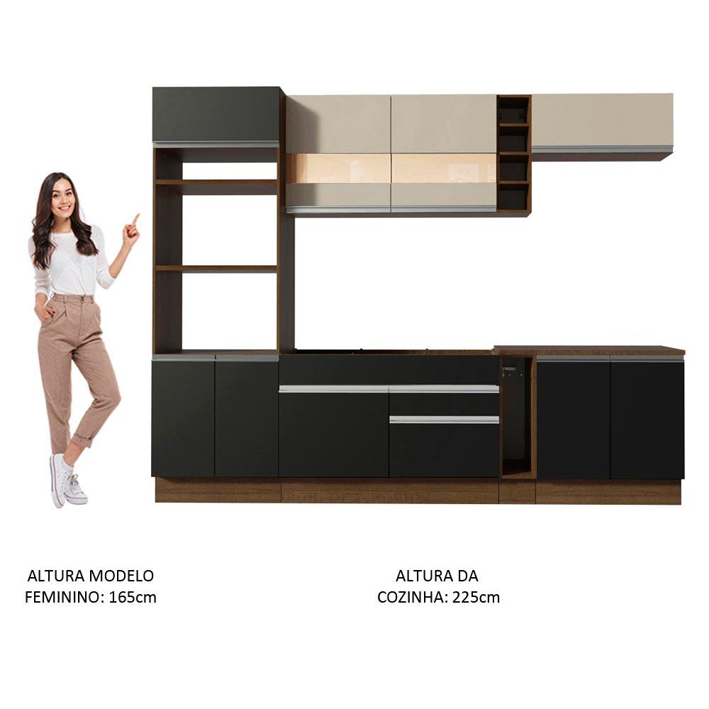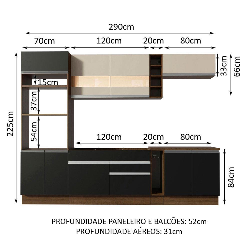 A Cozinha Vicenza Glamy é a campeã de vendas da Madesa. Uma cozinha completa com design moderno e um ótimo acabamento. Se destaca por parecer uma cozinha planejada com ótimo aproveitamento dos espaços internos.As gavetas possuem corrediças telescópicas e todas as portas possuem amortecedor para o fechamento suave. Esses itens de qualidade superior conferem durabilidade e maior vida útil do móvel.Outro grande diferencial desta cozinha é a profundidade maior, como uma cozinha planejada: 52 cm no balcão inferior e 31 cm nos aéreos. As medidas totais são: 290 cm de largura e 225 cm de altura.O balcão maior comporta pias de 120 cm x 52 cm e acompanha tampo em MDP no padrão amadeirado Rustic. Já o balcão menor segue com tampo de 80 cm x 52 cm que pode ser recortado para a colocação do cooktop. Todos os módulos inferiores possuem também pés reguláveis e o rodapé é removível para facilitar a limpeza. A torre possui espaço para forno e micro-ondas e permite a instalação de forno embutido.O acabamento da estrutura é no padrão amadeirado Rustic. As portas da torre e do balcão e as frentes das gavetas são pretas. As portas dos aéreos são em pintura Crema e a parte interna das costas e das gavetas é em pintura branca. O processo é feito em Pintura Poliéster ecológica de alta resistência, que aumenta a qualidade e durabilidade do produto.Esta cozinha pode ser complementada pelos módulos avulsos da linha Glamy da Madesa.(Imagens meramente ilustrativas: a decoração não acompanha o produto.)Itens inclusos:- Uma (1) torre-quente com dois (2) nichos para forno e micro-ondas e três (3) portas sendo uma (1) basculante- Um (1) balcão de pia com duas (2) gavetas e uma (1) porta e tampo em MDP- Um (1) porta panos- Um (1) balcão com duas (2) portas e tampo em MDP- Um (1) aéreo com duas (2) portas com detalhe em vidro reflex- Um (1) aéreo com uma (1) porta basculante- Uma (1) adegaCódigo do produto: GRGL290015C3Obs.: A Madesa não disponibiliza serviço de montagem. O produto segue com manual de instalação e todas as ferragens necessárias para sua montagem.1-O produto é novo ou usado?R.: Todos os produtos da Madesa são novos, enviados da nossa fábrica diretamente para as casas de nossos clientes.2-O produto vem montado? Se não, vocês realizam a montagem?R.: A Madesa não disponibiliza serviço de montagem. Todos os produtos seguem com manual de instalação e as ferragens necessárias. Alguns produtos possuem vídeo explicando o passo a passo da montagem.3-Vocês possuem loja física? Posso retirar meu produto em mãos?R.: Não possuímos loja física, apenas loja virtual. Confira as opções de envio ao colocar o seu CEP.4-Qual é o valor do envio? Posso pagar separadamente?R.: O valor do envio é calculado com base no peso e volume do produto, e no CEP de destino. Você pode calcular o valor e prazo de entrega no simulador.5-A Madesa entrega em todo Brasil? Como é feita a entrega?R.: Sim, entregamos no Brasil inteiro através de transportadoras parceiras.6-Os produtos possuem garantia?R.: Sim. A Madesa oferece 3 meses de garantia para defeitos de fabricação.A Madesa se dedica à sustentabilidade com várias iniciativas: temos uma usina própria para gerar energia que abastece uma de nossas fábricas. Selecionamos nossos fornecedores, priorizando aqueles que possuem um compromisso com a sustentabilidade e proteção do meio ambiente. Todo o plástico utilizado no setor produtivo é proveniente de reciclagem e as suas sobras são encaminhadas ao fornecedor que os recicla. Também investimos no desenvolvimento contínuo de nossos colaboradores e em ações educacionais que beneficiem a comunidade.