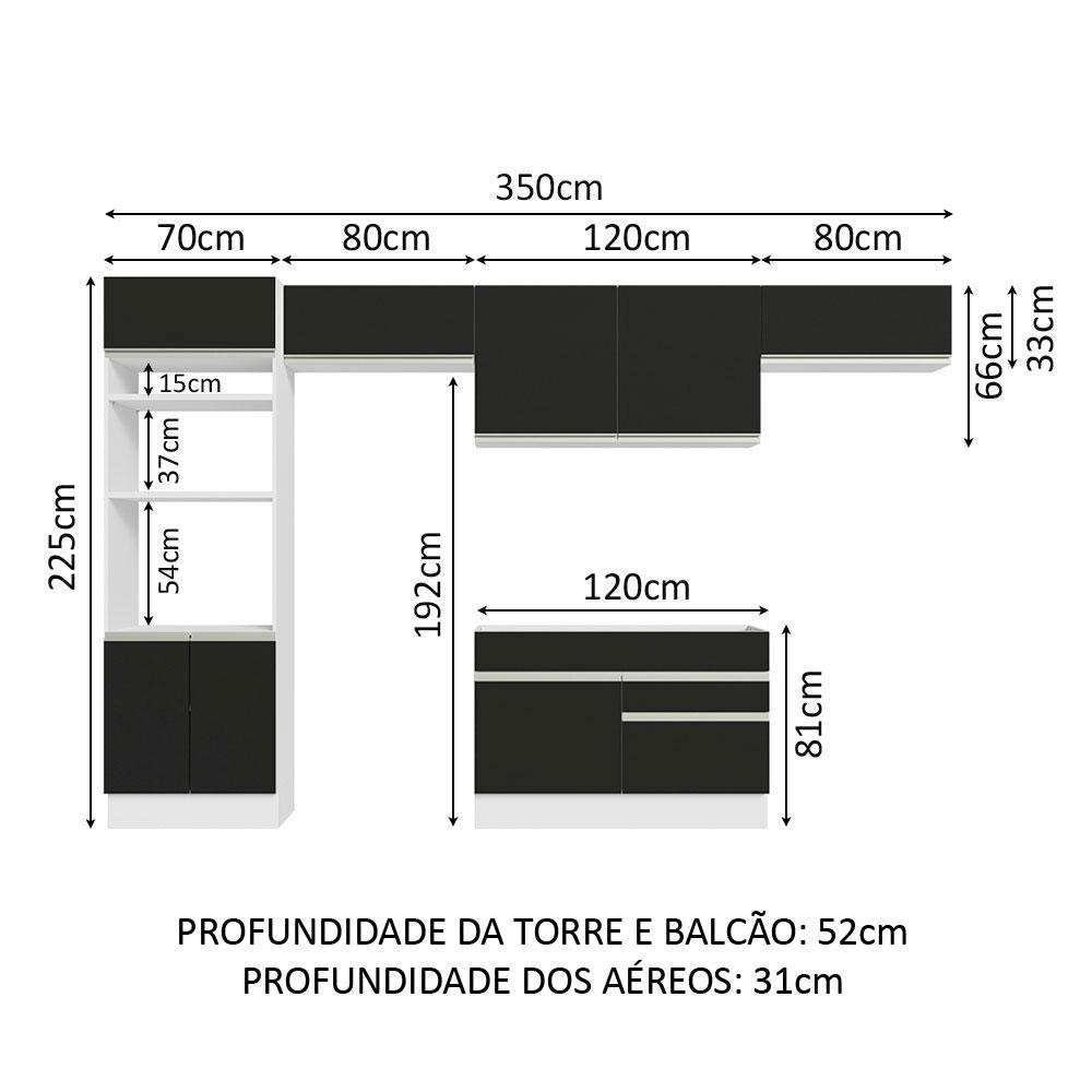Com todo o conforto e modernidade da Cozinha Completa Glamy da Madesa você vai amar ainda mais a sua casa.A qualidade do móvel é garantida: conta com puxadores em alumínio, gavetas com corrediças telescópicas de abertura total, portas com amortecimento e pistão a gás para as portas basculantes.Super espaçosa, a cozinha é composta por diversos módulos avulsos, que podem ser dispostos conforme a necessidade do seu ambiente. Assim, se torna uma cozinha planejada para seu espaço.Outro diferencial é que o balcão possibilita a colocação de pias de inox ou pedra, no tamanho de 120 cm x 52 cm. Além disso, a torre possui espaço para forno e micro-ondas.Para completar, a cozinha conta com pés reguláveis em PVC e rodapé removível em MDP de fácil encaixe, para retirar na hora de realizar a limpeza.O acabamento da estrutura é branco e as portas e frentes são pretas. É feito em Pintura Poliéster ecológica com sete camadas, que destaca a tonalidade e protege o móvel.Medidas totais:- 225 cm de altura- 350 cm de largura- 52 cm nos módulos inferiores e 31 cm nos aéreosItens inclusos:- Uma (1) Torre Quente de 70 cm com três (3) portas e (3) nichos- Dois (2) Aéreos de 80 cm com uma (1) porta basculante cad- Um (1) Aéreo de 120 cm com duas (2) portas- Um (1) Balcão de 120 cm com uma (1) porta e duas (2) gavetasCódigo do produto: GRGL35000173Obs.:- Imagens meramente ilustrativas, os eletros, o tampo da pia, a torneira e a decoração não acompanham o produto- Por segurança, é necessário fixar a torre na parede- A Madesa não disponibiliza serviço de montagem- O produto segue com manual e todas as ferragens necessárias para a instalação1 – O produto é novo ou usado?R.: Todos os produtos da Madesa são novos, enviados da nossa fábrica diretamente para as casas de nossos clientes.2 – O produto vem montado? Se não, vocês realizam a montagem?R.: A Madesa não disponibiliza serviço de montagem. Todos os produtos seguem com manual de instalação e as ferragens necessárias. Alguns produtos possuem vídeo explicando o passo a passo da montagem.3 – Vocês possuem loja física? Posso retirar meu produto em mãos?R.: Não possuímos loja física, apenas loja virtual. Confira as opções de envio ao colocar o seu CEP.4 – Qual é o valor do envio? Posso pagar separadamente?R.: O valor do envio é calculado com base no peso e volume do produto, e no CEP de destino. Você pode calcular o valor e prazo de entrega no simulador.5 – A Madesa entrega em todo Brasil? Como é feita a entrega?R.: Sim, entregamos no Brasil inteiro através de transportadoras parceiras.6 – O produto acompanha Nota Fiscal?R.: Sim, todos os produtos são entregues com suas respectivas notas fiscais.7 – Os produtos possuem garantia?R.: Sim. A Madesa oferece 3 meses de garantia para defeitos de fabricação.A Madesa se dedica à sustentabilidade com várias iniciativas: temos uma usina própria para gerar energia que abastece uma de nossas fábricas. Selecionamos nossos fornecedores, priorizando aqueles que possuem um compromisso com a sustentabilidade e proteção do meio ambiente. Todo o plástico utilizado no setor produtivo é proveniente de reciclagem e as suas sobras são encaminhadas ao fornecedor que os recicla. Também investimos no desenvolvimento contínuo de nossos colaboradores e em ações educacionais que beneficiem a comunidade.