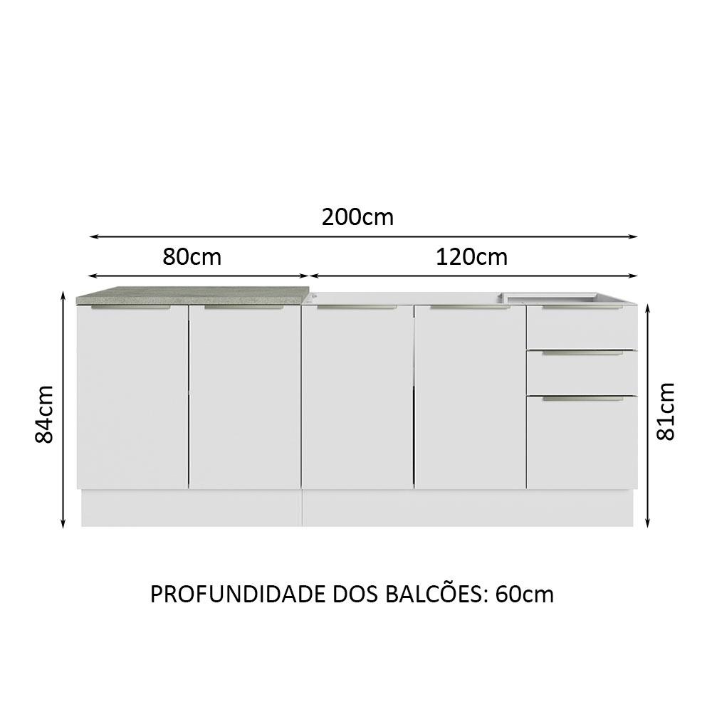 A linha Lux da Madesa se destaca por sua modernidade e sofisticação. Nesta versão, conta com dois balcões espaçosos, que vão auxiliar na organização da sua cozinha.Um dos grandes diferenciais são as portas e frentes das gavetas, que possuem revestimento metálico nas bordas e acabamento em Branco Veludo, uma pintura especial e sofisticada, com toque liso e aveludado.A fabricação é feita com materiais de qualidade, como puxadores em alumínio, corrediças telescópicas nas gavetas e amortecedores para o fechamento suave das portas. Todos estes detalhes trazem mais resistência e prolongam a vida útil do móvel.O balcão maior possui 120 cm de largura, com duas portas e três gavetas. Além disso, possui espaço para colocação de pia de inox ou pedra, na medida de 120 x 60 cm. O outro balcão possui 80 cm de largura, conta com duas portas e o tampo pode ser recortado para instalação de cooktop.É possível combinar estes balcões com outros módulos e com todas as cozinhas da linha Lux da Madesa.O acabamento da estrutura é branco e as portas e frentes das gavetas são em Branco Veludo. É feito em Pintura Poliéster ecológica, com 7 camadas que protegem o móvel dos efeitos do álcool da água e do calor.Medidas totais:- 84 cm de altura- 200 cm de largura- 60 cm de profundidadeItens inclusos:- Um (1) Balcão de 80 cm com duas (2) portas e tampo- Um (1) Balcão de 120 cm com duas (2) portas, três (3) gavetas (Não possui tampo.)Código do produto: GRLX200003H7Obs.:- Imagens meramente ilustrativas, a decoração não acompanha o produto- A Madesa não disponibiliza serviço de montagem- O produto segue com manual e todas as ferragens necessárias para a instalação1 – O produto vem montado? Se não, vocês realizam a montagem?R.: A Madesa não disponibiliza serviço de montagem. Todos os produtos seguem com manual de instalação e as ferragens necessárias. Alguns produtos possuem vídeo explicando o passo a passo da montagem.2 – Vocês possuem loja física? Posso retirar meu produto em mãos?R.: Não possuímos loja física, apenas loja virtual. Confira as opções de envio ao colocar o seu CEP.3 – Qual é o valor do envio? Posso pagar separadamente?R.: O valor do envio é calculado com base no peso e volume do produto, e no CEP de destino. Você pode calcular o valor e prazo de entrega no simulador.4 – A Madesa entrega em todo Brasil? Como é feita a entrega?R.: Sim, entregamos no Brasil inteiro através de transportadoras parceiras.5 – Os produtos possuem garantia?R.: Sim. A Madesa oferece 3 meses de garantia para defeitos de fabricação.A Madesa se dedica à sustentabilidade com várias iniciativas: temos uma usina própria para gerar energia que abastece uma de nossas fábricas. Selecionamos nossos fornecedores, priorizando aqueles que possuem um compromisso com a sustentabilidade e proteção do meio ambiente. Todo o plástico utilizado no setor produtivo é proveniente de reciclagem e as suas sobras são encaminhadas ao fornecedor que os recicla. Também investimos no desenvolvimento contínuo de nossos colaboradores e em ações educacionais que beneficiem a comunidade.